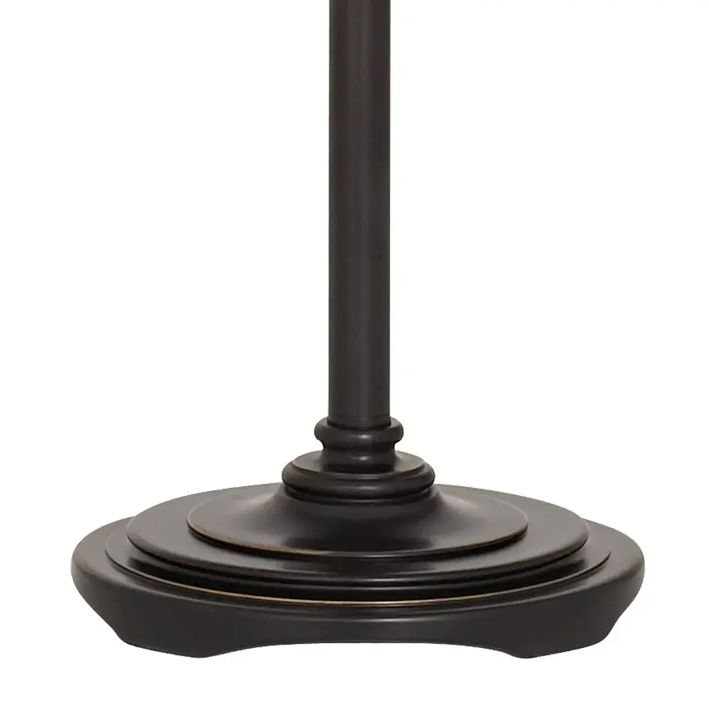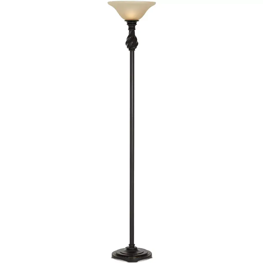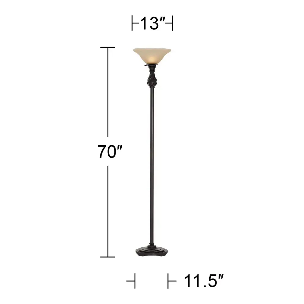 Ideal for general room illumination, this torchiere floor lamp features traditional styling with subtle details like a swirl font. Amber glass up top creates warm lighting. From the Regency Hill brand of traditional lighting, the torchiere comes in a painted restoration bronze finish.