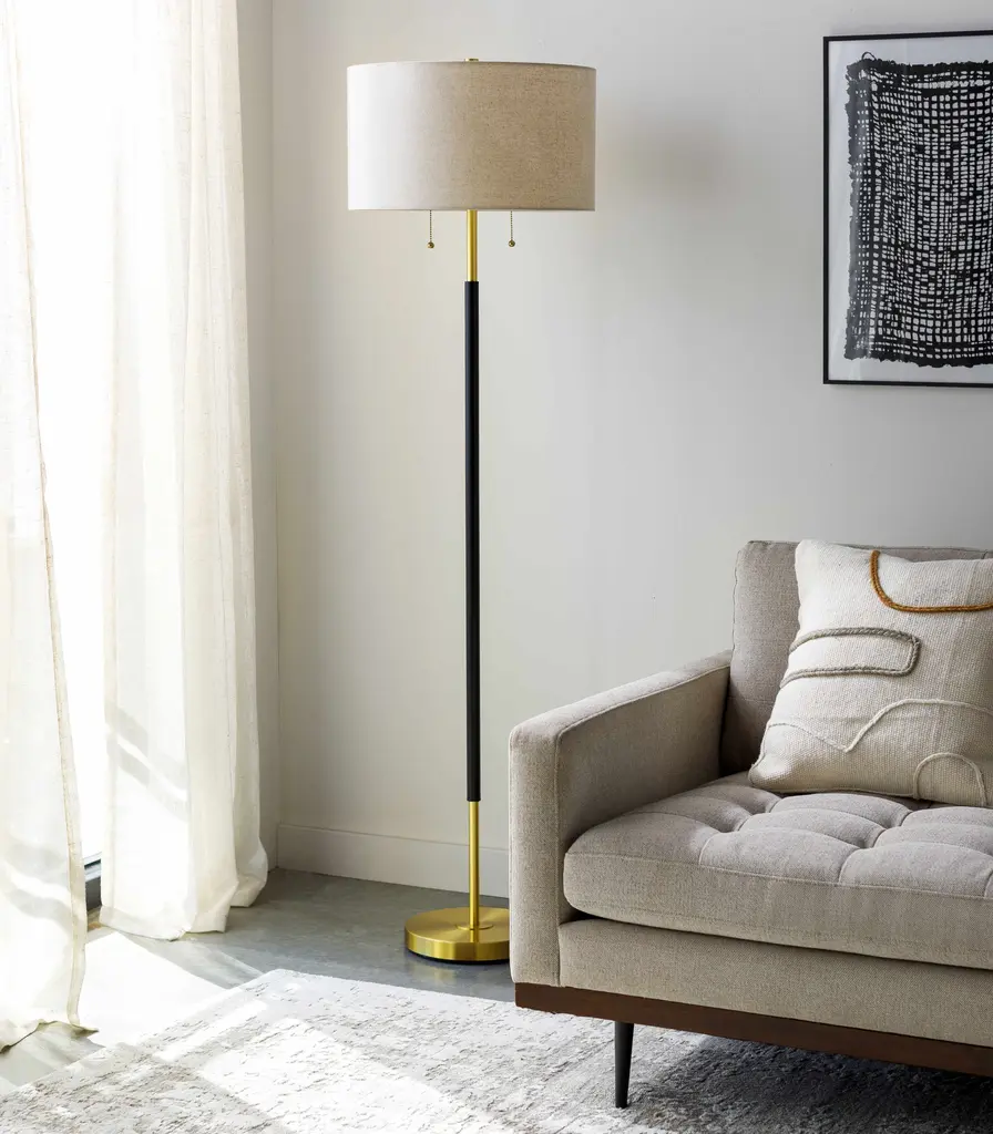 Collection: Remontnoye Colors: Gold Material: Body: Iron,Base: Iron,Shade (Outside): Linen,Shade (Inside): Polyester Styles: Contemporary Made In: China Base: Iron Base Color: Gold Shade Material: LinenPolyester Shade Color: WhiteCream Cord Length: 8' Switch Type: Twin Pull Number of Bulbs: 1 Socket Type: E-26 Bulb Wattage: 100W