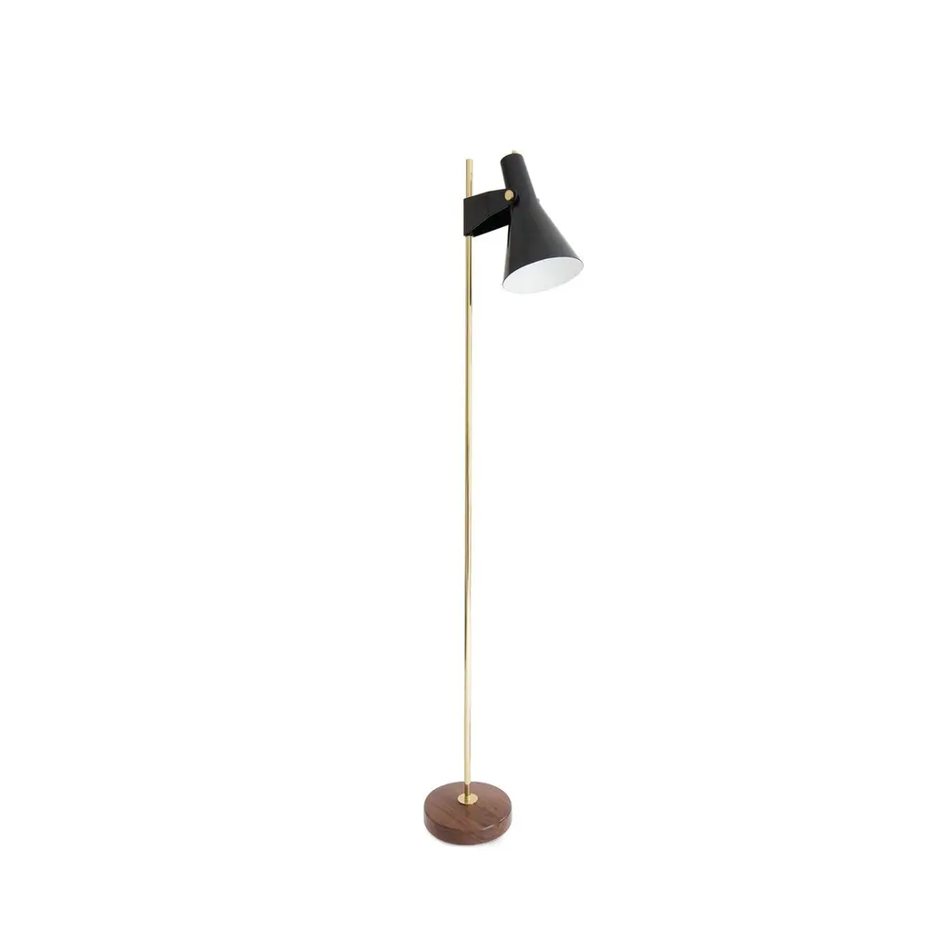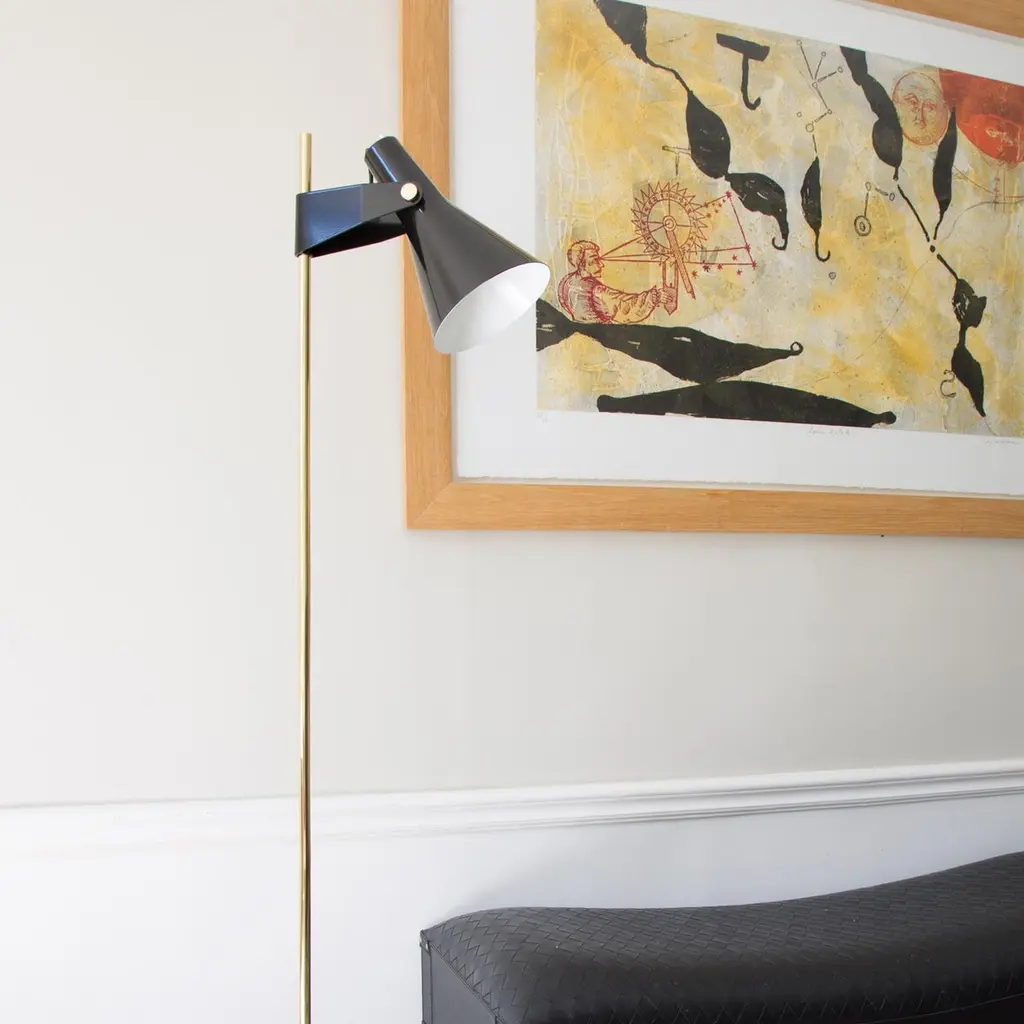René-Jean Caillette B4 floor lamp for Disderot. This large floor lamp was originally designed by Caillette in 1955 as an extension of the wall lamp B3. Made of a thin brass tube and round base in solid wood, the B4 floor lamp is ideal next to a sofa, as a reading lamp or as ambient lighting. This newly produced numbered edition with an authentication certificate is made in France by Disderot with many of the same small-scale manufacturing techniques and craftsmanship as the original run.Price is per item. The B4 floor lamp is available in two sizes and is offered in several finishes to fit a vintage or more contemporary decor: walnut, golden brass, black, and matte black.Born in 1919, Caillette's perfect mastery of cabinetmaking and artistic skills led him to the School of Applied Arts, from where he graduated in 1937 to begin what became a dazzling career. He was a member of the most influential group of designers, won many prestigious prizes and created a number of major pieces of furniture, which are now exhibited in museums throughout the world. He was a lecturer for 25 years and trained some of the best designers of today. The simplicity of his drawings is not that of ascetic minimalism, but the product of an ethic that knows how to combine beauty with the utmost discretion.In-stock lead-time 7-8 weeks. Out of stock can take several weeks more. Availability can change at any time.Not UL listed, but recommended UL listing possible from authorized 3rd party vendor upon request for an additional fee.LED light bulb included (A+ Class), 60W max – E27 – 230V.