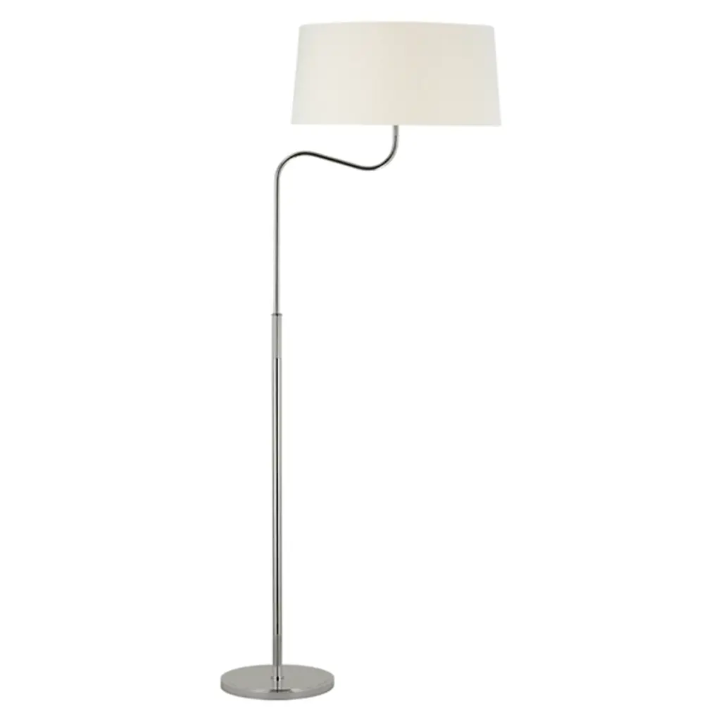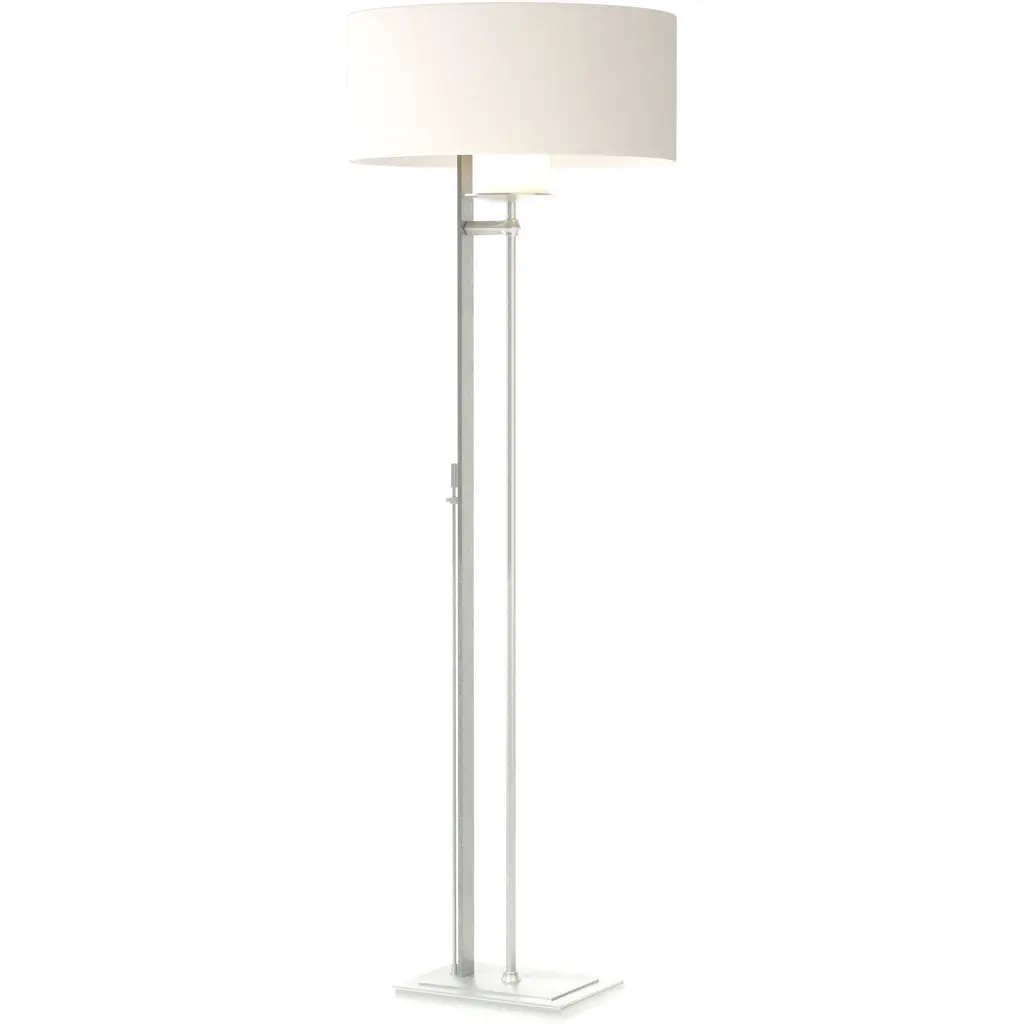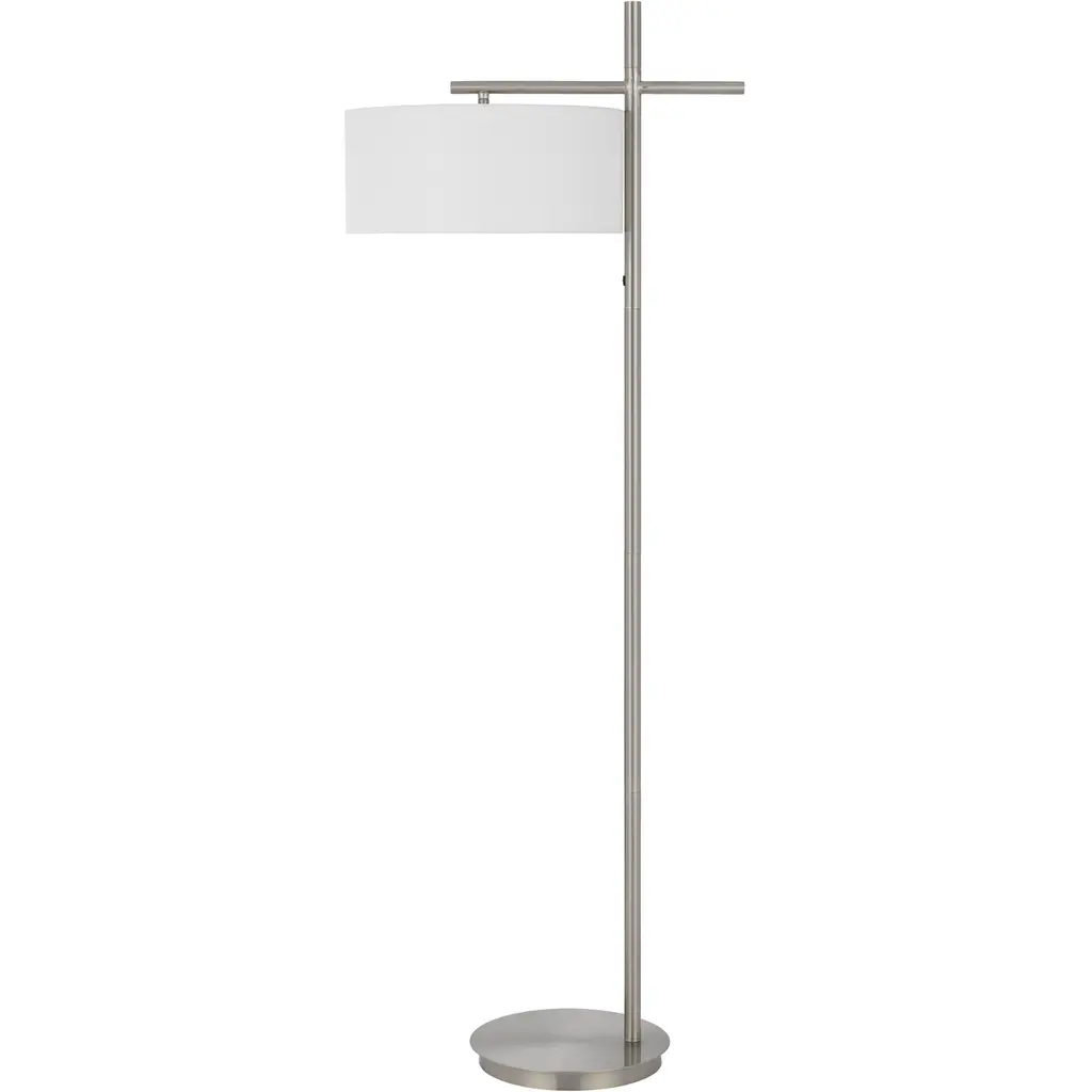 Both decorative and functional, this sculptural floor lamp will create an alluring ambiance in contemporary interiors. Boasting a streamlined and rigorous profile, the piece is crafted of glossy nickel-finished brass and consists of a rectangular base and a slender element drawing the eye to the cylindrical lampshade in white fabric interrupting the rigid geometry of the whole.