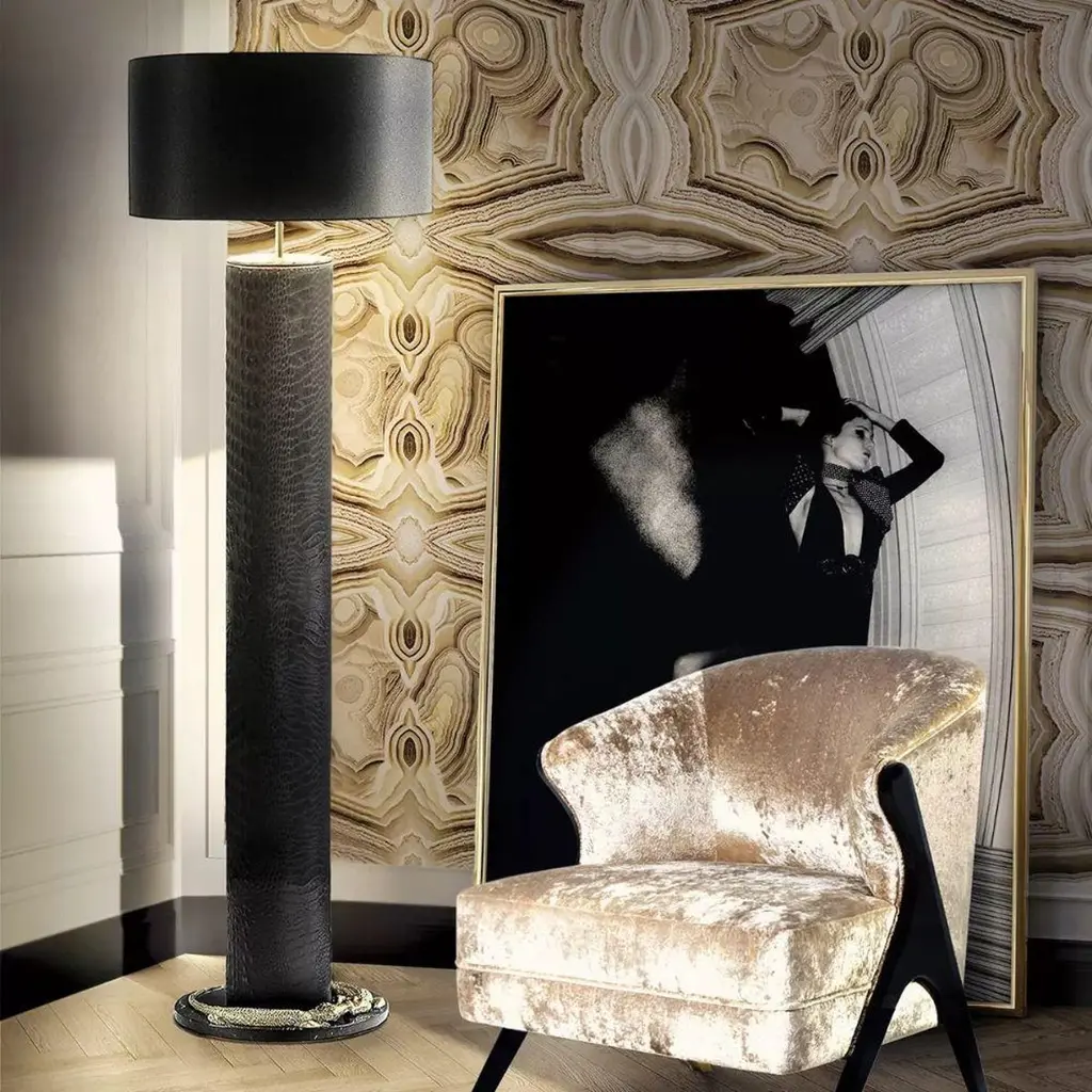 The Reptilian Floor Lamp invites you to take a walk on the wild side, merging exotic sensuality with bold luxury lighting design. Opulent and untamed, this striking floor lamp features a cylindrical body wrapped in black crocodile-print leather, creating irresistible texture and depth. At its base, two hand-carved crocodiles—silent, seductive guardians—curve protectively around the dramatic slab of Nero Marquina marble, adding a touch of primal elegance.Shown with Polished Brass detailing and crowned with a Satina Lux Black shade from the KOKET Textiles collection, the lamp emits a soft, sultry glow that transforms any room into a den of allure. Perfect for living rooms, lounges, bedrooms, or the most daring interiors, the Reptilian Floor Lamp is a provocative statement piece available in additional finish options upon request.