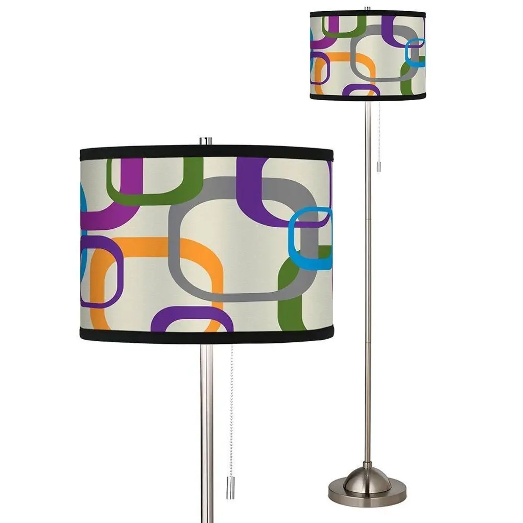PRODUCT DETAILS: Overall: 62" high. Shade is 13 1/2" wide x 10" high. Base is 10" wide x 1 1/4" high. Takes one maximum 100 watt bulb (not included). Floor lamp with pull chain. Custom printed translucent shade with Retro Square Scramble pattern. Brushed nickel finish. DESCRIPTION: Give your decor a contemporary lift with this giclee shade floor lamp. The shade is printed by the same technique used in reproducing museum-quality artwork. The base features a cool, brushed nickel finish.