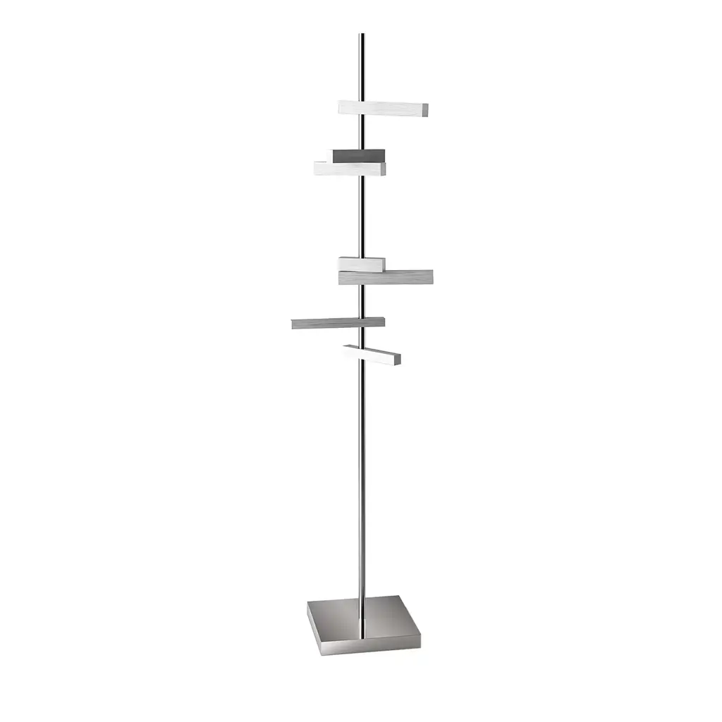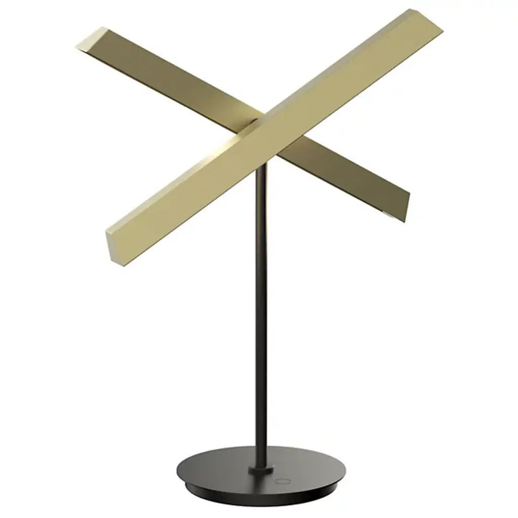 Retta is an Italian handmade floor lamp inspired by the shape of two bamboo canes, made in metal and available in satin light brass. The light sources are two: one is located on the top of the vertical cane, while another is on the end of the shorter cane. The shorter cane can rotate around its horizontal axis to be used as a spotlight for reading.