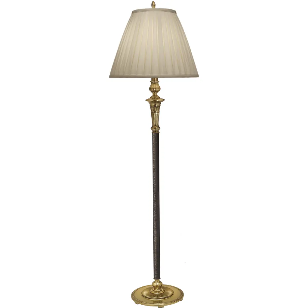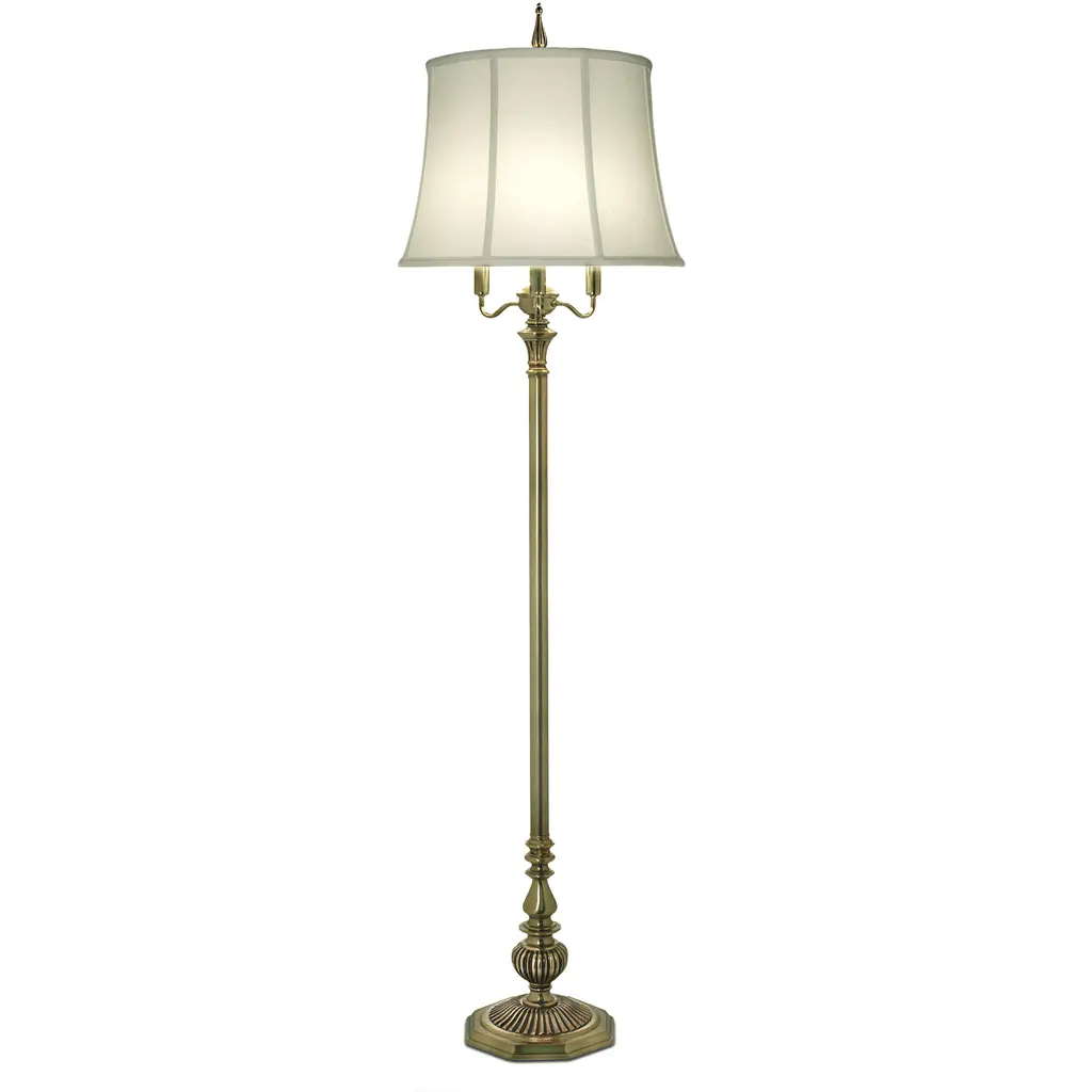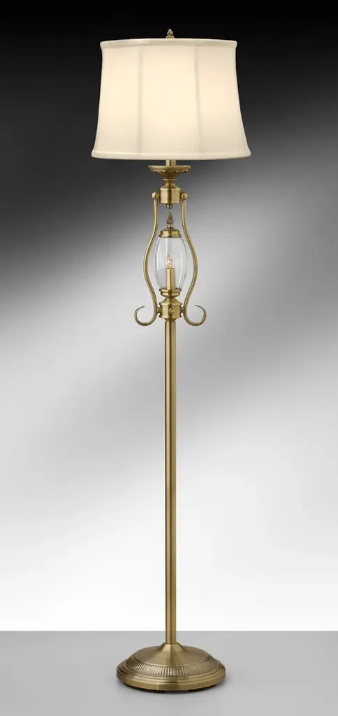 Standard Lamp Specifications for #A1789:Product Type: Floor LampHeight: 59"Finish: Satin Antique BrassConstruction: Steel/GlassSocket: (1) Phenolic On/Off Med. Base Type A 100W Max socket(s).Nightlight or Auxiliary Socket(s): (1) On/Off Type B 7W Max socket(s).Switching: (1) 3-way turn knob switch(es) located on the center husk.Cord: 8'' (from base) long clear gold SPT-2 cord set with a 2 prong polarized plug.Nightlight or Auxiliary Switching: Controlled by Socket Switch.Harp Size: 8 inchesStandard Packing: 1 per carton.Lamps & Shades per SKU: 1Lamping: (1) Phenolic On/Off Med. Base Type A 100W Max socket(s).Shade Size and Description: Hand sewn bell shaped eggshell stretched silk drum shade with self fold trim measuring 12" x 14" x 10" w/ .5" drop (Top x Bottom x Slant).Bulb Included: NoMaterial Description: constructed from polished, plated, and lacquered steel.