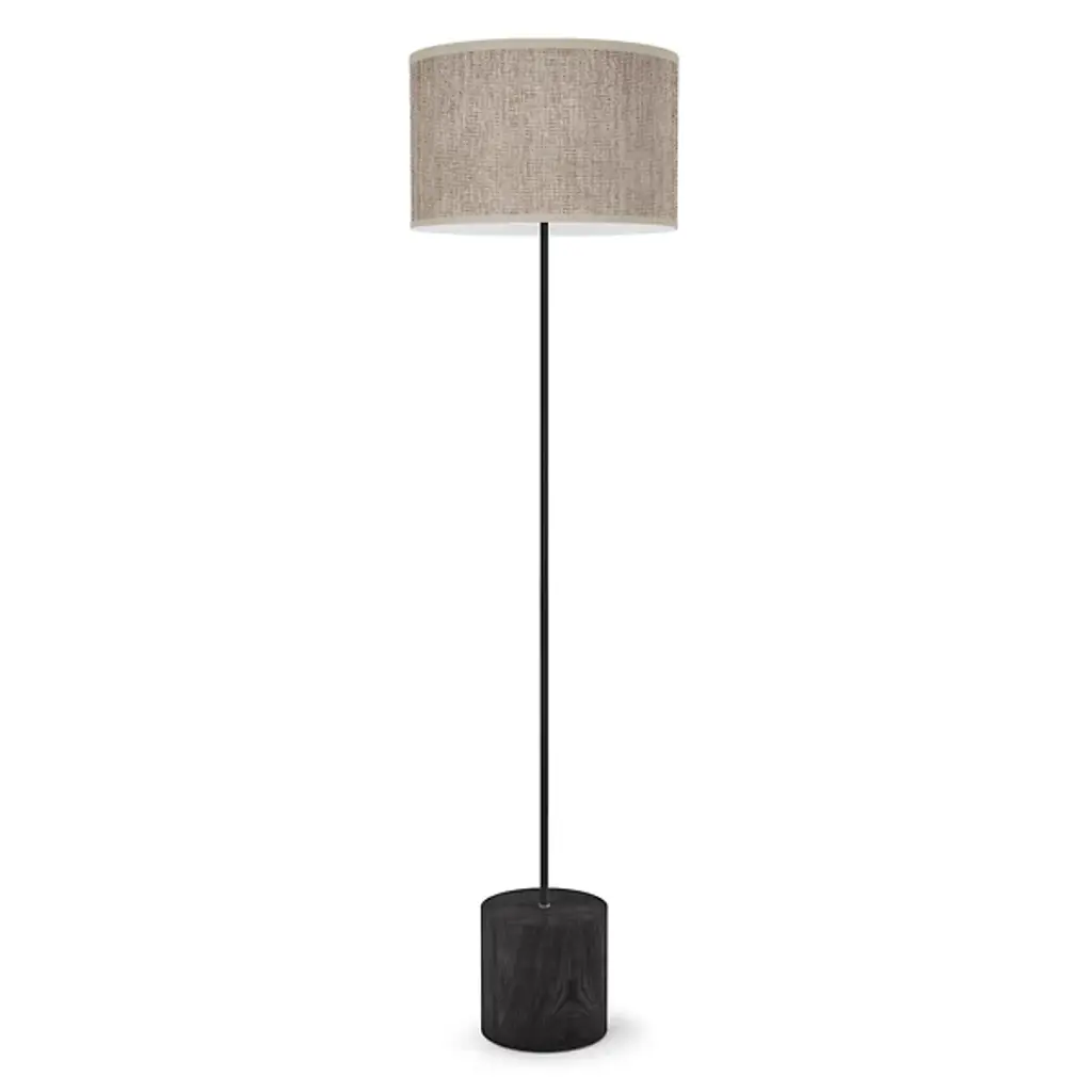 The Revin Floor Lamp from Seascape Lamps represents contemporary design and timeless elegance. This floor lamp features a cylindrical shade paired with a streamlined wooden veneer frame, finding a balance between form and function. Revin adds artistic flair to your space. Its linen shade complements the wooden veneer frame seamlessly, creating a unified visual appearance. With its durable base and efficient LED lighting, this lamp boasts quality craftsmanship and practicality. This floor lamp is well-placed behind the sofas.