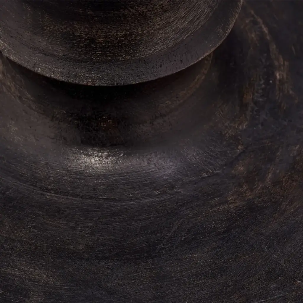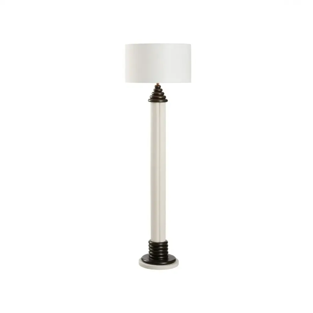 A rich black finish adds drama to the mango wood body and finial of this architecturally appealing floor lamp. Its bold carvings and beveled, circular base contrast strikingly with a scalloped shade in natural linen. Place it next to a couch or an overstuffed chair to instantly modernize any casual interior.