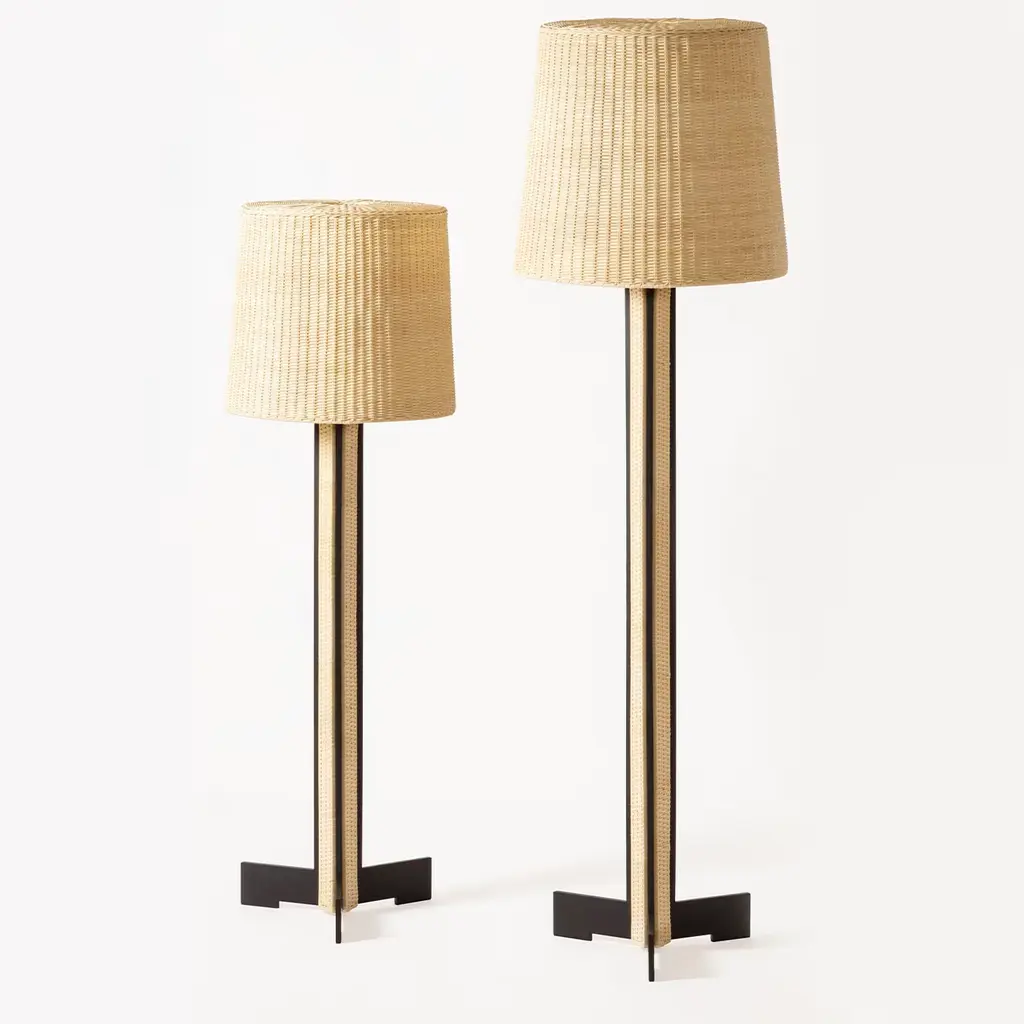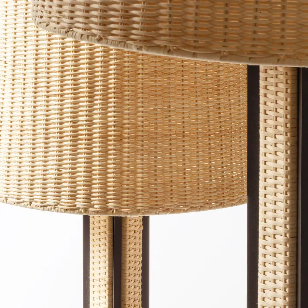 This tall floor lamp exudes both charm and sophistication. It belongs to a collection that breathes new life into tradition, infusing it with a contemporary aesthetic that seamlessly blends clean lines with intricate detailing. Adorned with decorative woven rattan inserts along the stem and complemented by an elegant lampshade, this piece illuminates spaces with a captivating glow while adding visual intrigue.