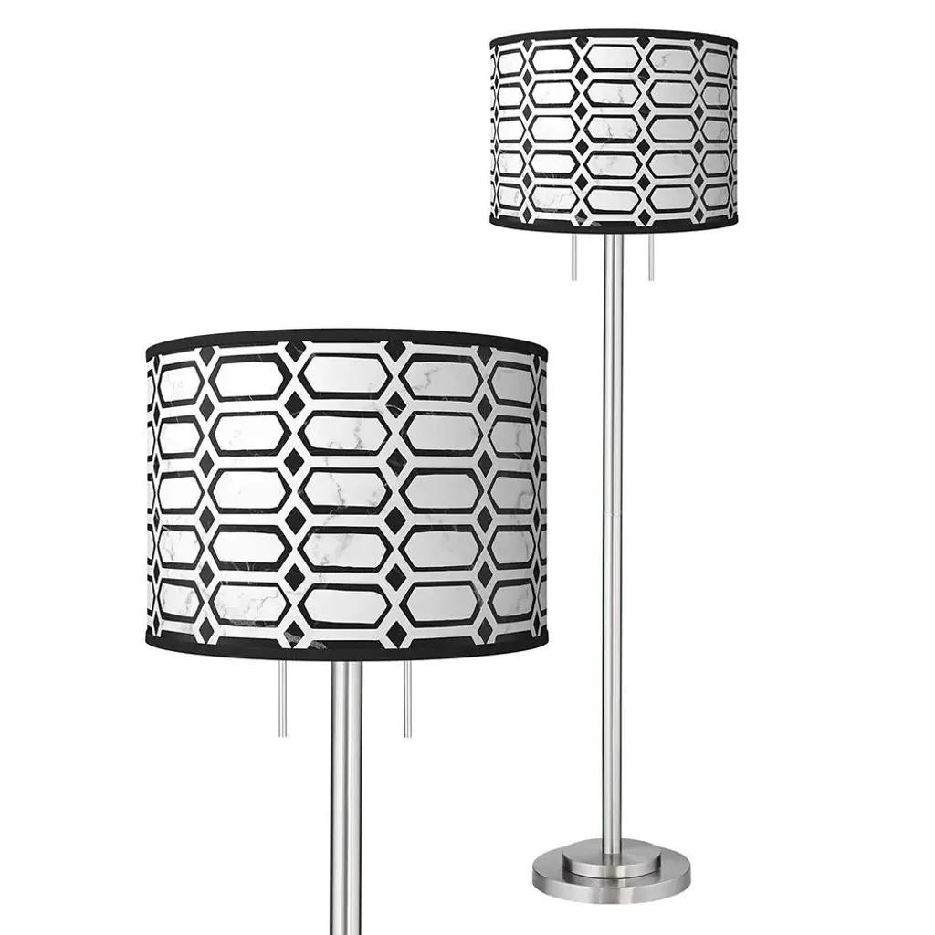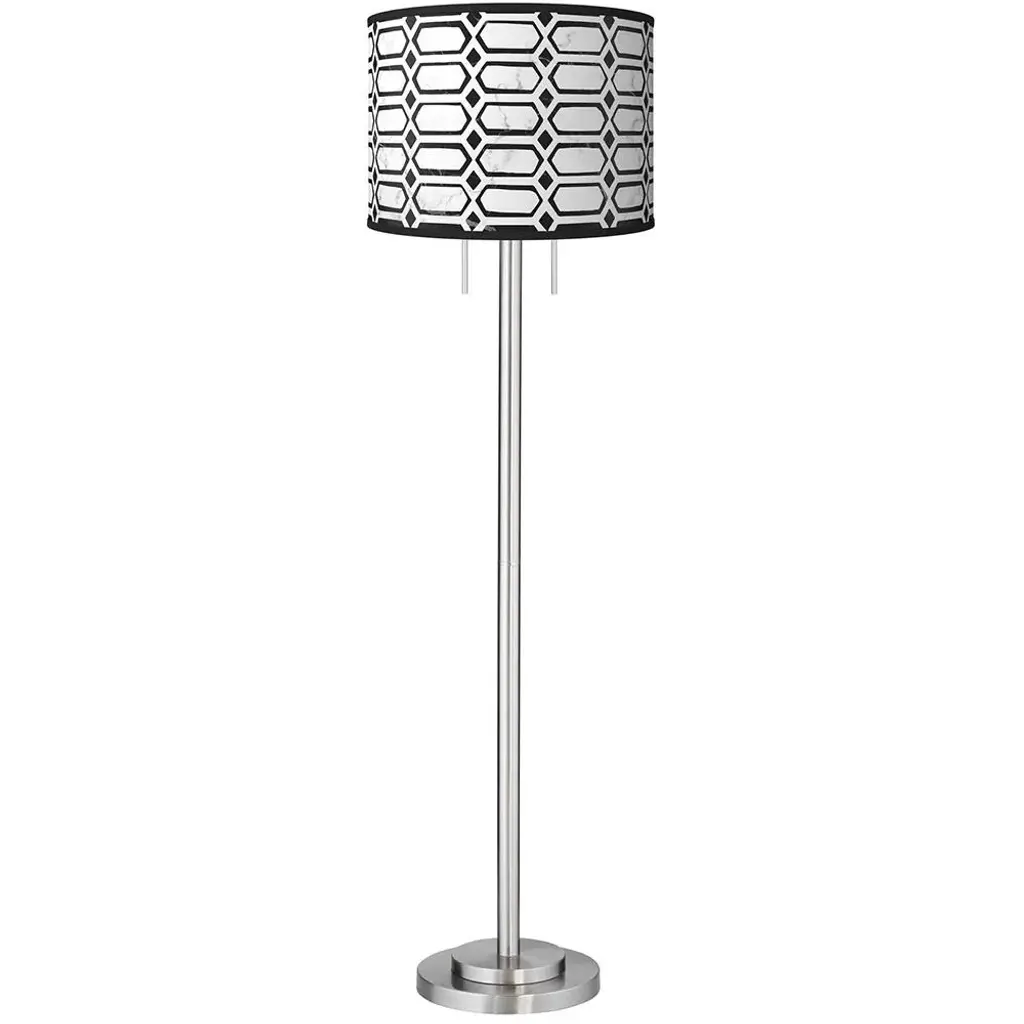PRODUCT DETAILS: Overall: 63" high. Shade is 18" wide x 12 3/4" high. Base is 12" wide. Takes two maximum 100 watt bulbs (not included). Pull chain switches. Sleek contemporary floor lamp. Custom made-to-order drum shade with Rhombi giclee printed pattern. Brushed nickel finish over metal construction. DESCRIPTION: The Garth brushed nickel finish floor lamp takes a simple base design and pairs it with a striking printed drum shade for a burst of style. The shade design is custom made-to-order and features an exclusive Rhombi pattern.