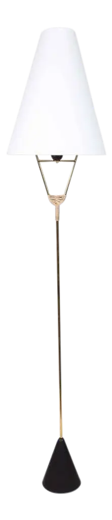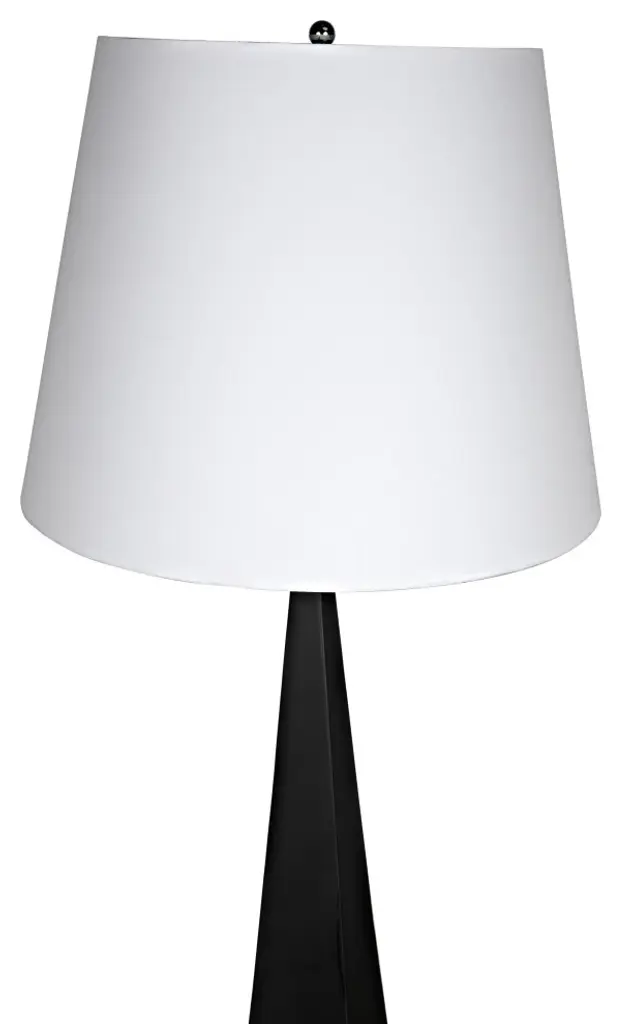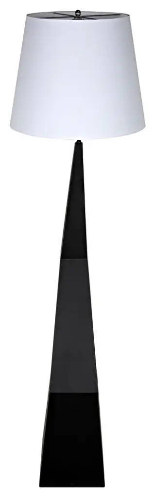 The Rhombus floor lamp features stacked geometric forms that create a striking angular effect. The base is formed of matte black steel and is topped with a white silk tapered drum shade. With their stark lines and monochromatic palette, they offer an unexpected choice in lighting, full of movement and presence.