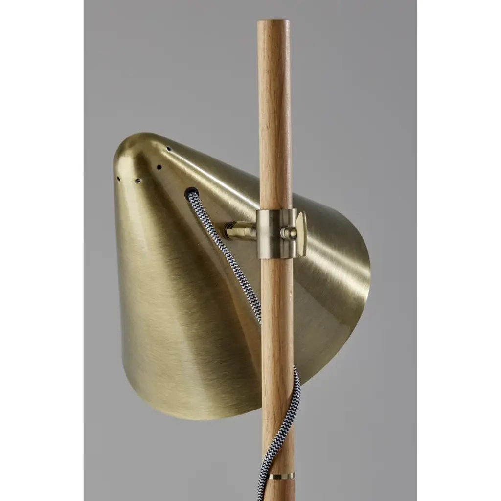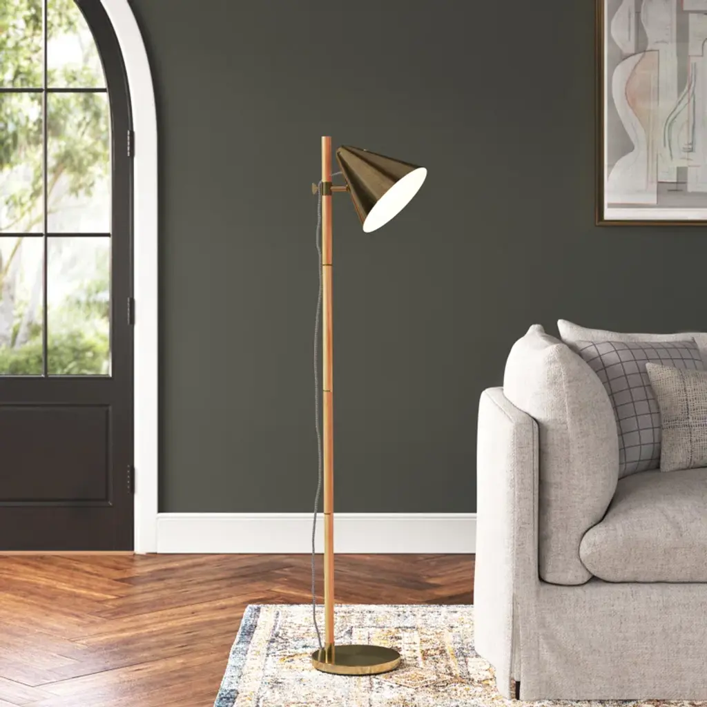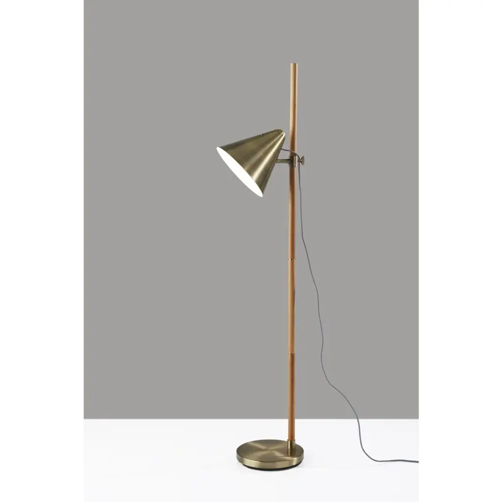 This clean, retro-inspired design of this floor lamp adds vintage-inspired charm to your space. The round base has an antique brass finish with a matching metal cone-shaped shade, plus a contrasting engineered stand to highlight the mid-century look. Plus, the shade adjusts up and down the pole, so you can set the shade at just the right height for all sorts of different tasks. Operated by a touch switch located on the shade, this floor lamp powers a 60W bulb and features a 10' black and white fabric-covered cord.
