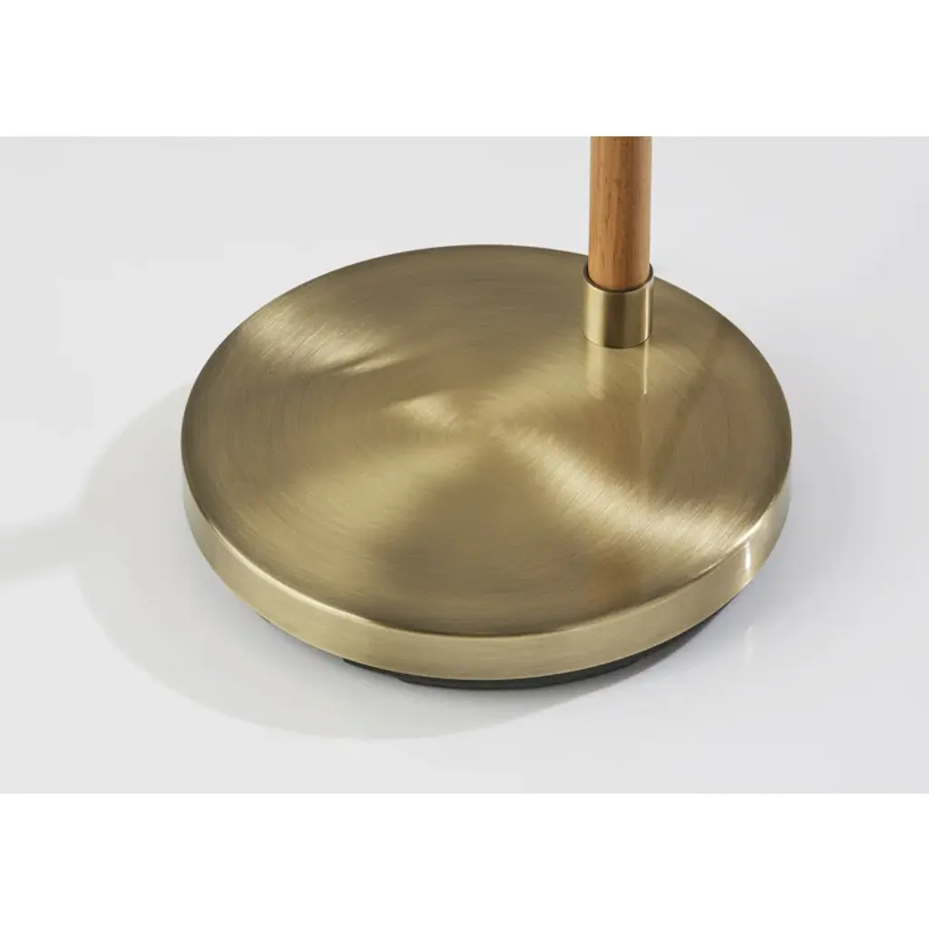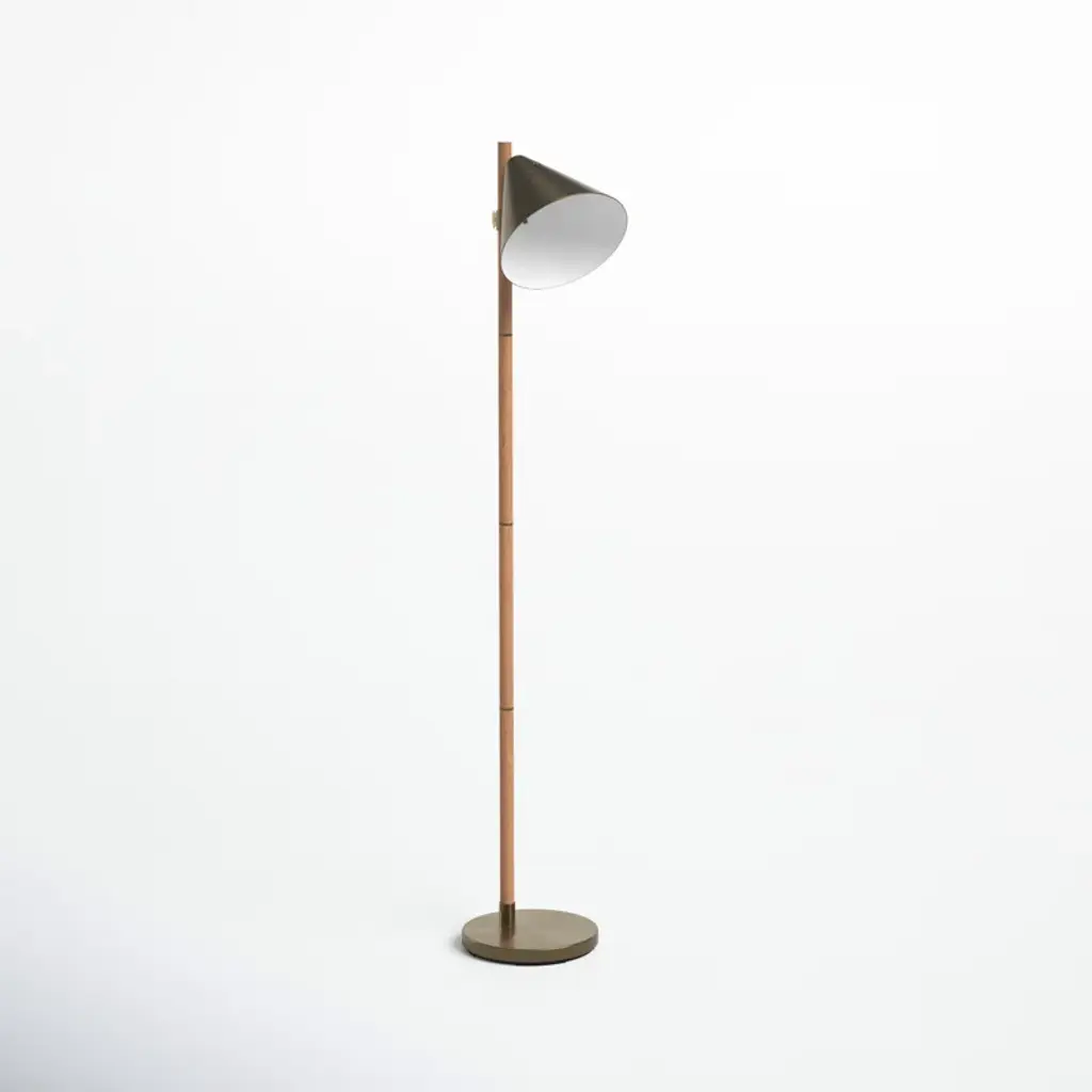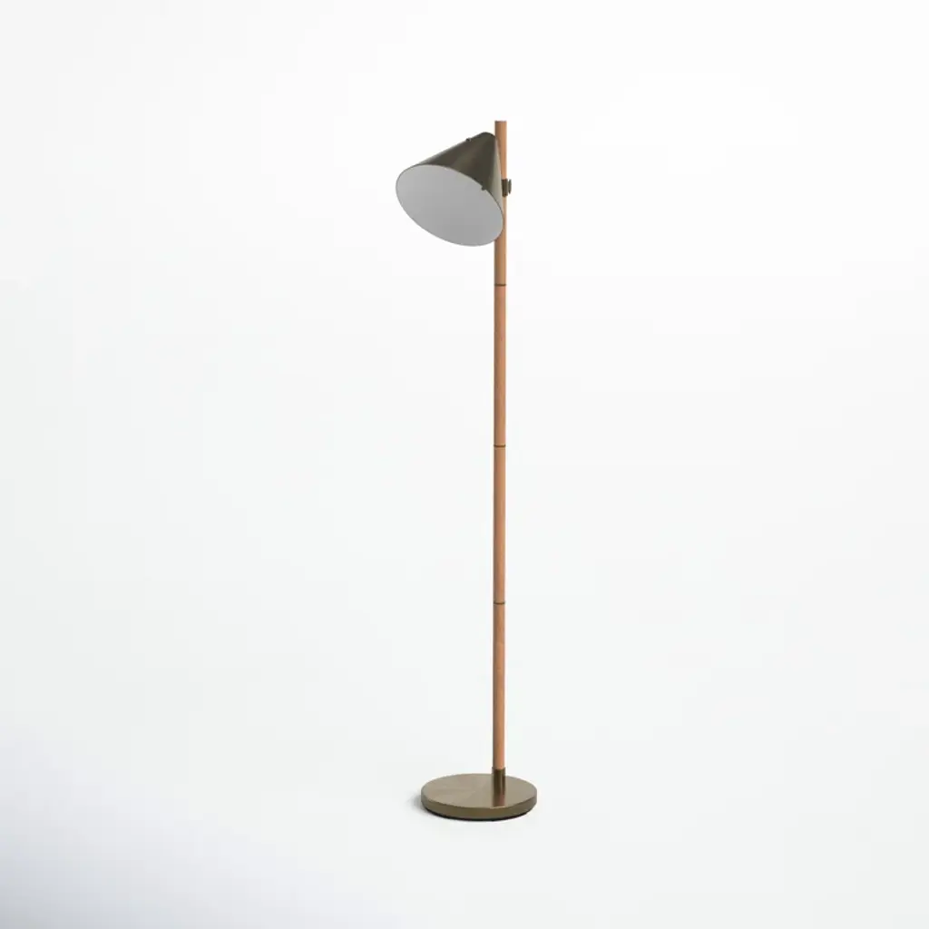 This clean, retro-inspired design of this floor lamp adds vintage-inspired charm to your space. The round base has an antique brass finish with a matching metal cone-shaped shade, plus a contrasting engineered stand to highlight the mid-century look. Plus, the shade adjusts up and down the pole, so you can set the shade at just the right height for all sorts of different tasks. Operated by a touch switch located on the shade, this floor lamp powers a 60W bulb and features a 10' black and white fabric-covered cord.