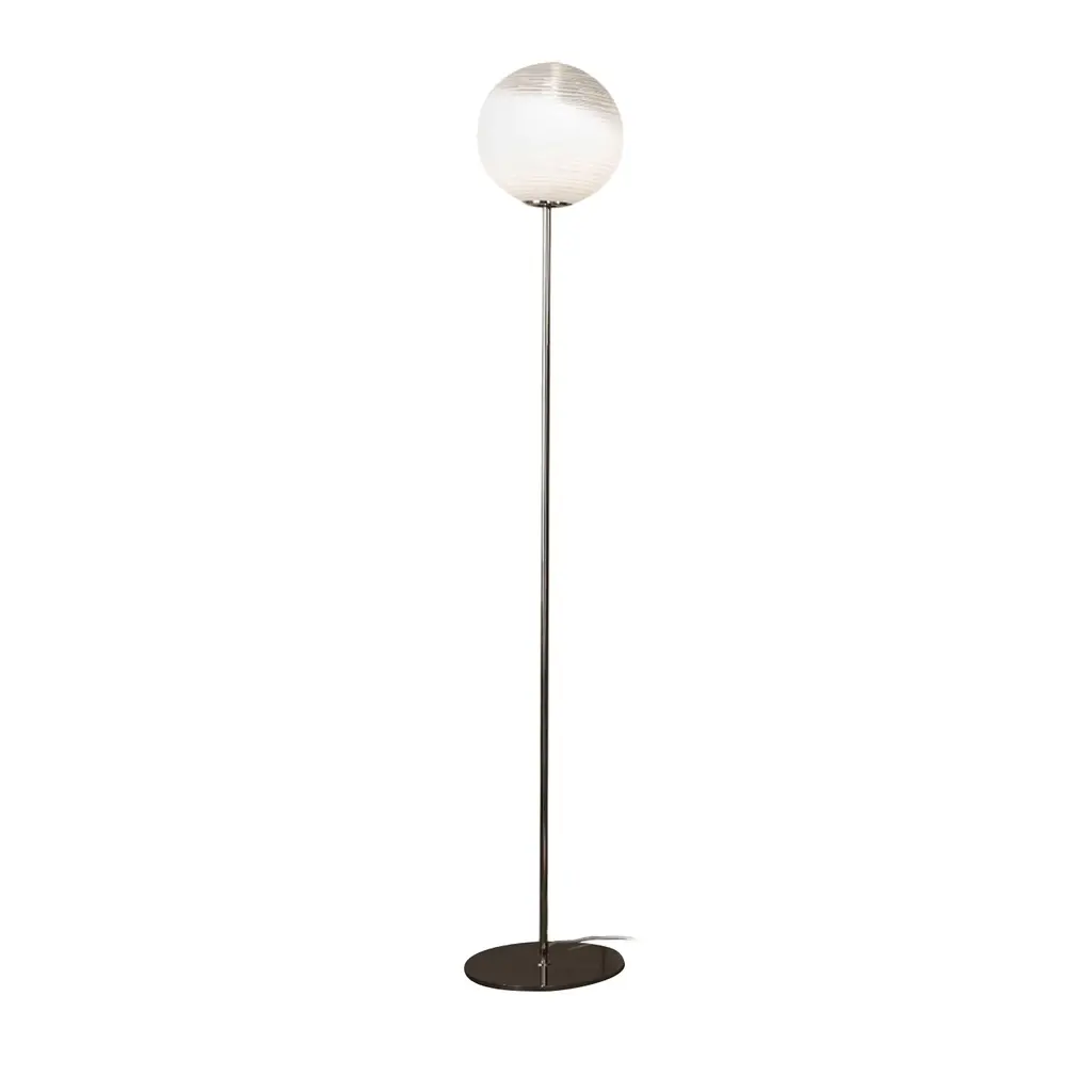 Add the graceful language of poetry to your home with the Rituals XL Floor Lamp from Foscarini. A beautiful example of modern design prowess, this welcoming piece was designed by Ludovica and Roberto Palomba. A satin blown glass shade rests atop a thin body and base made of varnished metal. Etched lines run the length of the shade, adding a dynamic edge and visual intrigue as the single bulb sends out a warm and inviting layer of light.