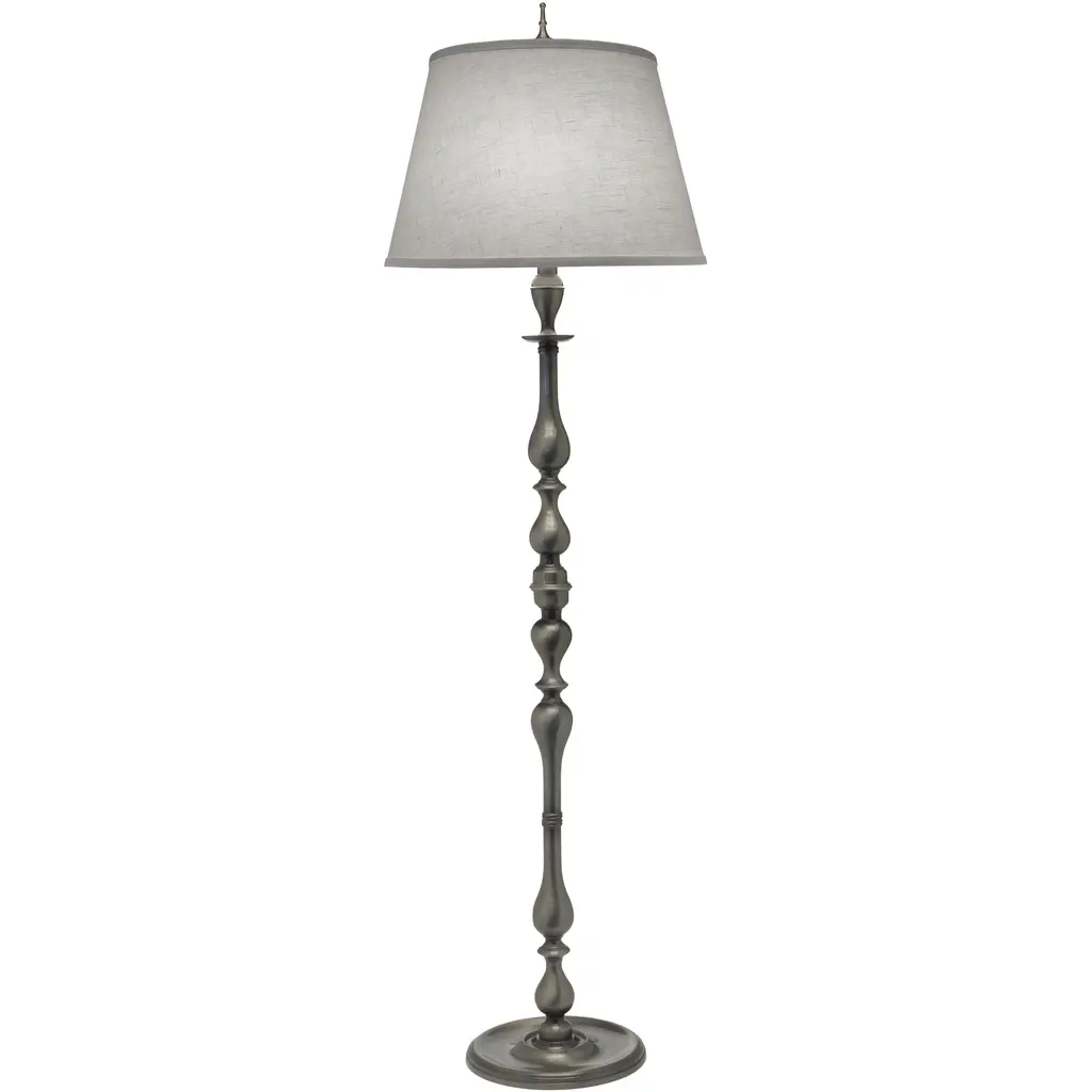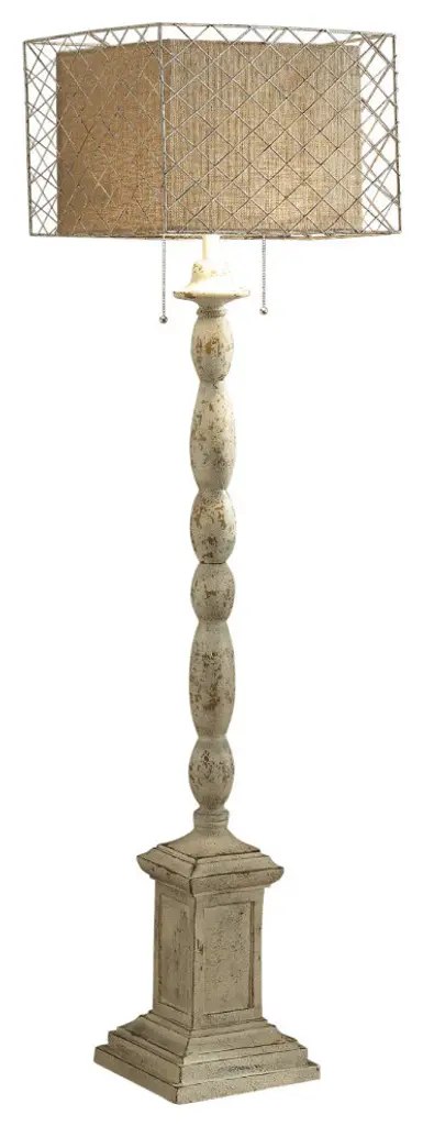 The elegant, elongated traditional floor lamp creates a fresh take on classic lighting. With its rusted stone finish, and hand-finished details lends a rustic farmhouse feel. The burlap and metal mesh shade is the perfect touch to accent the pretty base. This floor lamp will add dimension to your room and light up your space in style.