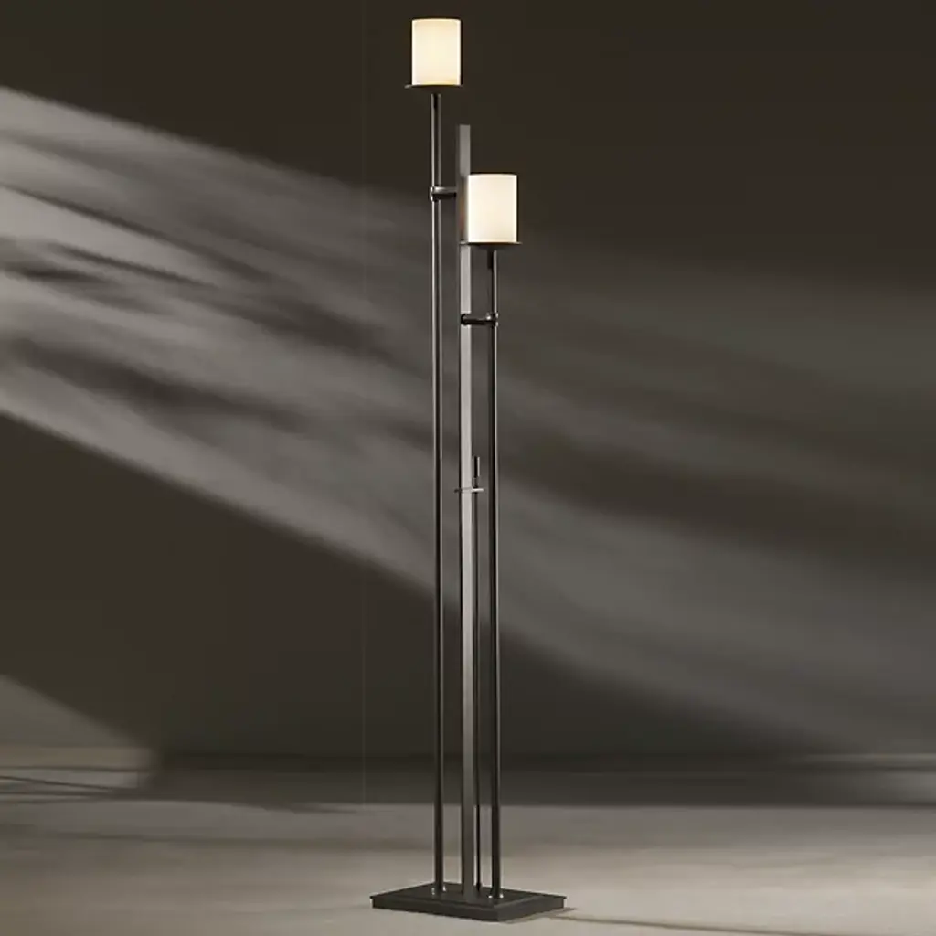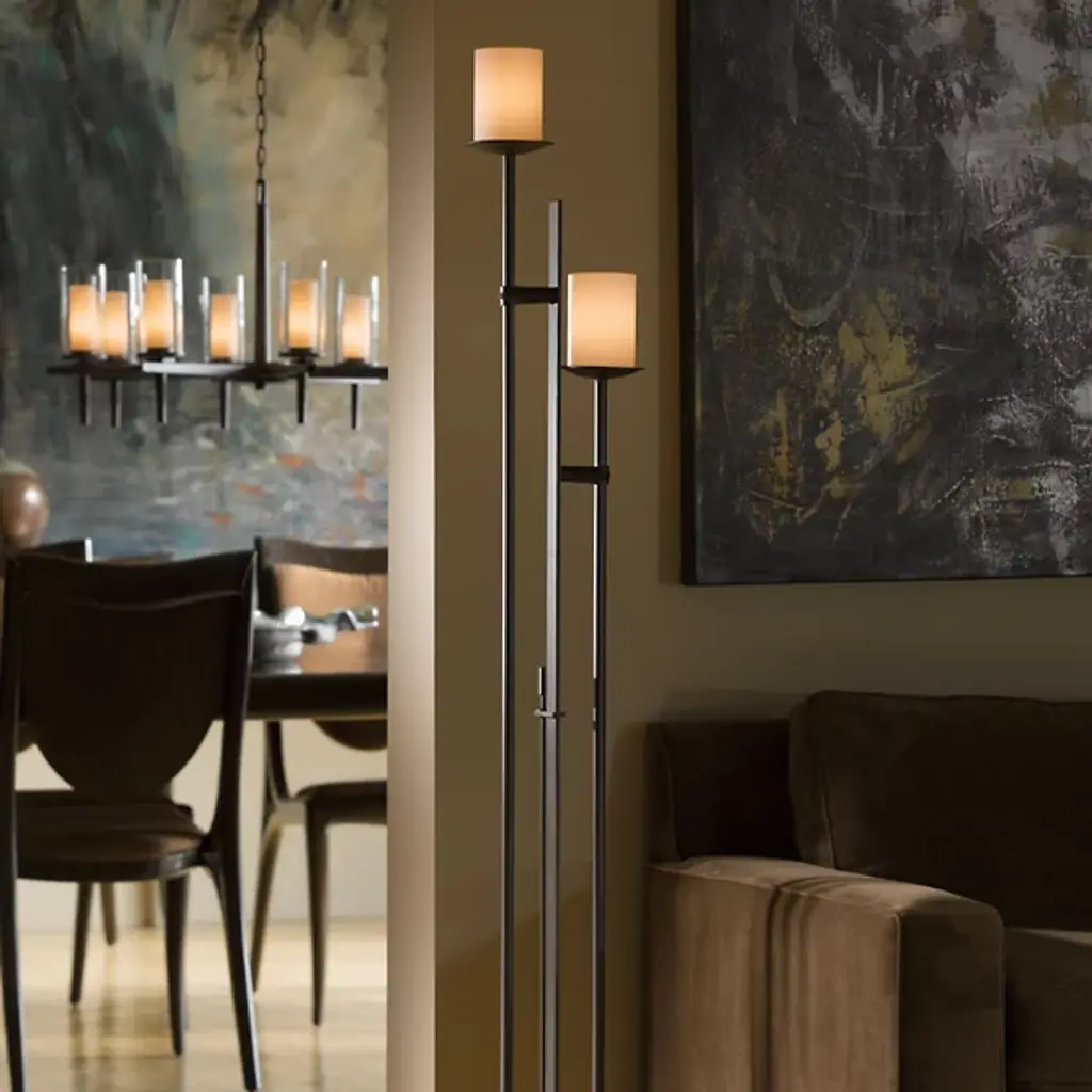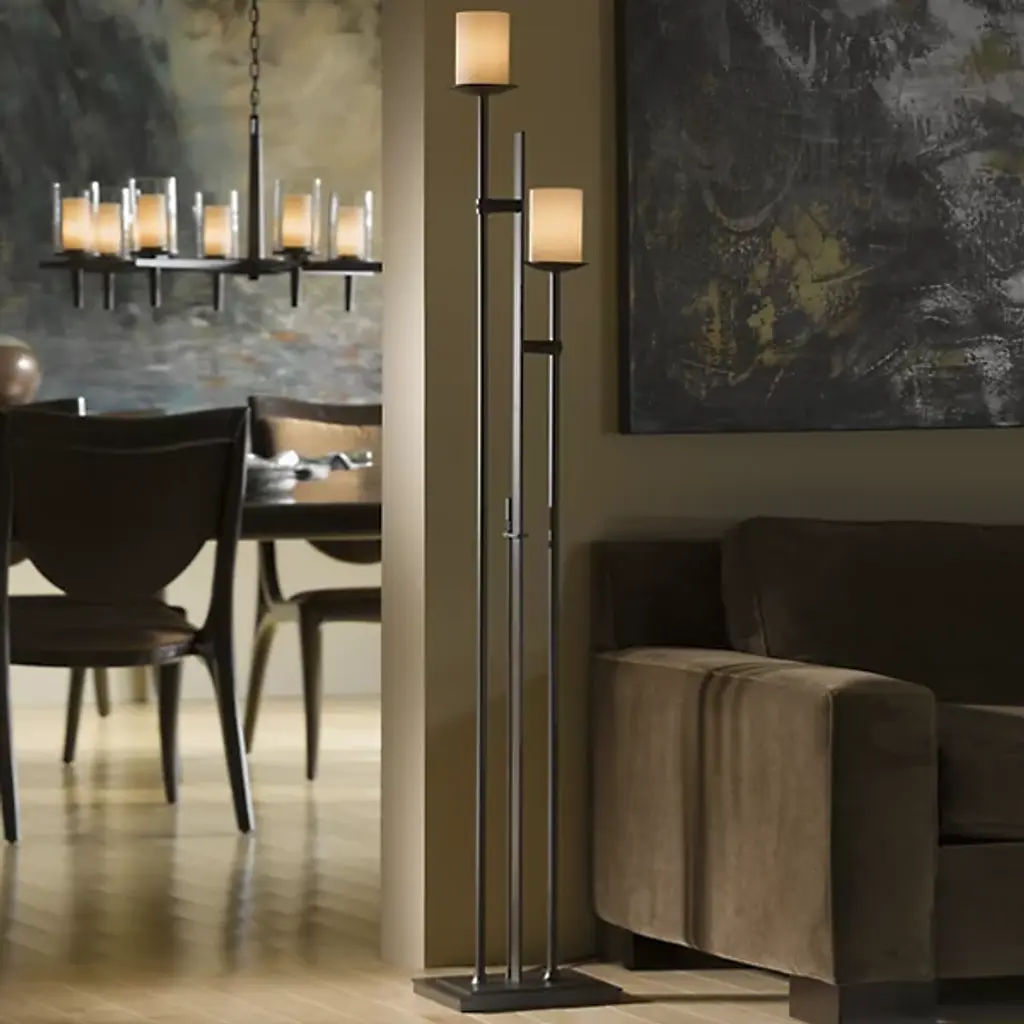 Adding warm illumination, regal beauty and plenty of strength to your room with the steadfast nature of rooks on a chess board. Like candles atop hand-forged wrought iron stems, the Rook 2-Light Floor Lamp by Hubbardton Forge glows with warmth and creates a sense of strength and romance. Adjust the light output via the turn knob dimmer along the stem, which is made of Hand Forged Wrought Iron and holds a pair of cylindrical Glass shades.