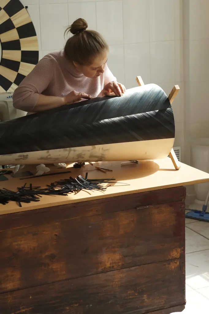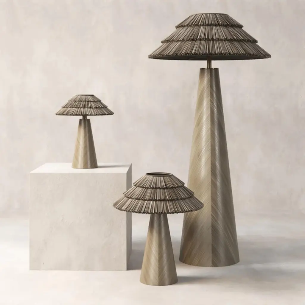 Roots Of Home Floor Lamp by Ruda StudioDimensions: W 80 x H 150 cm.Materials: recycled plastic base, straw inlay, metal lampshade, homespun canvas, straw.Weight: 10 kg. All our lamps can be wired according to each country. If sold to the USA it will be wired for the USA for instance. Available in different sizes and colors. Please contact us.Due to the war, many Ukrainians lost their homes and had to establishtemporary residences. The Roots of Home collection bears an associativeresemblance to an ancient Ukrainian hut, where the lampshade mimics a roof with terracing made of straw or shingles covered in the 'tyruvannia' technique.Design brand RUDA Studio was founded in 2017 by Oleksandra Rudenko and Yuriy Vovnyanko. RUDA Studio - Ukrainian artisanal atelier with harvest of Fine Craft Design.In the atelier we create unique household items. The studio seeks to make each project individual and special, focusing on feelings, custom items, and the combination of the historical and the modern. Our creations are inspired by natural materials and ancient craft techniques. Each product has its own function, but is more like an object of art that touchesthe soul. The vision of interior items encourages us to preserve and actualize our cultural heritage. In our works, we restore knowledge about Ukrainian folklore, pay attention to socially important topics and focus on the interaction between humans and nature. In the studio, objects are created from local materials - brass, copper, clay, straw, algae, trees, andstone.