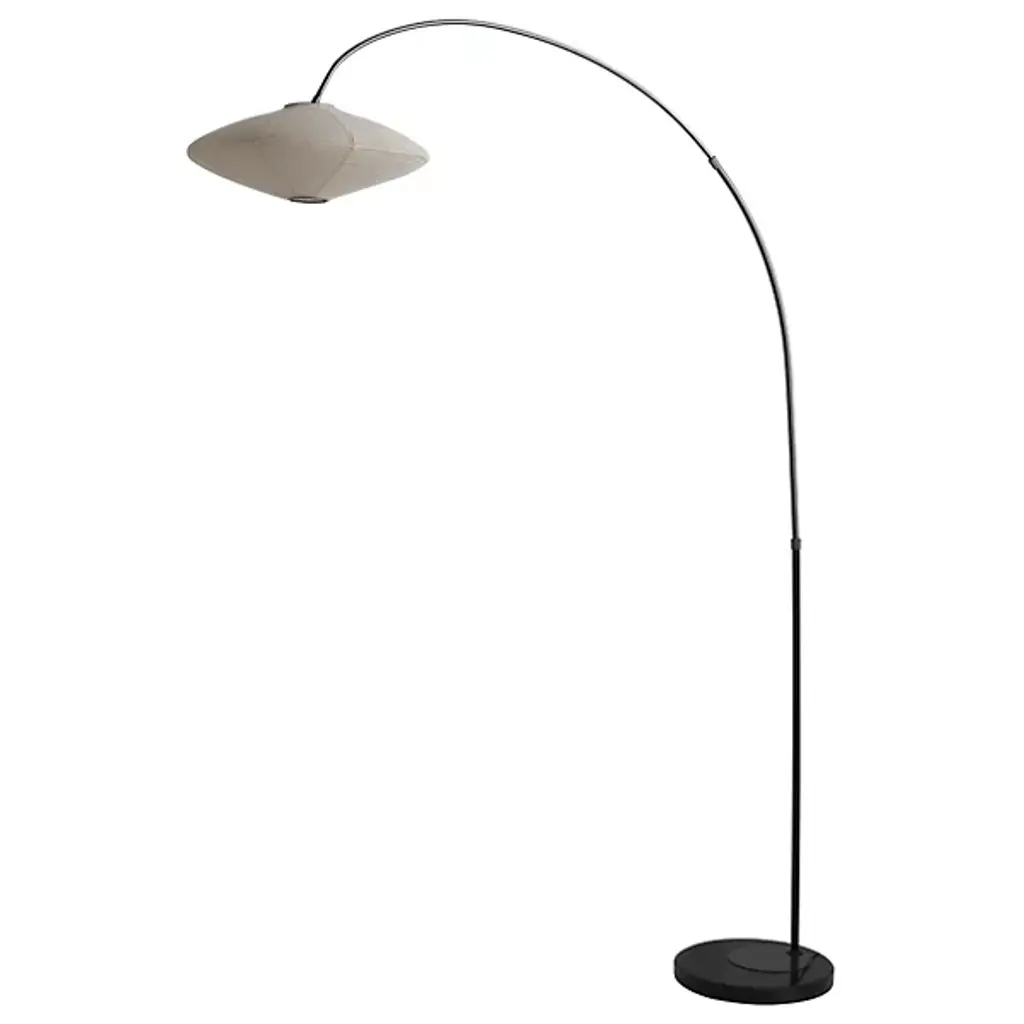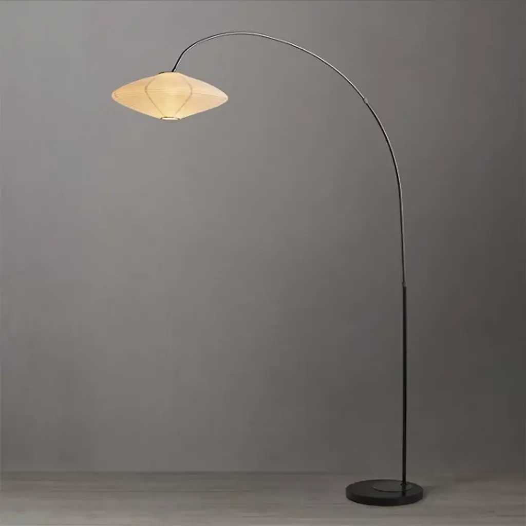 The Roswell Arc Floor Lamp from Nova of California, designed by Herve Saintonge, features a Japanese lantern-inspired shade floating gracefully from a curved stem. Unlike traditional paper versions, the durable white linen shade resists wrinkling and perforation. A black marble base provides stable support for the arching design. The lamp integrates seamlessly with smart home systems and includes dimming capabilities for perfect light control. Its distinctive profile and practical functionality make it ideal for positioning over seating areas or reading spaces.