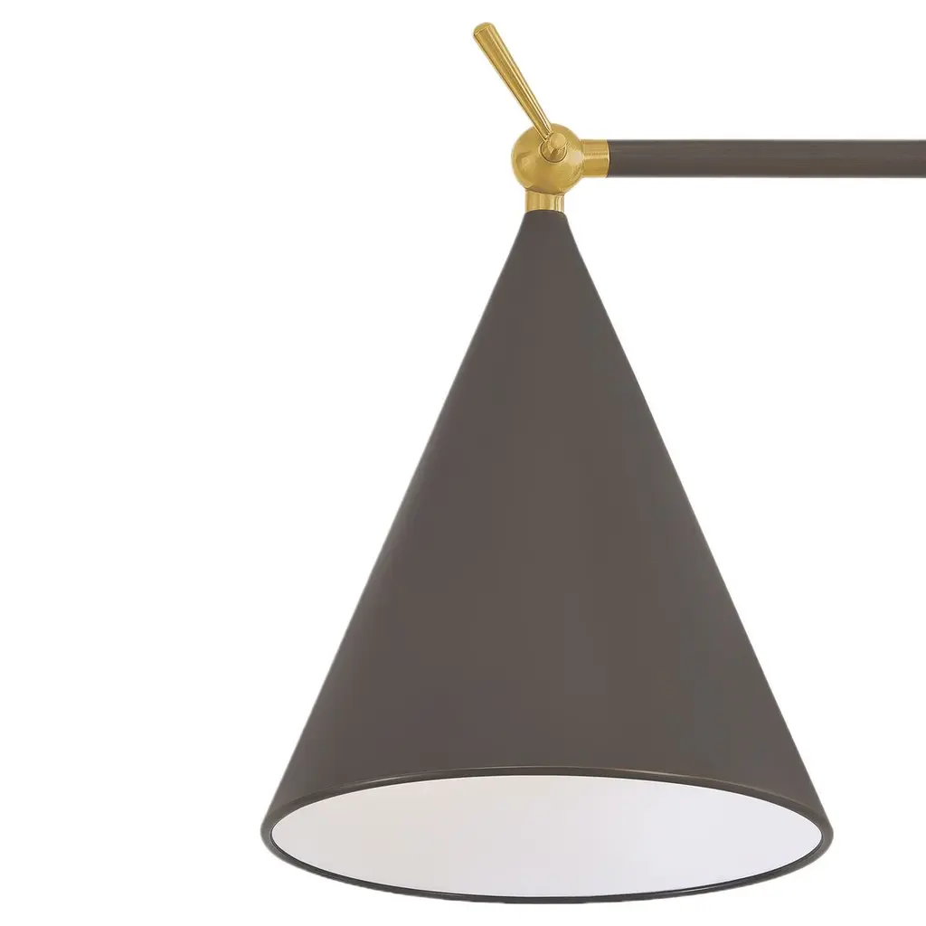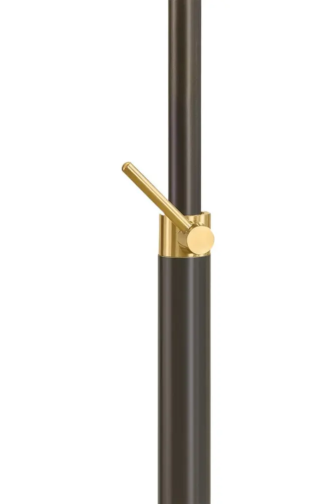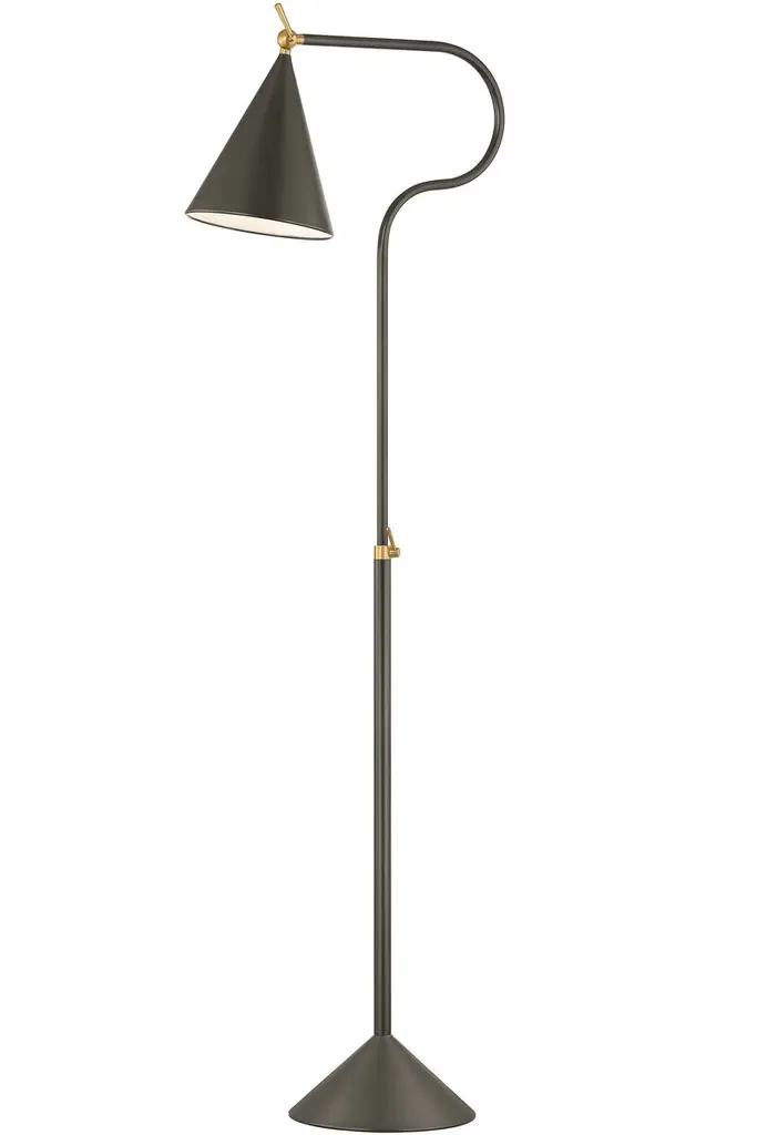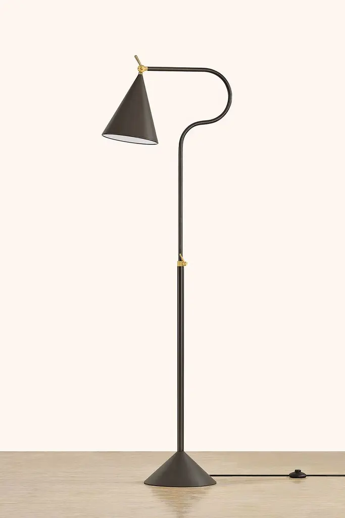 Rouen deftly combines primary geometric shapes with mixed metals to create an adaptable modern floor lamp. The swooping turns of the lamp’s telescoping neck connect to conical forms on either end, contrasting sinuous lines with sharp angles. Small clutch swivels located at the middle of the neck and head allow you to customize the height and direction as needed.