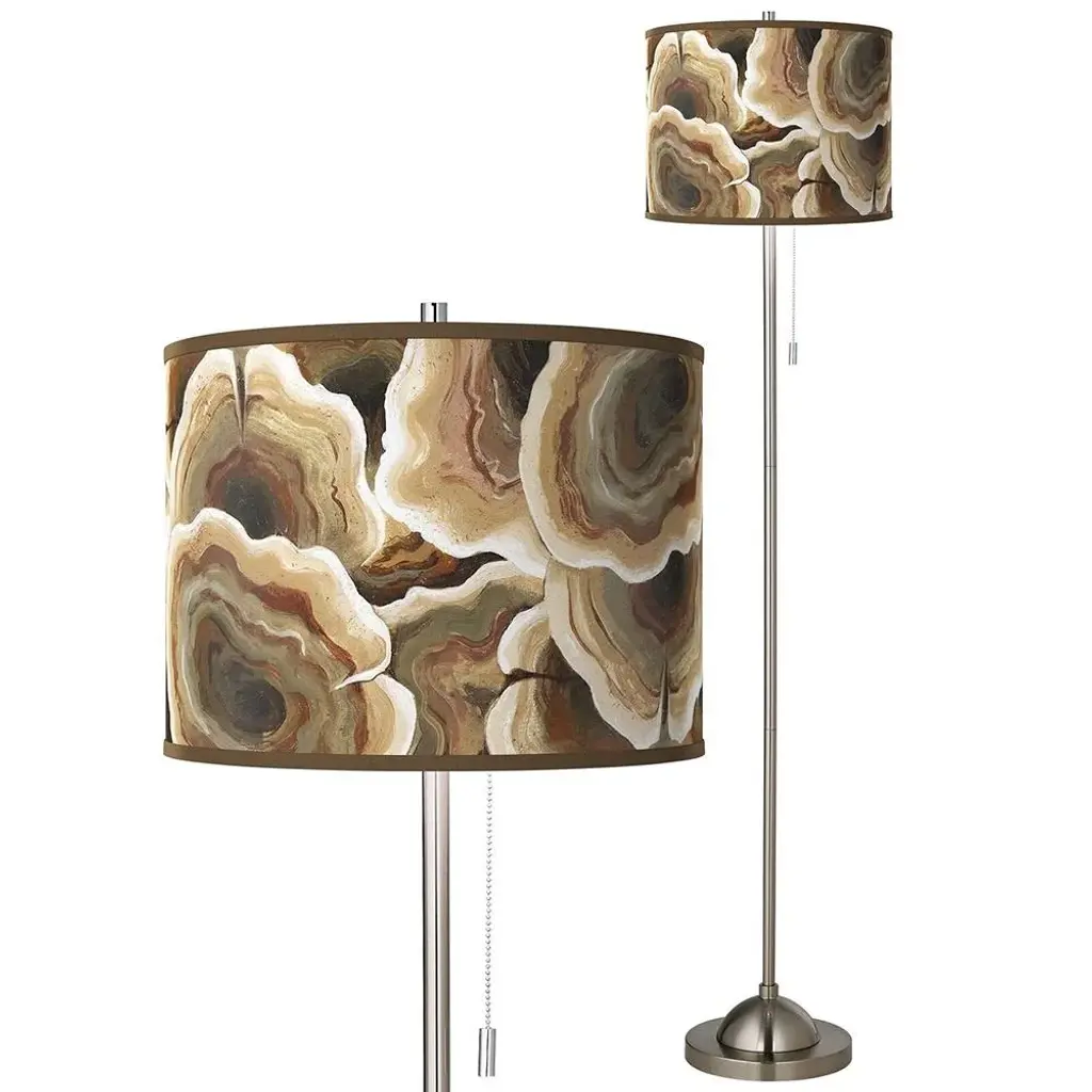 PRODUCT DETAILS: 62" high overall. Drum shade is 13 1/2" wide x 10" high. Base is 10" wide x 1 1/4" high. Uses one maximum 100 watt standard-medium base light bulb (not included). On-off pull chain switch for easy lighting control. Modern floor lamp design from the Giclee Glow brand of lighting. Features the custom made-to-order Ruffled Feathers pattern lamp shade that is giclee printed. Translucent shade material. Diffuser in the shade bottom. Brushed nickel finish base and pole. Metal construction. 8-foot long cord. DESCRIPTION: The base of this floor lamp has a modern look that pairs well with the unique personality of a giclee art shade. The custom made-to-order shade features a stylish Ruffled Feathers giclee-printed pattern that is printed by the same technique used in reproducing museum-quality artwork. The base features a cool, brushed nickel finish and has an on-off pull chain.