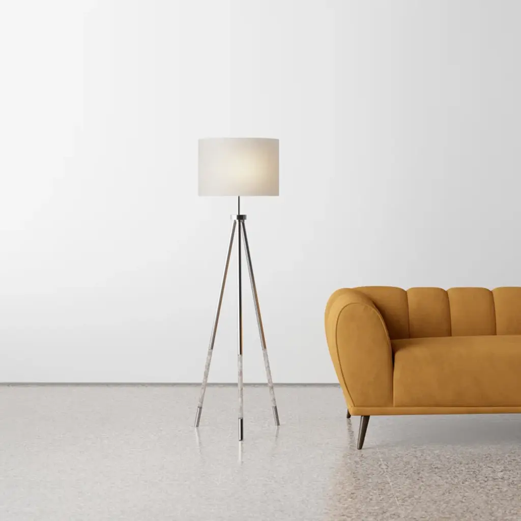 Combining two lighting options into one lamp, the Della Nightlight Floor Lamp is the perfect solution for the bedroom or living room. Light up the 16.75" round white textured fabric shade when 150 Watts of room-filling ambient light is needed. When it is time for bed, or you need some mood lighting in the living room, just turn on the soft LED light in the clear acrylic nightlight legs. The metal tripod base has a sleek, brushed steel finish and 20" sturdy footprint. A black & white fabric covered cord hangs down from the socket, turning a mechanical component into a fun, decorative accent.