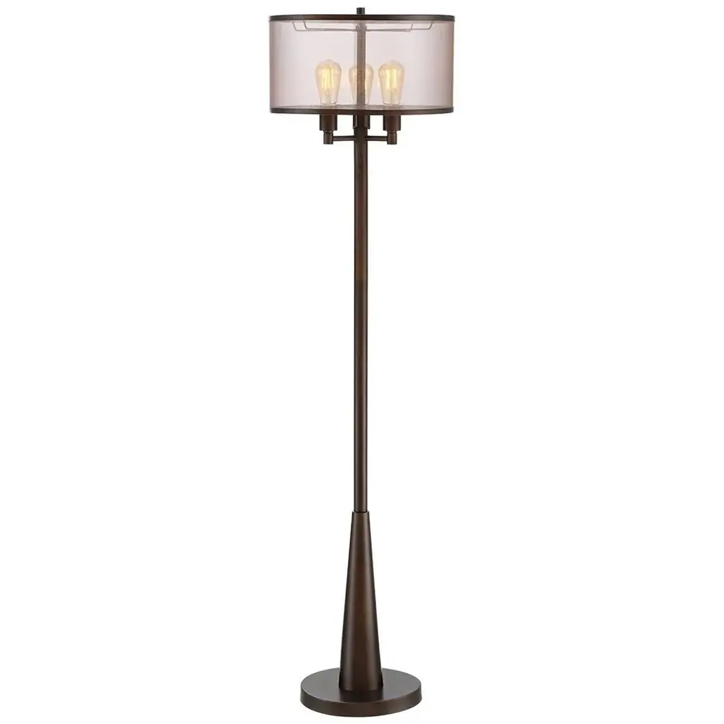 PRODUCT DETAILS: 62" high overall. Base is 11" wide. Shade is 16" wide x 8" high. Weighs 18.1 lbs. Includes three 7 watt standard-medium base Edison filmament LED light bulbs. Maximum 60 watt bulbs. 4-position roatary switch on column: one bulb on, two on, all on, all off. Durango rustic farmhouse style three-light floor lamp. From the Franklin Iron Works™ brand. Oiled bronze finish. Metal construction. Brown sheer fabric shade. 8-foot long brown cord. DESCRIPTION: From the exceptional craftsmen at Franklin Iron Works™, this floor lamp brings a refined but inviting sensibility to any room. The lamp boasts sturdy metal construction with an oiled bronze finish and is topped with a sheer shade which allows the Edison-style bulbs to be the focal point.