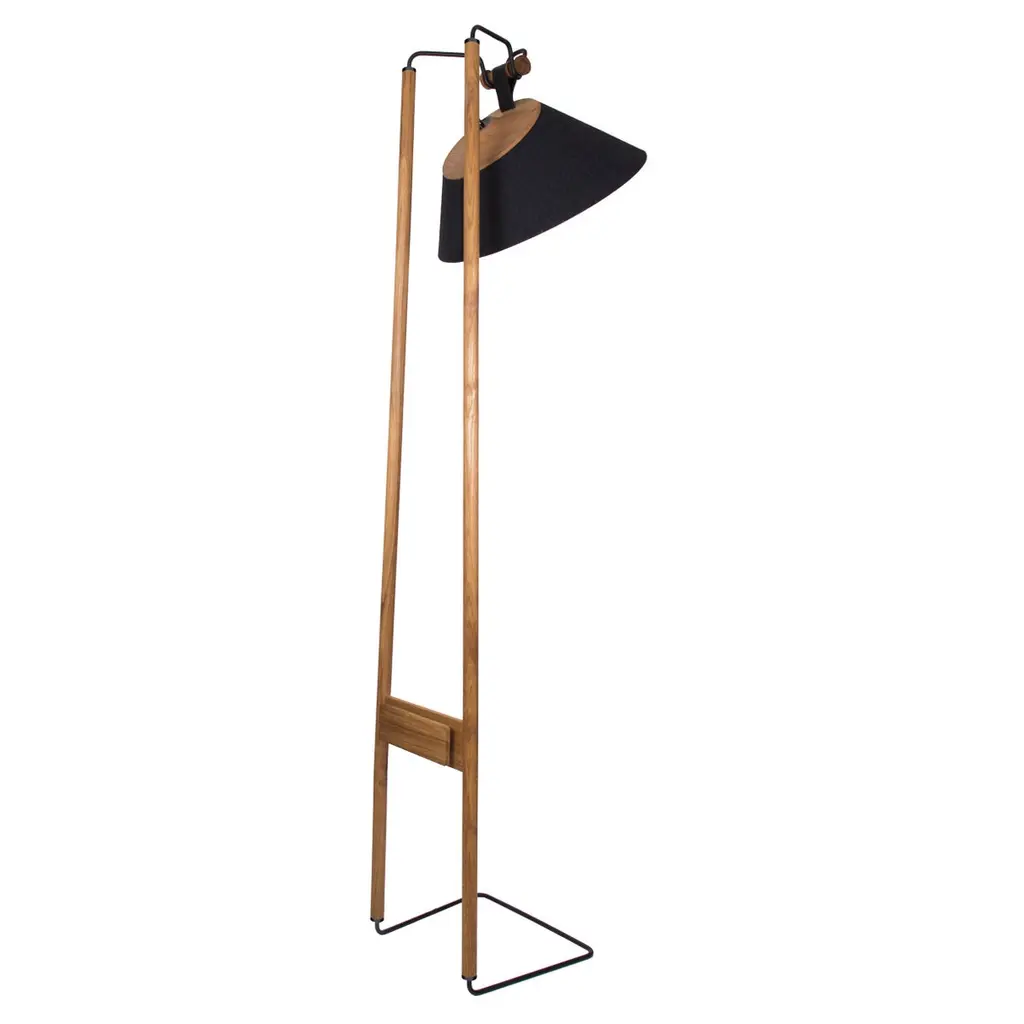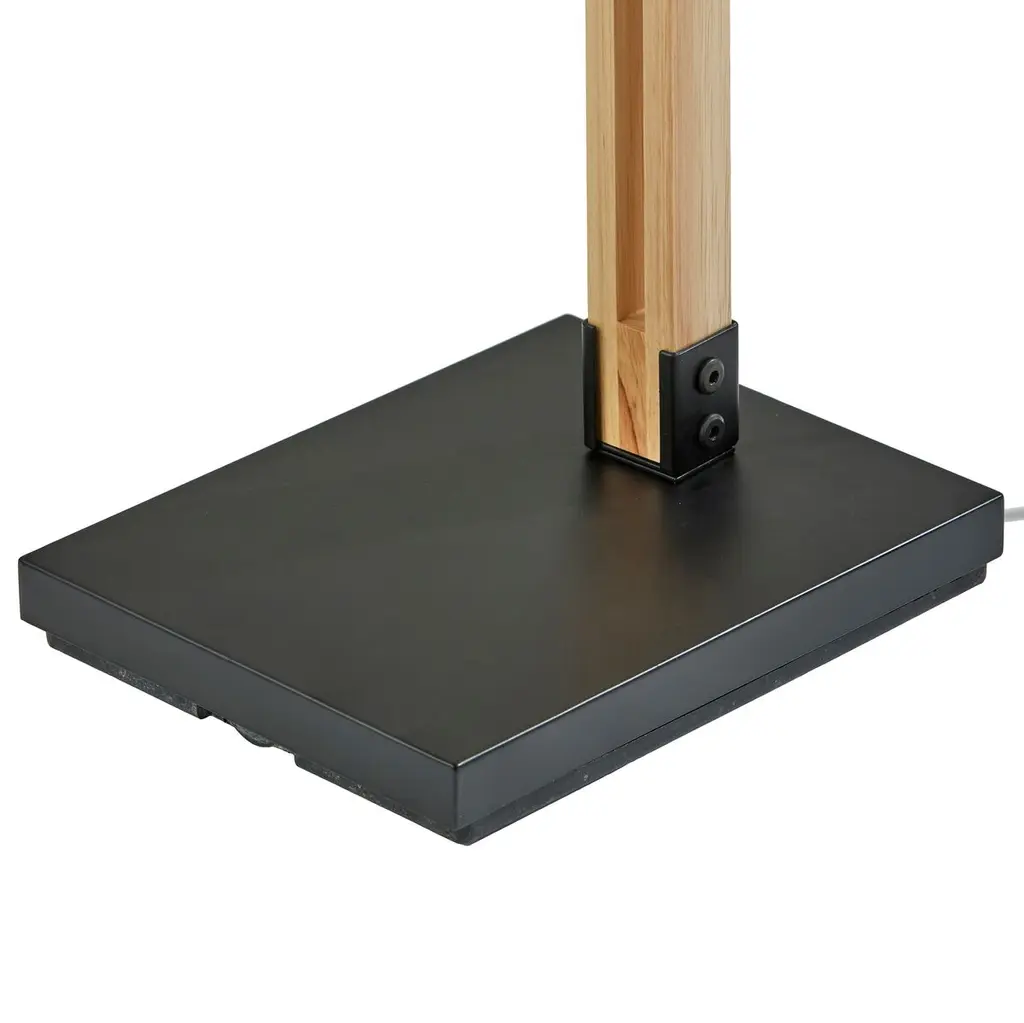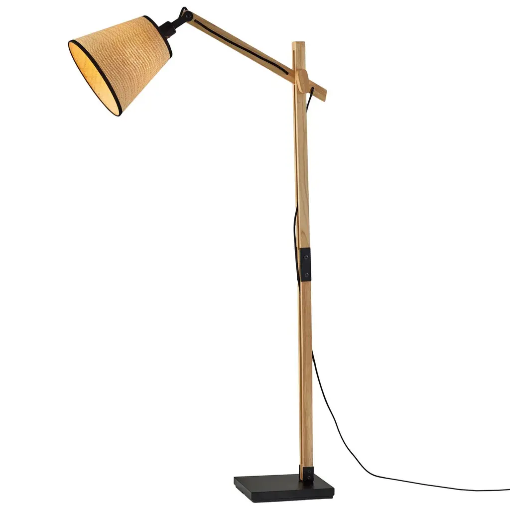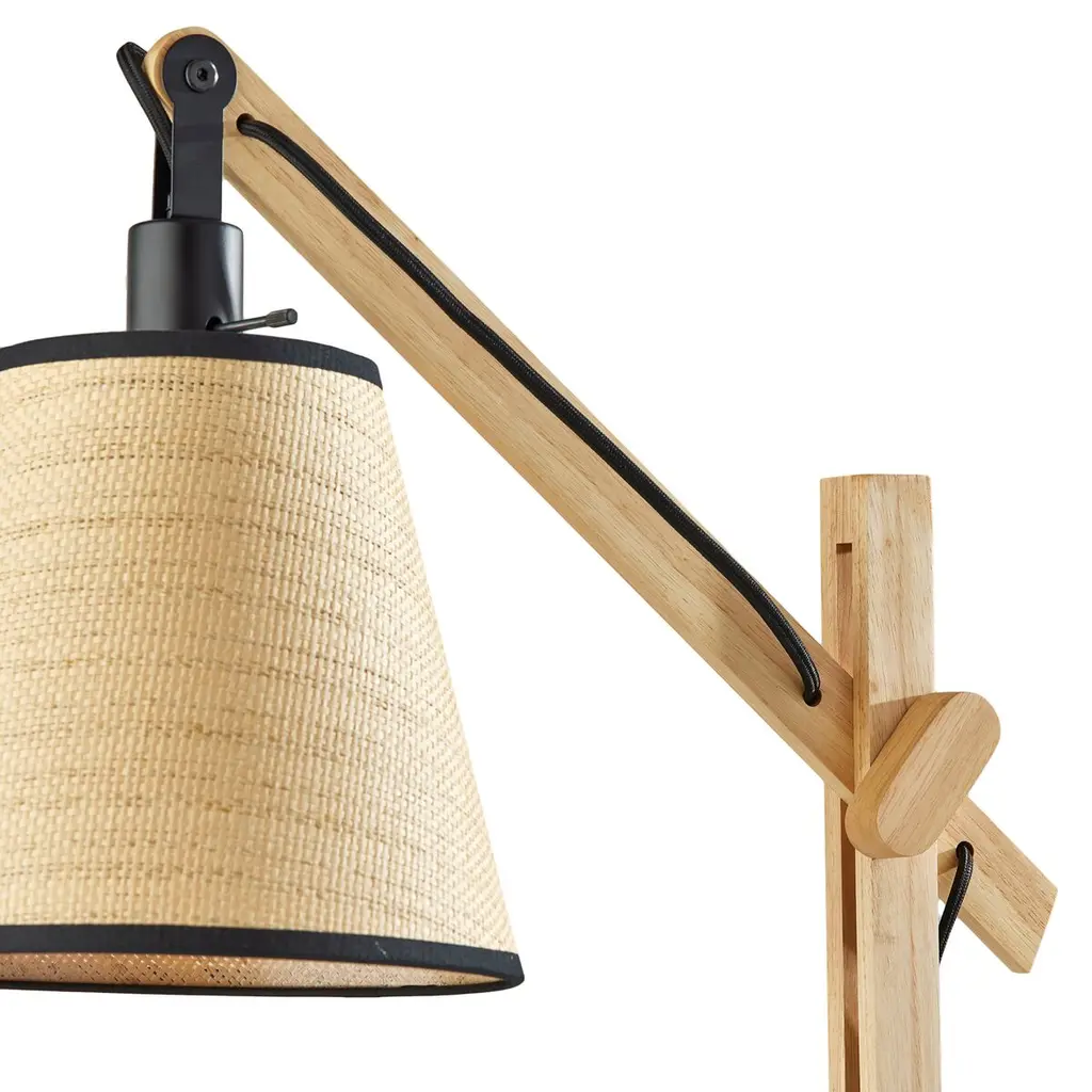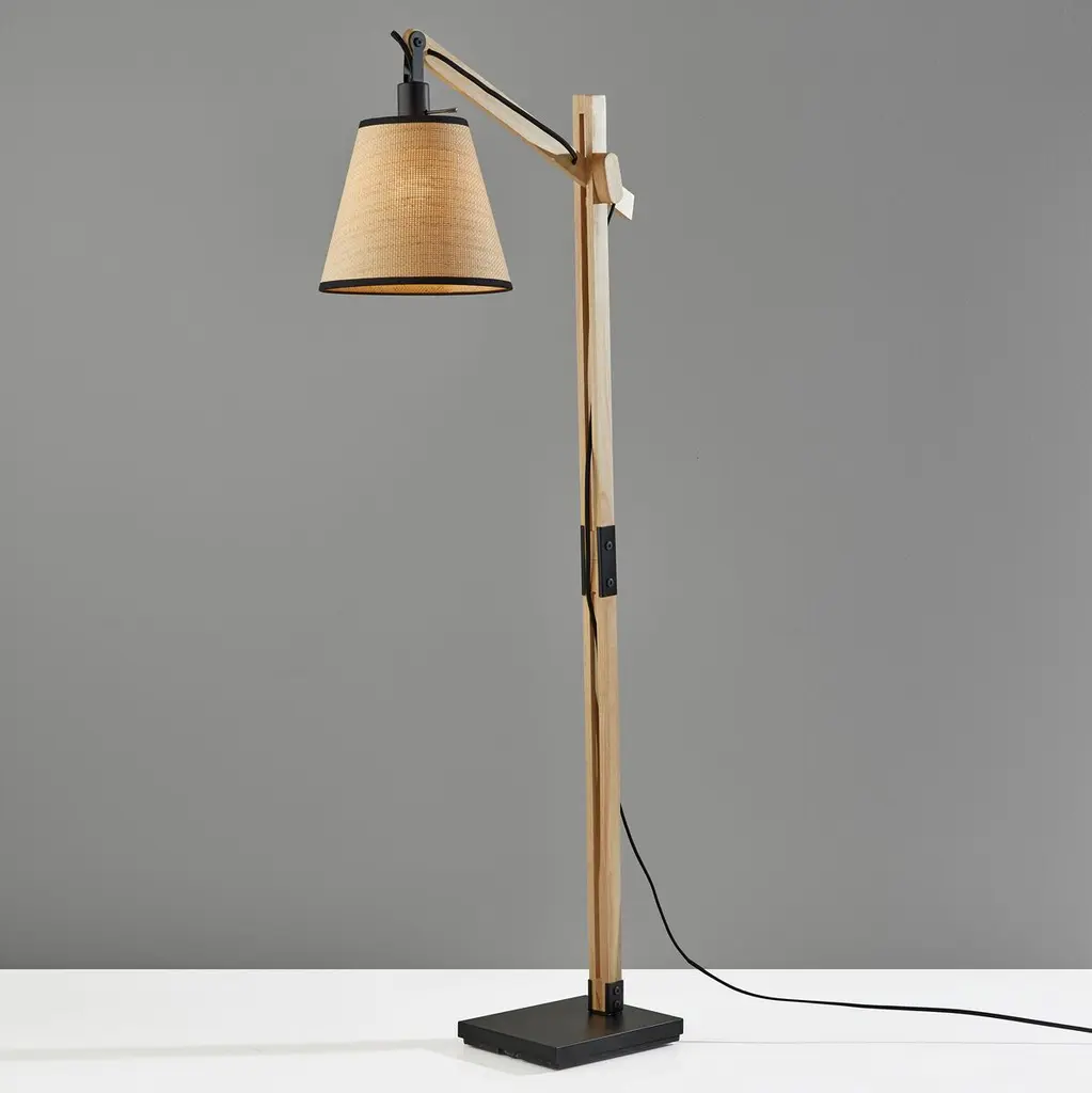 Introduce this floor lamp into rustic, contemporary, or eclectic spaces. Wooden joints adjust the balance arm to change the lamp height and angle of the shade to best serve your room. The black metal base and accents enhance an industrial style, while the natural wood body and natural woven paper shade with black trim along the top and bottom soften the look. For a unique style, the black fabric-covered cord threads through the square wood post body and drapes out the back. A 3-way rotary switch is located on the socket, allowing you to adjust the brightness between low, medium, high, and off to suit your needs. Complete your décor with the coordinating table lamp.