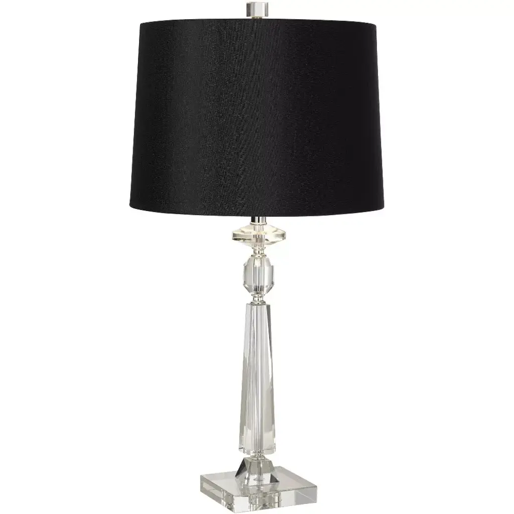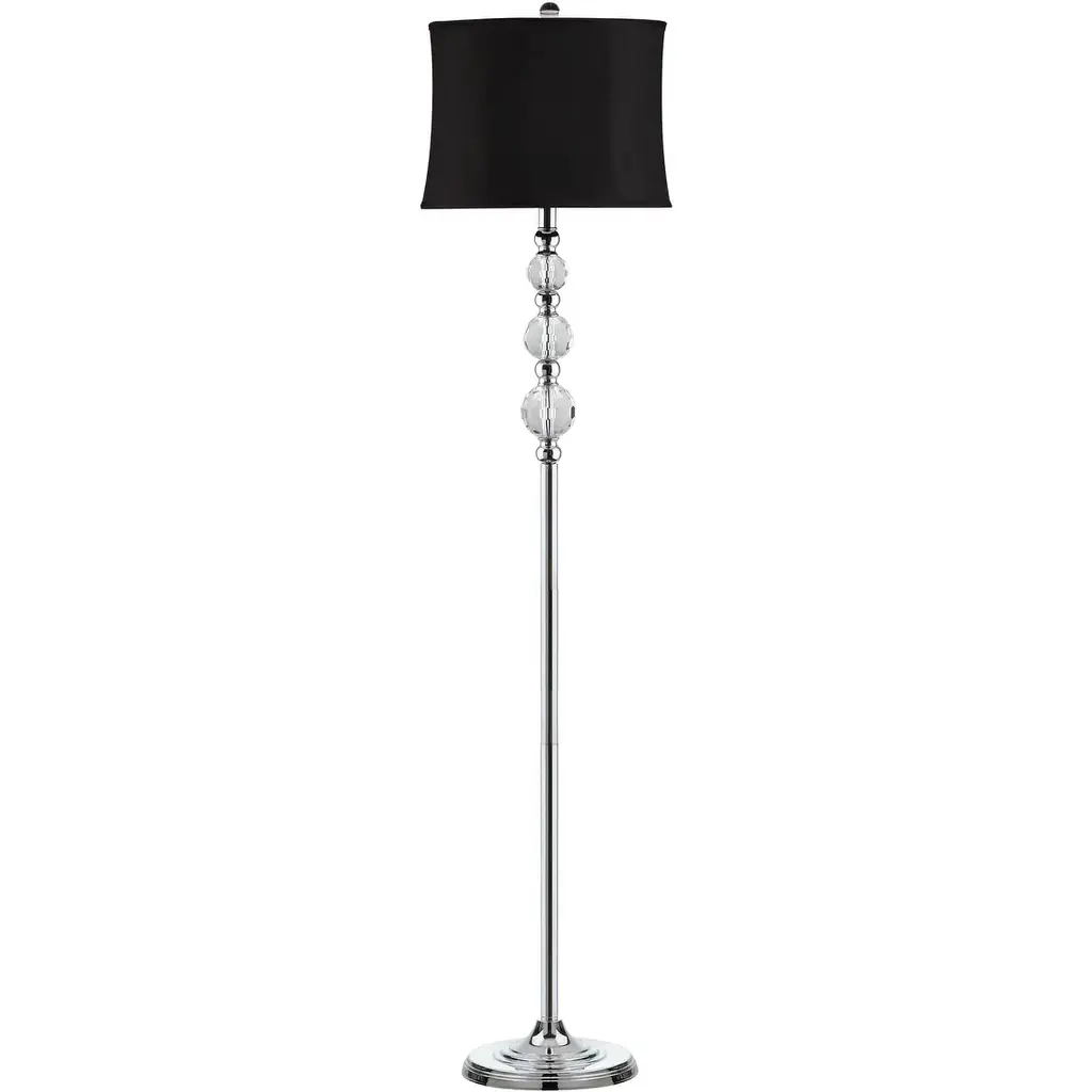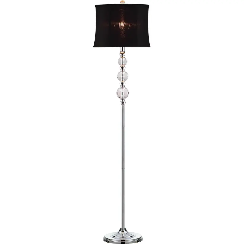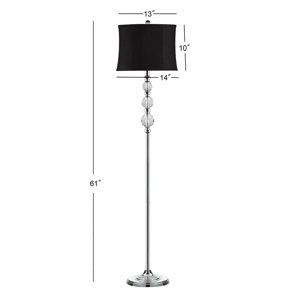 Simple details make the Venezia floor lamp a stylish stand out piece. Carefully wrought crystal balls are reminiscent of the renowned glass studios of Venice and add a touch of glamour to this lamp. A black hour-glass shade adds a sleek appearance which is perfectly balanced with a shiny chrome candlestick base. This stunningly chic lamp will pair effortlessly with both contemporary and traditional interior designs alike.Features:Lamp Color: ClearShade Color: BlackShade Fabric Material: Cotton-Polyester blendBody Material: Crystal/MetalMetal Finish: Chrome base, tube, and neckFinial Color: ClearHarp Style: TraditionalHarp Color: SilverFull Dimensions: 14 in. W x 14 in. D x 60.25 in. HItem Weight: 9.9 lbs.One (1) Compact Fluorescent light bulb includedCord Length: 72 in.Before cleaning any lamp shade or fixture, disconnect the power source. Wipe with a soft, dry cloth. Avoid the use of chemicals and household cleaners as they may damage the finish.Assembly required.