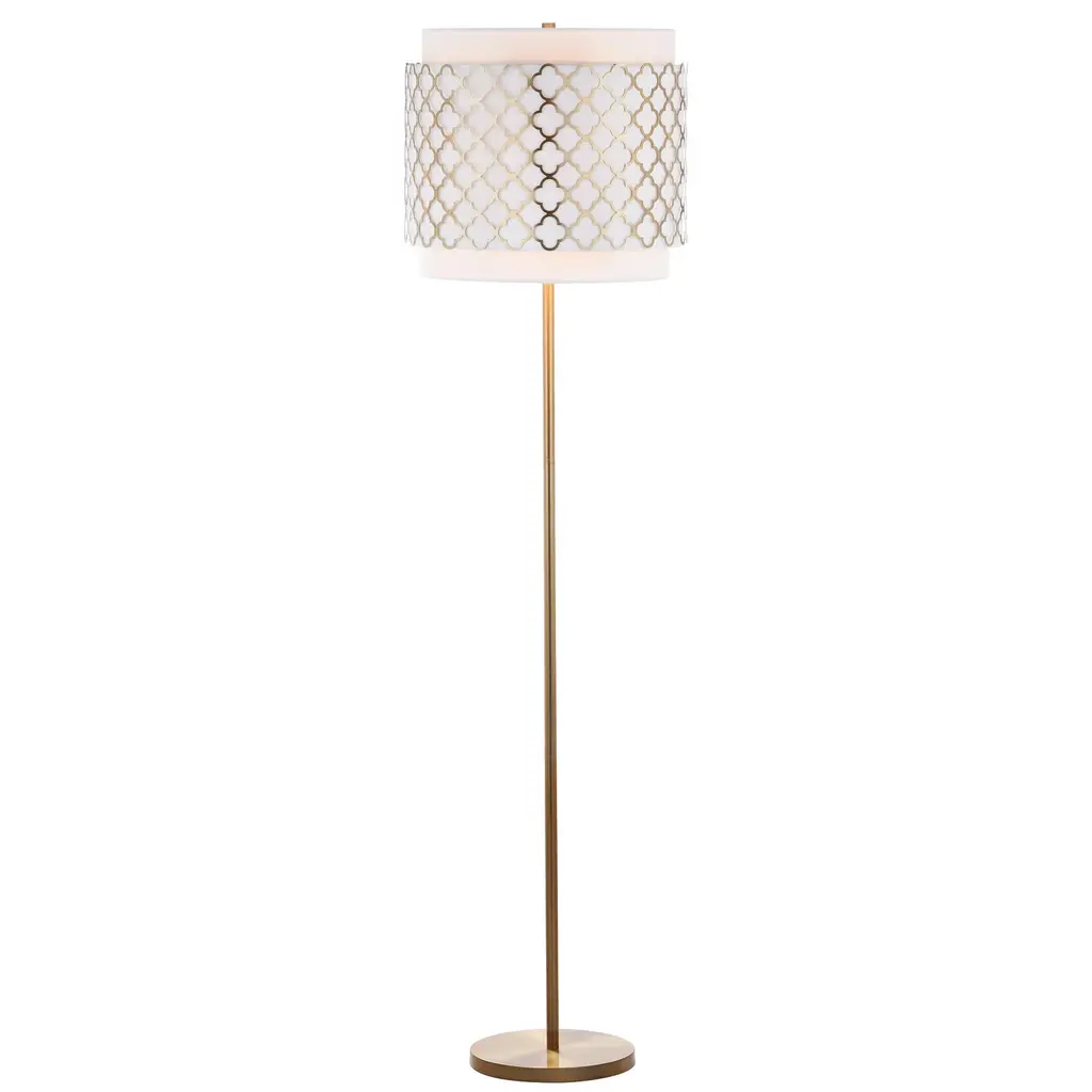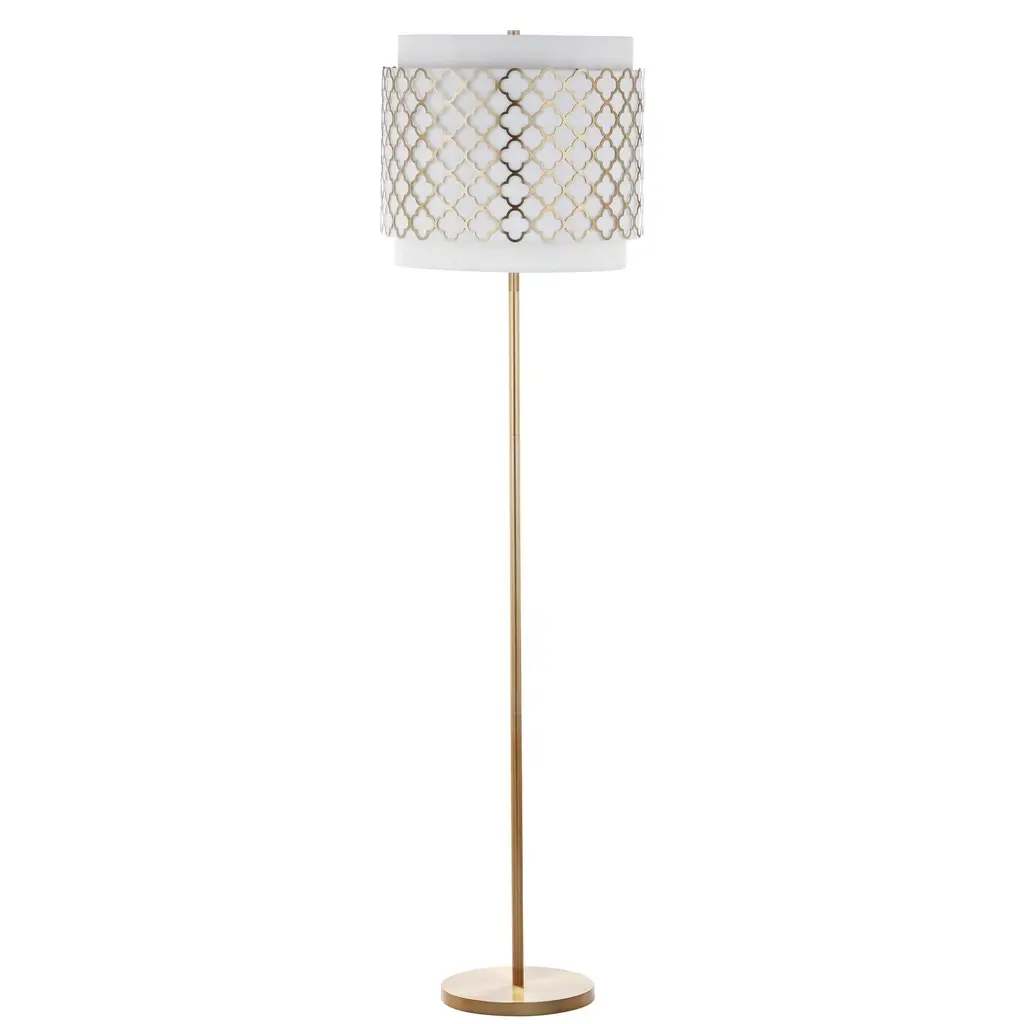 Poised and statuesque, this 61.5-inch floor lamp becomes a focal point in any space with its rich gold finish and quatrefoil pattern. Place alongside the sofa or a favorite chair in the living room or in the bedroom for gentle, relaxing illumination.Features:Dimensions: 16.5 x 16.5 x 61.5Lighting Type: Floor LampProduct Features: Bulbs IncludedCrafted of Transitional, ContemporaryLighting Style: Contemporary, TransitionalColor: Gold