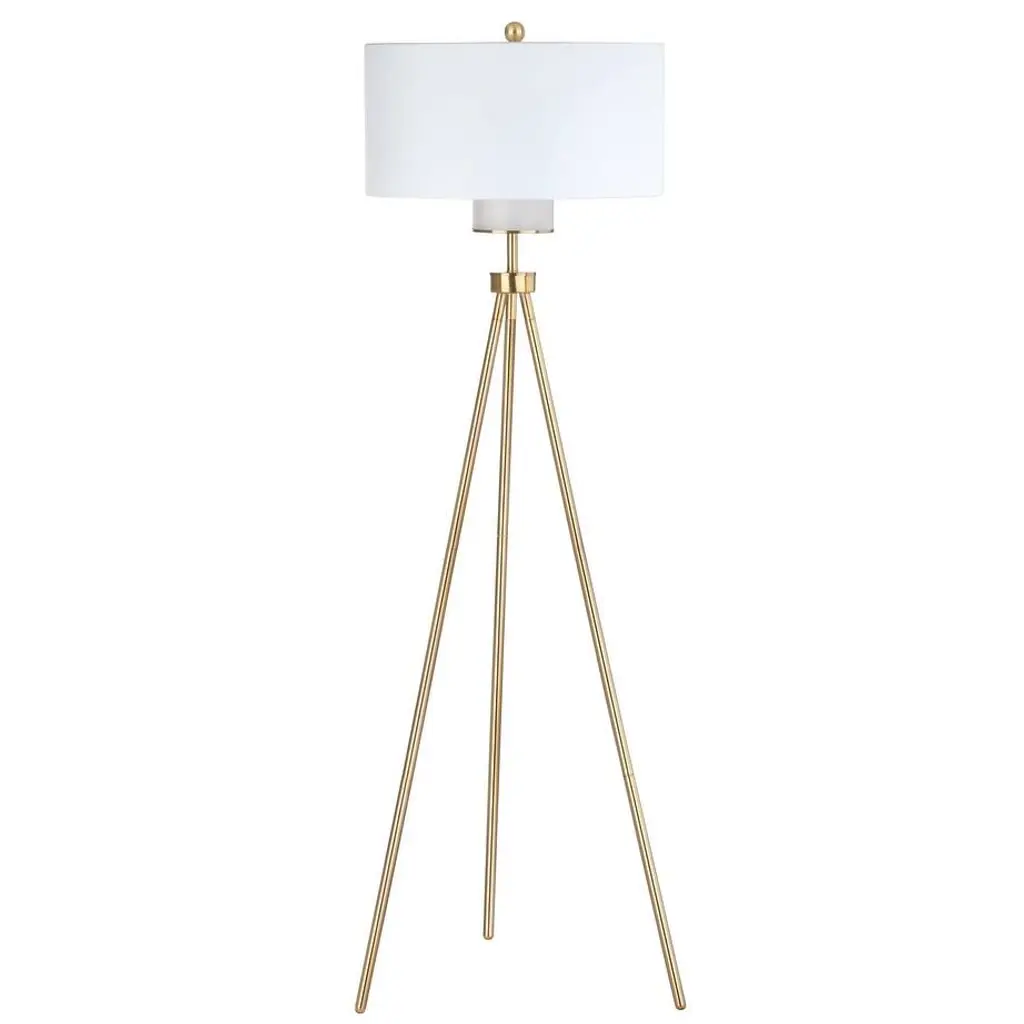 Add depth and dimension to any interior with this contemporary floor lamp. Its sleek tripod legs feature a radiant gold finish that adds opulent minimalist style to the living room or bedroom. Designers love the crisp, clean lines of its off-white shade. Bulb Wattage: 13W Number of Lights: 1 Light Lamp Type: Floor Lamp Material: Metal, Glass Lighting Style: Contemporary Color: Gold, Off-White