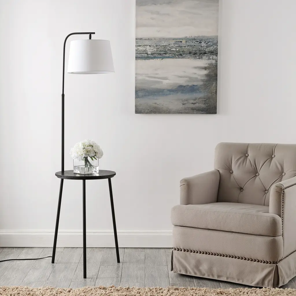 Ideal next to a sofa or favorite armchair, this Eion Floor Lamp is a perfect fusion of form and function. The sleek lines of Eion's matte black metal frame are softened by the warm wood finish of its tabletop and subtly curved arm, while an off-white tapered drum shade casts a soft glow in any interior.