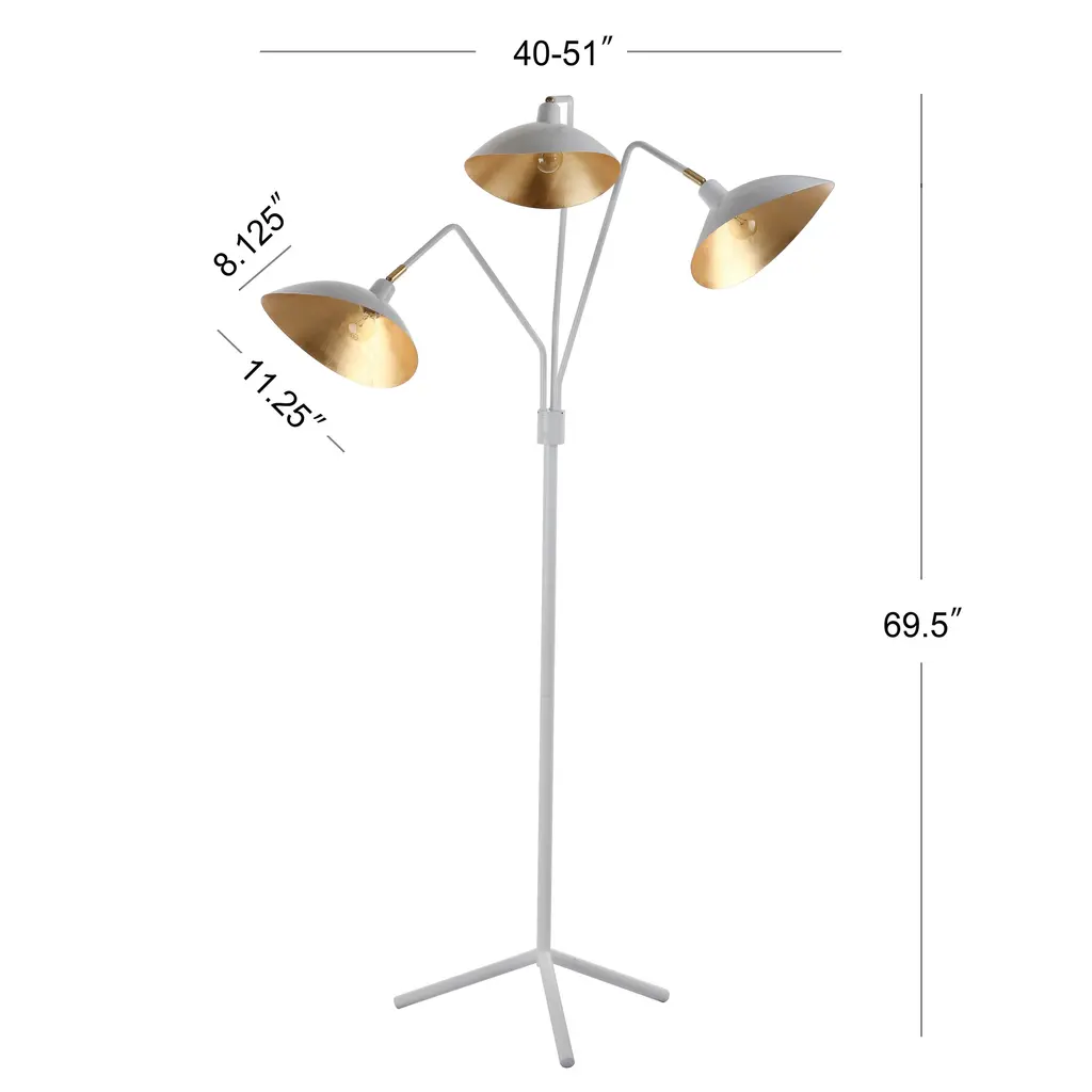 Brighten your home's living room through the use of this modern floor lamp. Each of three lamp sockets features a gold accent on its interior surface, offering a dynamic contrast against the metallic white color of the exterior lamp surfaces. An integrated foot switch makes it easy to turn the lights on and off.Number of Light: 3 LightsBulb Wattage: 13WLighting Type: Floor LampBulb Shape: Compact Fluorescent - CFLProduct Features: Bulbs Included, Energy EfficientLighting Shade Color: CreamCrafted of METALHeight: 23 in or moreLumens: 830Setting: IndoorSwitch Type: Foot SwitchLighting Style: Contemporary, TransitionalMeasures 40 inches -51 inches x 16 inches -29 inches x 69.5 inches