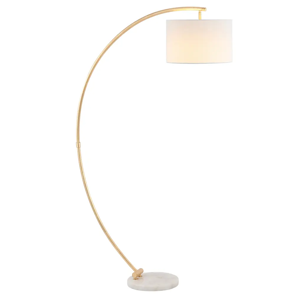 A spellbinding display of modern sophistication, this Madigan Floor Lamp is the epitome of modern class. Madigan's glamorous gold leaf finish and circular white marble base beautifully highlight its artistic arc frame, while a crisp white shade completes the look.