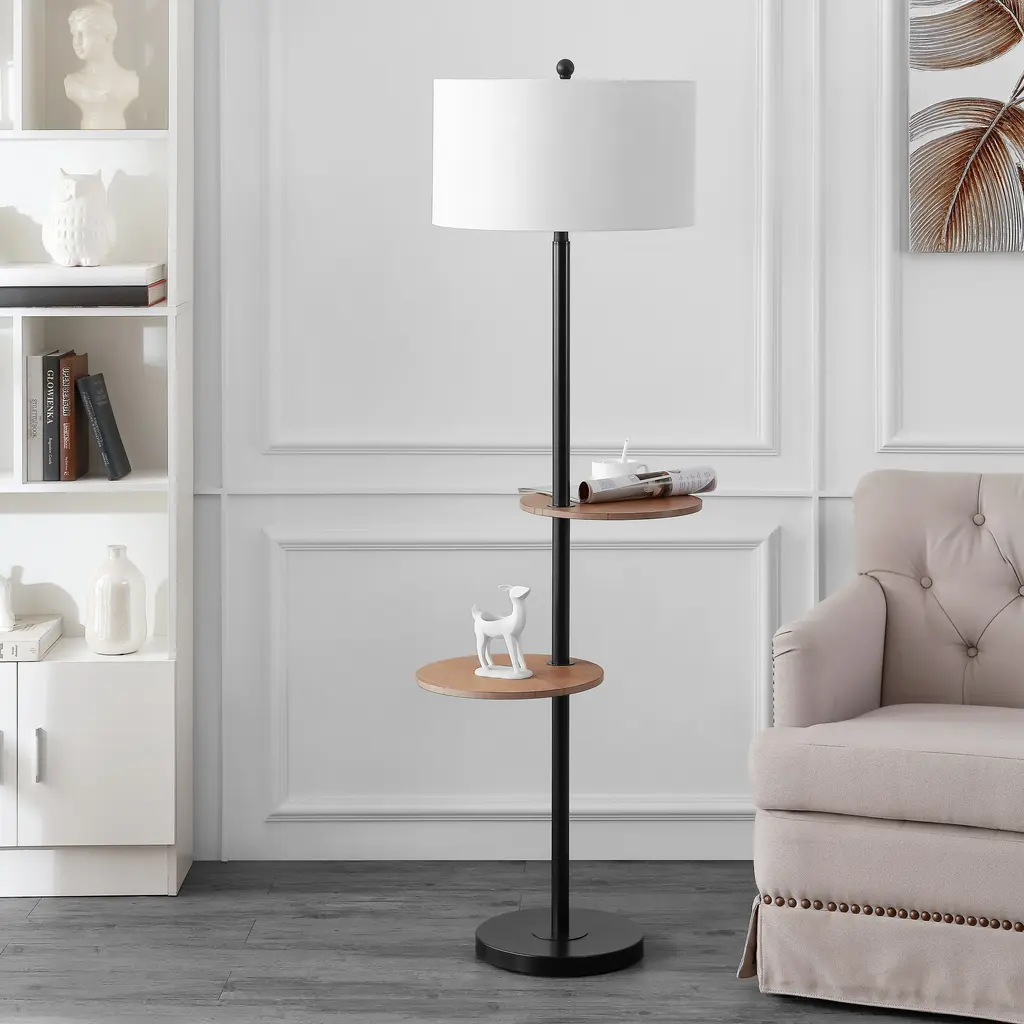 A fashion-smart blend of form and function, this Kelsen Floor Lamp is just as stylish in the traditional living room as it is in the urban-chic bedroom. Kelsen's matte black finish pairs beautifully with its two circular wood shelves, artfully arranged to provide a sense of depth and movement to any interior.