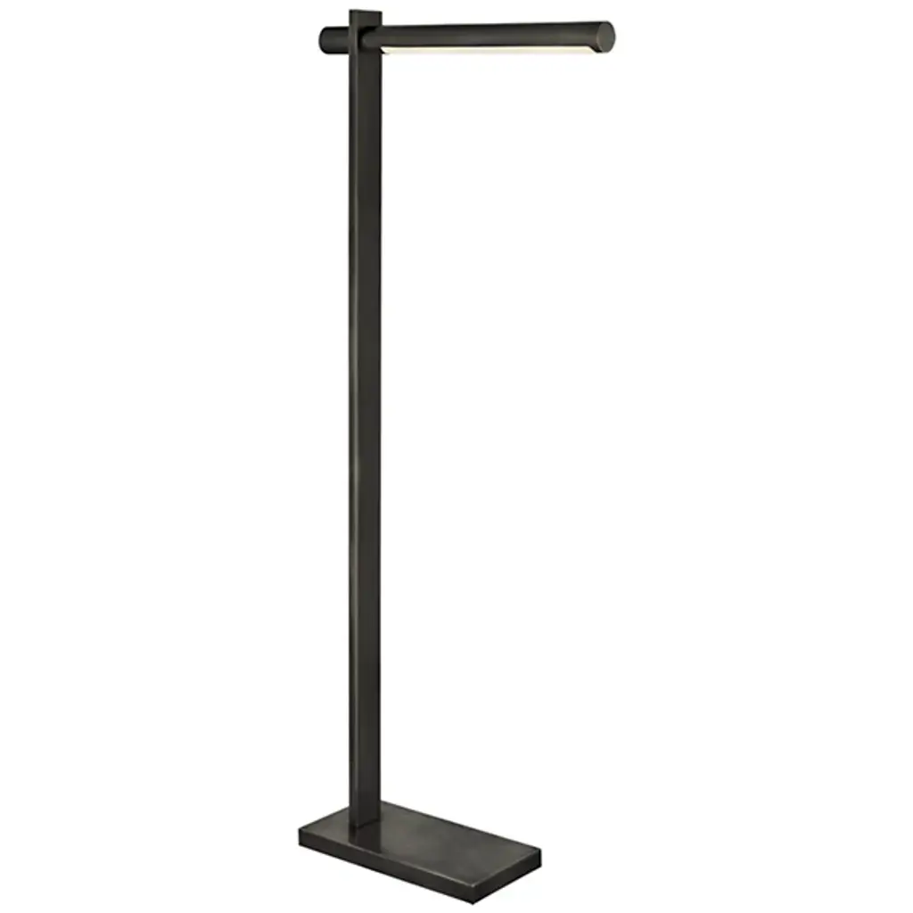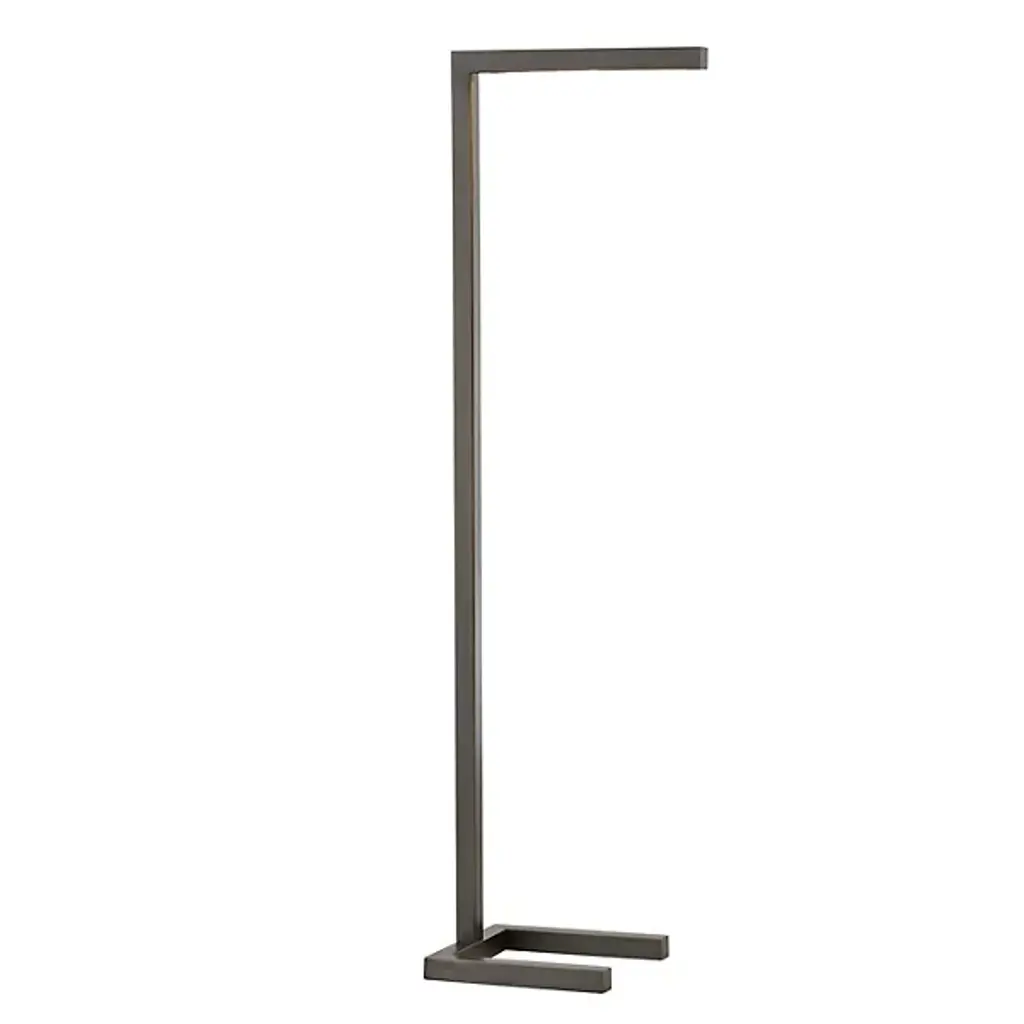 Sleek and simple in form and aesthetic this floor lamp exemplifies ultra-modern style. It’s built of steel to give it clean lines perfectly angular joints and a shiny polish; the completely linear frame allows it to tuck neatly into a reading chair or sofa to reduce its footprint in the room. An LED strip is nicely concealed into the frame. To give the modern look a bit of a twist it is entirely finished in bronze. Fitted with a full range dimmer on a black cord.