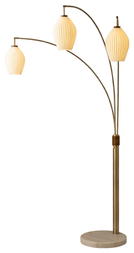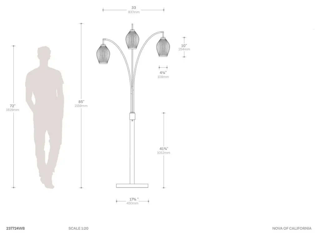 The Santa Clara 3 Light Arc Floor Lamp seamlessly blends form and function, offering an exquisite touch to modernize transitional spaces. Crafted with precision, the refined onion-shaped lanterns are made from pearl-hued porcelain, providing a warm, diffused light. Enhanced by a weathered brass column and walnut accents, this lamp establishes a captivating focal point for the room, leaving an impression whether illuminated or not. Elevate your space with the Santa Clara 3 Light Arc Floor Lamp, embodying both aesthetics and functionality.• Shades crafted from pearl-hued porcelain.• Weathered brass column with walnut accents.• Creates an impressive room focal point whether on or off.• Convenient dimmer switch on the column for customizable lighting.• Stable natural marble base ensures secure placement.• Energy-efficient LED compatible.• Smart switch compatible - effortlessly sync with Amazon Echo, Google Assistant, and Apple Home for easy & automated control.• Contract grade: high quality materials, quality workmanship, built to last a lifetime & designed in Venice Beach, California. • NOVA of California is the oldest light company in North America and has been making original contemporary designs for 100 years. • Sustainability statement: We are committed to minimizing the unwanted impact our business has on the environment. We care for our planet.