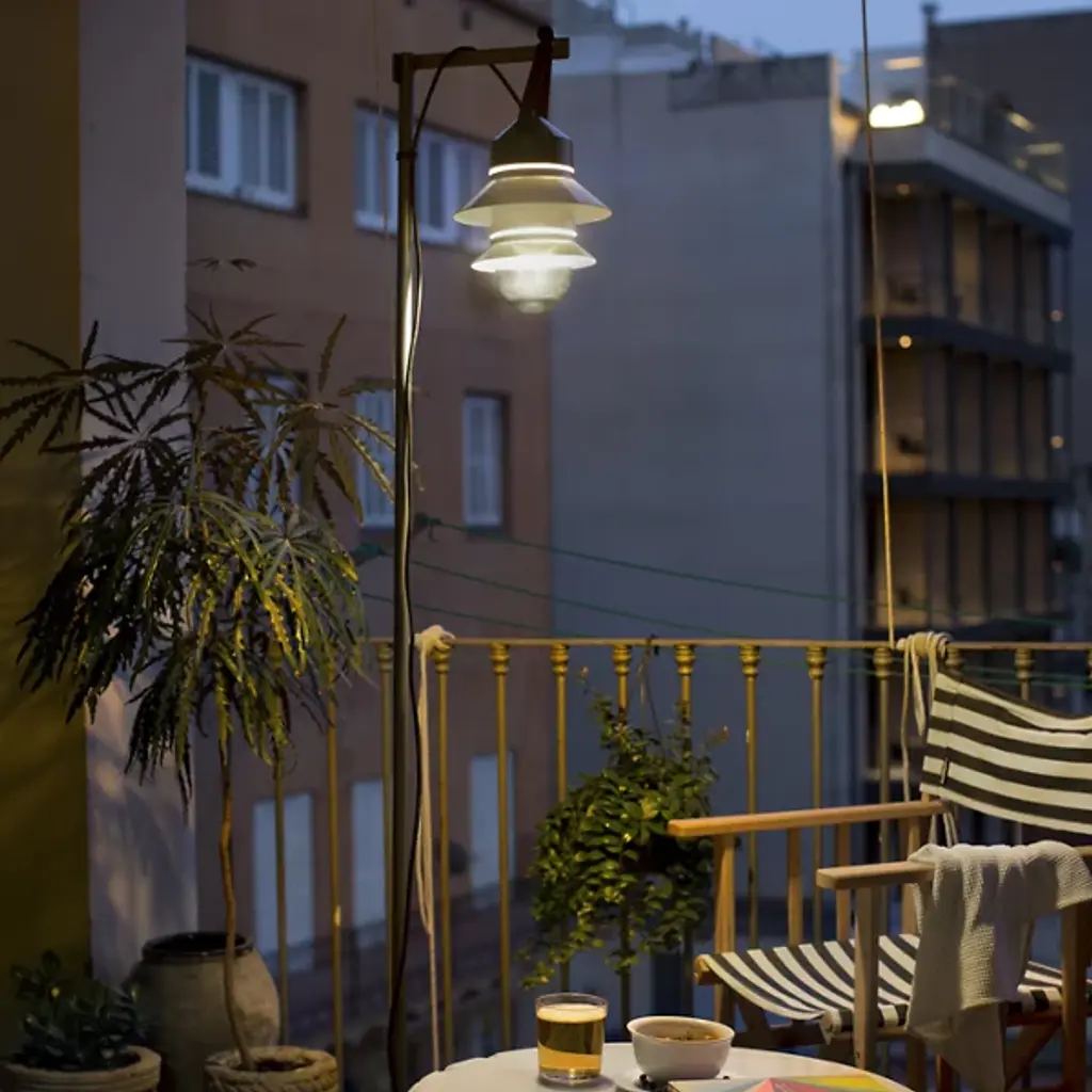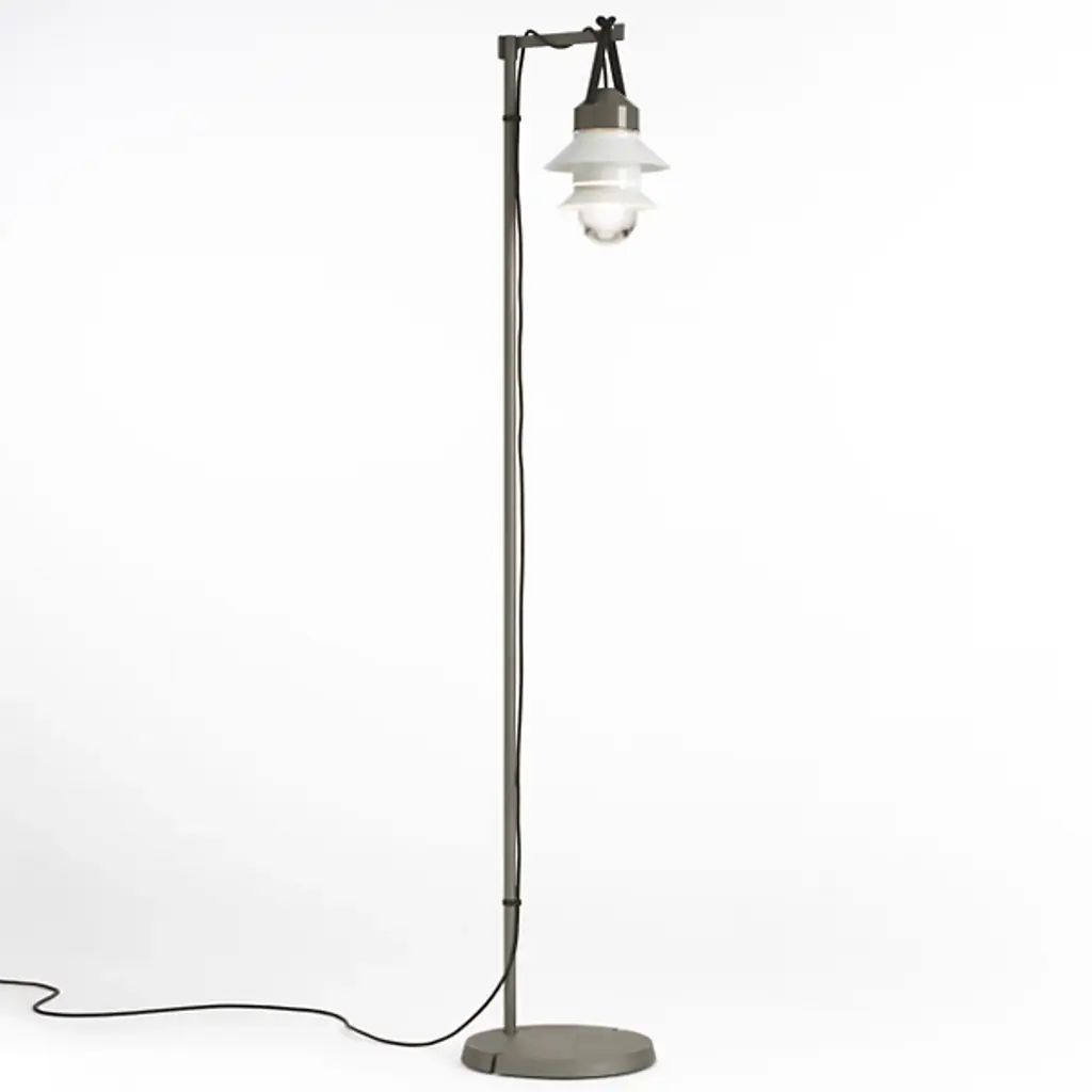 Inspired by fishing boat lanterns, the Santorini Outdoor Floor Lamp is a dynamic beacon of light with customizable shades and a portable grey metal floor base. After hanging the Santorini pendant from the horizontal arm, the lengthy cord can then be wrapped around the structure and plugged in, easily moving the fixture around exterior environments. Two shades (one small and one large in the same color) are included with the pendant, and can be configured to change the look and distribution of light; you can decide the number of shades, direction and arrangement on the cylindrical white diffuser part of the glass.