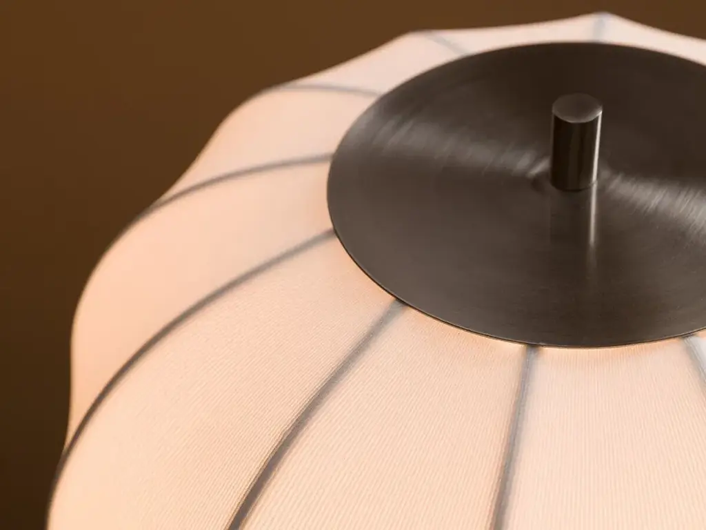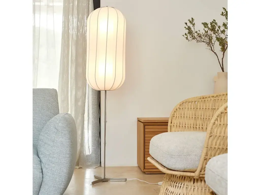 Inspired by traditional Japanese lanterns, SATCHI is a contemporary floor lamp with soft and delicate lines. The rounded lampshade lets diffuse light through its light finely fluted fabric. The metal base in satin nickel finish is slender. It seems to disappear to make way for the light.Product Details:Shade fabric 84% polyamide, 16% SpandexInternal PVC diffuserLeg in satin nickel finish ironTextile sheathed electric cable (polypropylene)Dimmable switch2 Holder for E27 socketFor bulb (not included): 8W max, compatible with a dimmer