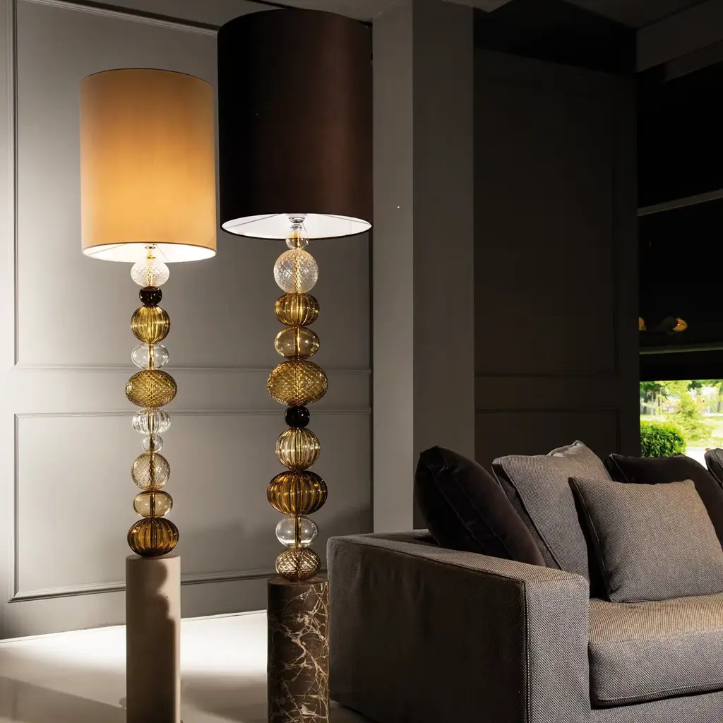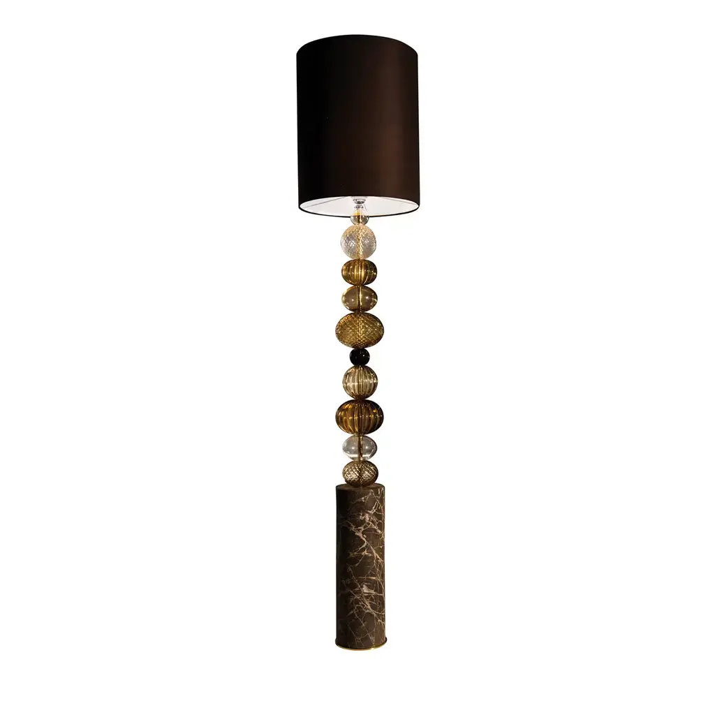An extraordinary design of unmistakable sophistication, this floor lamp designed by Antonio Ventimiglia is characterized by a harmonious combination of shapes and fine materials that provide a striking visual and functional aesthetic. Enclosed between a cylindrical black fabric shade and marble base, the stem showcases eight Murano glass globes of different sizes decorated with an embossed "balloton" pattern. This piece requires one E27 max 100W 230V light bulb and is also available in wall and table versions, please contact the Concierge.