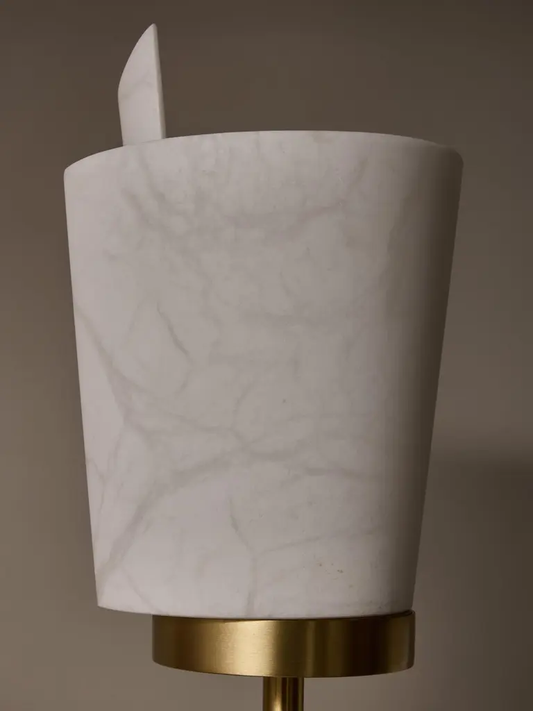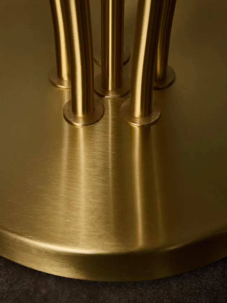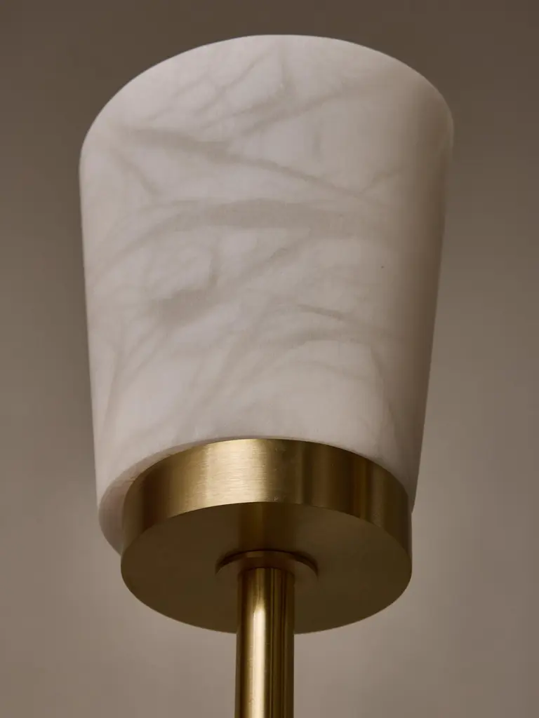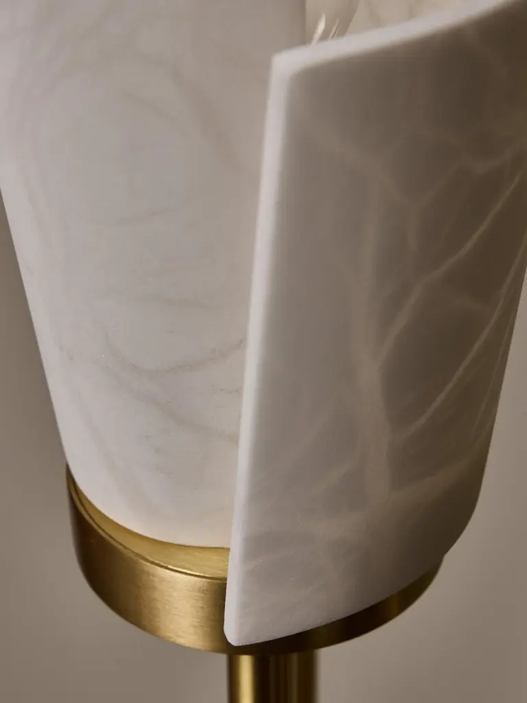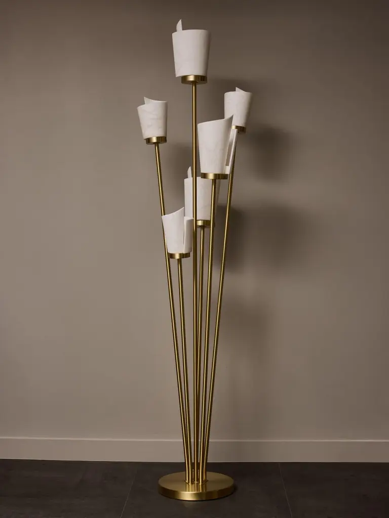 Satinated brass floor lamp made of a round base and six tilted arms of light topped by new spiral shaped alabaster diffuser.