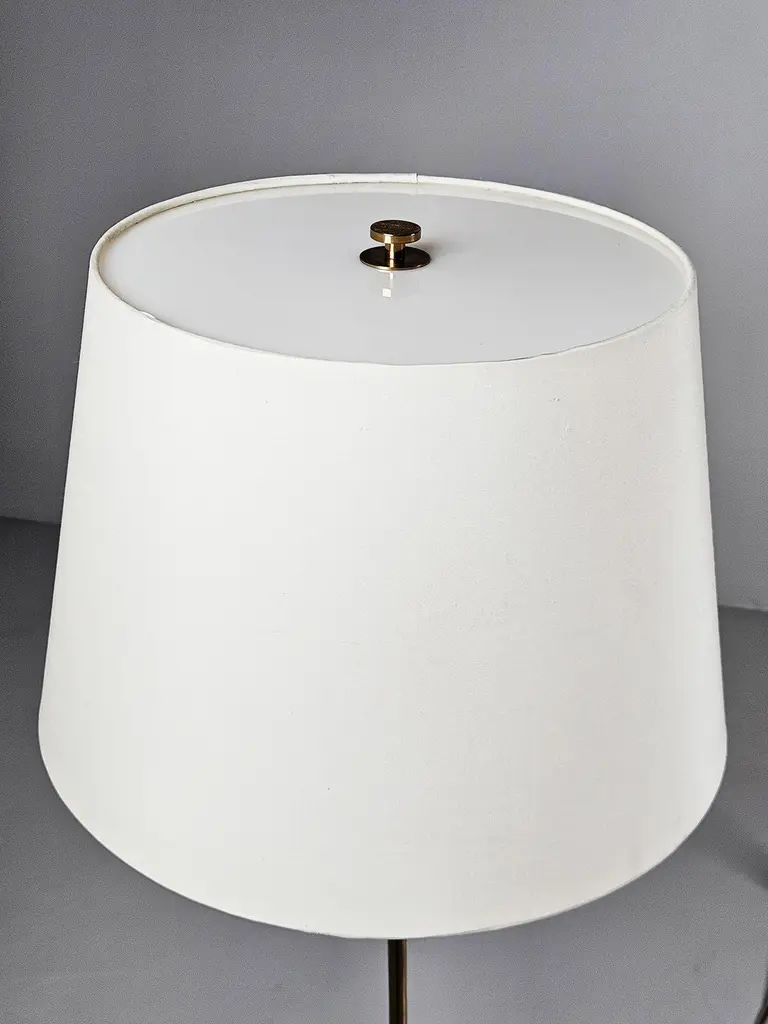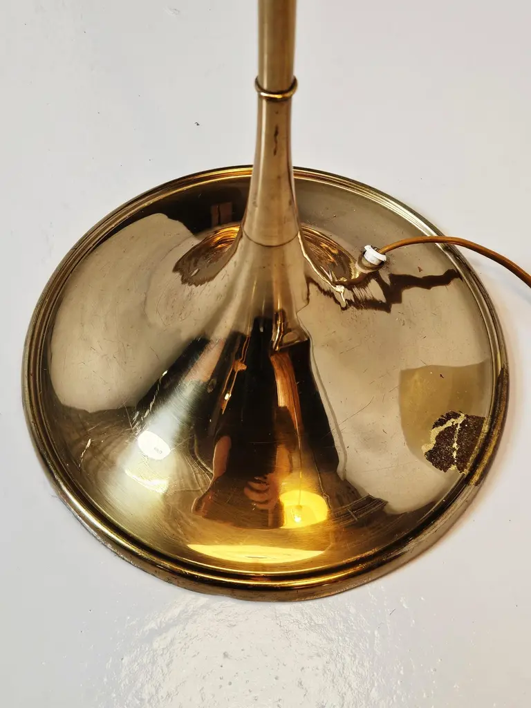 Pair of Bergboms floor lamp model 'G-026' produced in Sweden during the 1970s. Made in brass with a modernistic design. Original shades with a plastic top that produces a soft light.