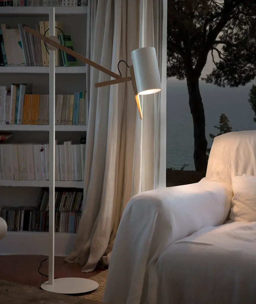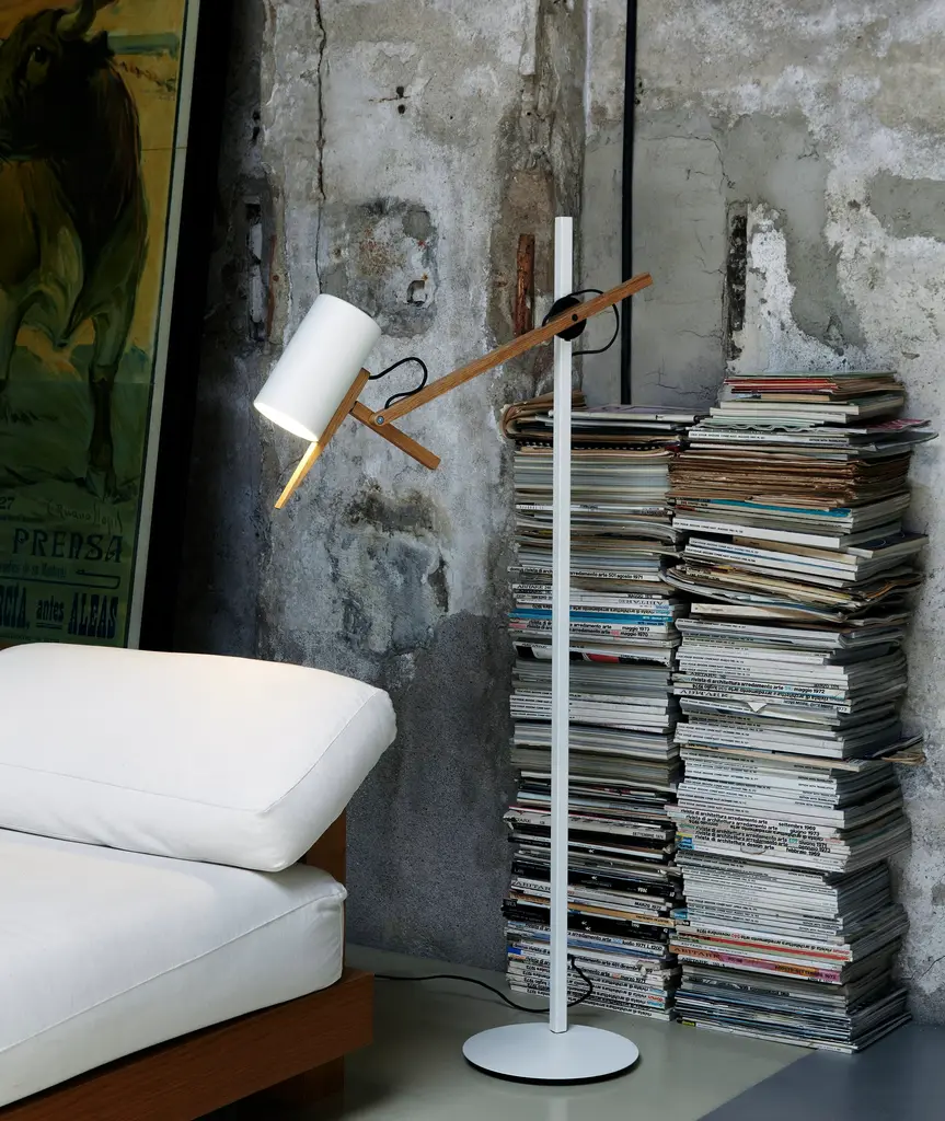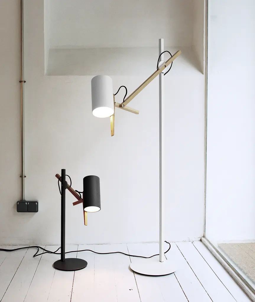 A combination of basic geometric shapes and the use of wood together with metal give this range of lamps a homely appearance, at the same time as a clearly defined personality. All of the movements of the fully rotating shade use arms and hinges, and its technical precision means that springs or counterweights are not necessary in order to maintain the selected position. Scantling is a term used to define the size to which a piece of wood or stone is measured and cut, derived from the name of an old unit of measurement. The interplay of the different elements used in its design gives this lamp an archetypal, almost graphic appearance.