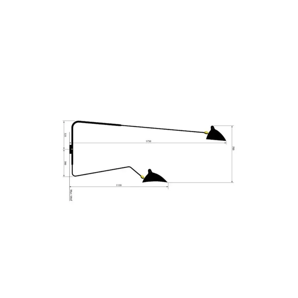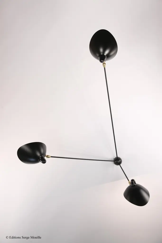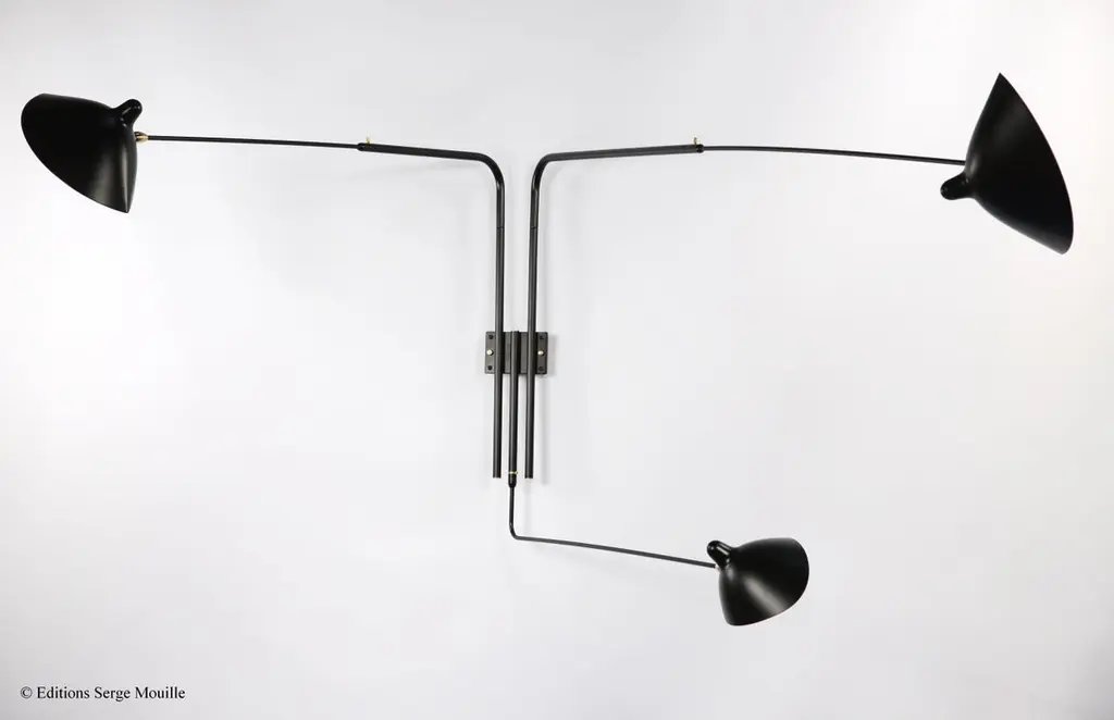Sconce 2 rotating arms 1 straight 1 curved by Serge MouilleDimensions: D175 x H70 cmMaterials: Brass, Steel, AluminumOne of a King. Numbered.Also available in different color.All our lamps can be wired according to each country. If sold to the USA it will be wired for the USA for instance.Made in France, this Serge Mouille wall lamp with 2 pivoting arms, 1 of which is curved, has a straight arm and a curved arm that can be adjusted to control the distribution of light. Reissue of a 1953 model, it has two aluminum reflectors with a white interior that pivot using a brass ball joint. Delivered quickly, this model is numbered and supplied with its certificate of authenticity. Also available in white.Serge MouilleBorn in Paris in 1922, Serge Mouille is today considered one of the greatest lighting designers in the world. He developed a talent for drawing and creation very early on and was the youngest student of his time to be admitted to the School of Applied Arts at the age of 13.Master goldsmith, Serge Mouille learned the art of modeling metal with a hammer thanks to his mentor Gabriel Lacroix and worked for several goldsmith houses in Paris. It was his meeting with Jacques Adnet, director of the Compagnie des arts français, that would mark a turning point in his career.In 1951, Jacques Adnet commissioned Serge Mouille to create a “large light fixture” for his South American customers: the first three-arm floor lamp was born. This innovative luminaire in molded black steel with organic shapes will influence his famous series of "Black Forms" and will forever mark the history of design. Serge Mouille then passes from the status of master craftsman to that of creative artist.At the beginning of the 1960s, Serge Mouille decided to radically distance himself from everything he had created until then by developing a series of light columns with fluorescent tubes. In 1963, he stopped producing lights to devote himself to teaching.Suffering from tuberculosis, Serge Mouille died in 1988 and his widow, Gin Mouille, decided to continue to bring his art to life by publishing under license his most emblematic creations. Each copy is made in France by Éditions Serge Mouille and has an engraved serial number, accompanied by a certificate of authenticity.