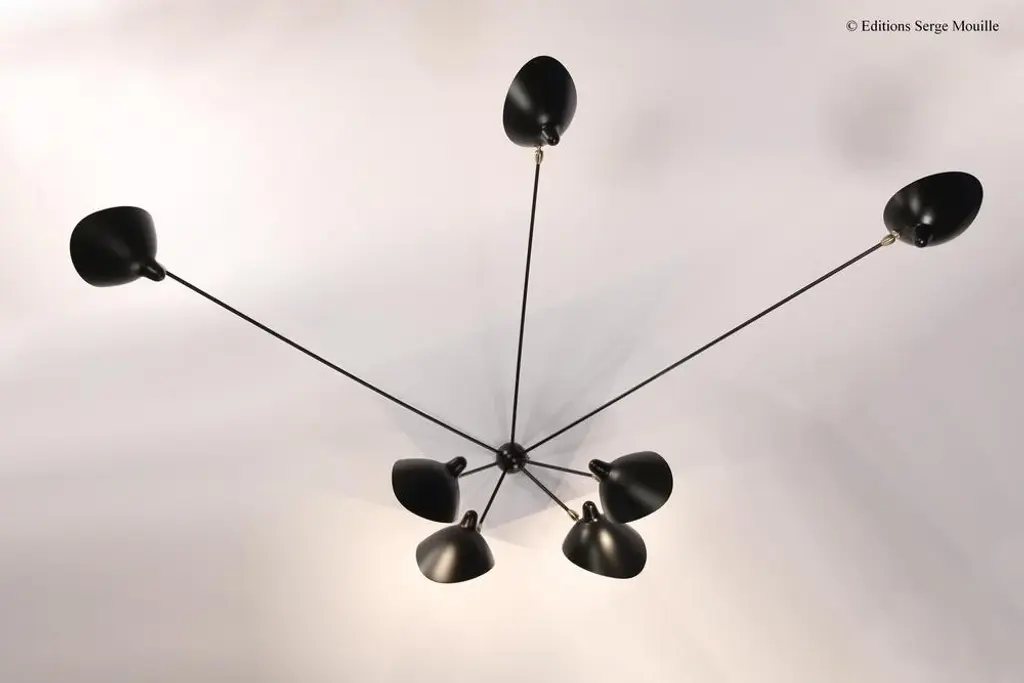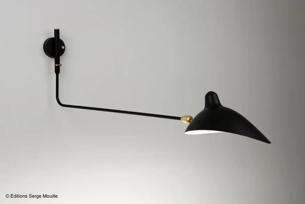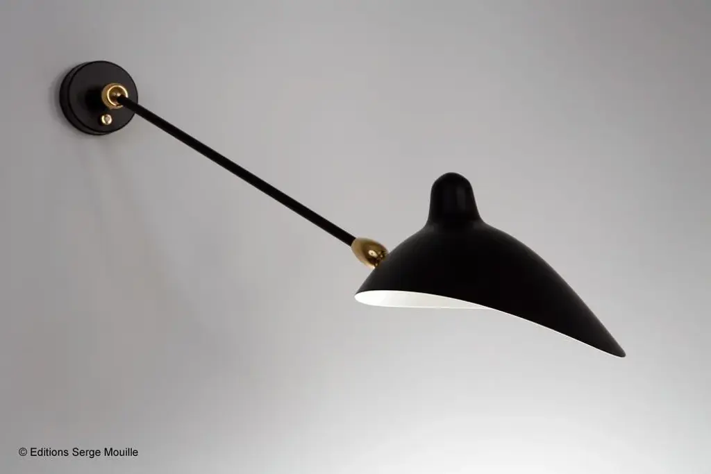 Sconce 2 rotating straight arms by serge mouille dimensions: d134 x h75 cm materials: brass, steel, aluminium one of a king. Numbered. May be available separately in different colour. All our lamps can be wired according to each country. If sold to the usa it will be wired for the usa for instance. The serge mouille wall lamp with 2 swiveling straight arms is a 1953 reissue made in france by éditions serge mouille. Adjustable according to your needs, it has two black steel rods with brass ball joints, each supporting an aluminum reflector with a shiny white interior. May be available separately in white, this model comes numbered with a certificate of authenticity. Serge mouille born in paris in 1922, serge mouille is today considered one of the greatest lighting designers in the world. He developed a talent for drawing and creation very early on and was the youngest student of his time to be admitted to the school of applied arts at the age of 13. Master goldsmith, serge mouille learned the art of modeling metal with a hammer thanks to his mentor gabriel lacroix and worked for several goldsmith houses in paris. It was his meeting with jacques adnet, director of the compagnie des arts français, that would mark a turning point in his career. In 1951, jacques adnet commissioned serge mouille to create a “large light fixture” for his south american customers: the first three-arm floor lamp was born. This innovative luminaire in molded black steel with organic shapes will influence his famous series of "black forms" and will forever mark the history of design. Serge mouille then passes from the status of master craftsman to that of creative artist. At the beginning of the 1960s, serge mouille decided to radically distance himself from everything he had created until then by developing a series of light columns with fluorescent tubes. In 1963, he stopped producing lights to devote himself to teaching. Suffering from tuberculosis, serge mouille died in 1988 and his widow, gin mouille, decided to continue to bring his art to life by publishing under license his most emblematic creations. Each copy is made in france by éditions serge mouille and has an engraved serial number, accompanied by a certificate of authenticity. up to 250v (europe/uk standard).