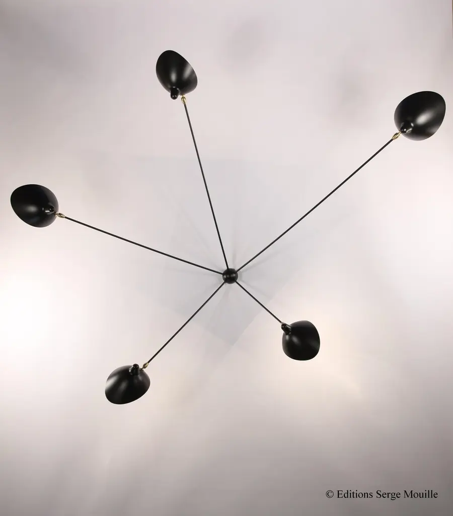 Sconce 5 rotating straight arms by Serge MouilleDimensions: D450 x H150 cmMaterials: Brass, Steel, AluminumOne of a King. Numbered.Also available in different color. All our lamps can be wired according to each country. If sold to the USA it will be wired for the USA for instance.A numbered reissue from 1954, this Serge Mouille wall lamp with 5 pivoting arms is made in France by Éditions Serge Mouille. It is equipped with 5 straight pivoting arms and 5 adjustable aluminum reflectors with a glossy white interior for a pleasant diffusion of the luminous flux. Available in white, this numbered model will be delivered quickly with its certificate of authenticity.Serge MouilleBorn in Paris in 1922, Serge Mouille is today considered one of the greatest lighting designers in the world. He developed a talent for drawing and creation very early on and was the youngest student of his time to be admitted to the School of Applied Arts at the age of 13.Master goldsmith, Serge Mouille learned the art of modeling metal with a hammer thanks to his mentor Gabriel Lacroix and worked for several goldsmith houses in Paris. It was his meeting with Jacques Adnet, director of the Compagnie des arts français, that would mark a turning point in his career.In 1951, Jacques Adnet commissioned Serge Mouille to create a “large light fixture” for his South American customers: the first three-arm floor lamp was born. This innovative luminaire in molded black steel with organic shapes will influence his famous series of "Black Forms" and will forever mark the history of design. Serge Mouille then passes from the status of master craftsman to that of creative artist.At the beginning of the 1960s, Serge Mouille decided to radically distance himself from everything he had created until then by developing a series of light columns with fluorescent tubes. In 1963, he stopped producing lights to devote himself to teaching.Suffering from tuberculosis, Serge Mouille died in 1988 and his widow, Gin Mouille, decided to continue to bring his art to life by publishing under license his most emblematic creations. Each copy is made in France by Éditions Serge Mouille and has an engraved serial number, accompanied by a certificate of authenticity.