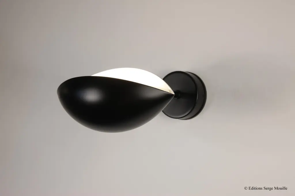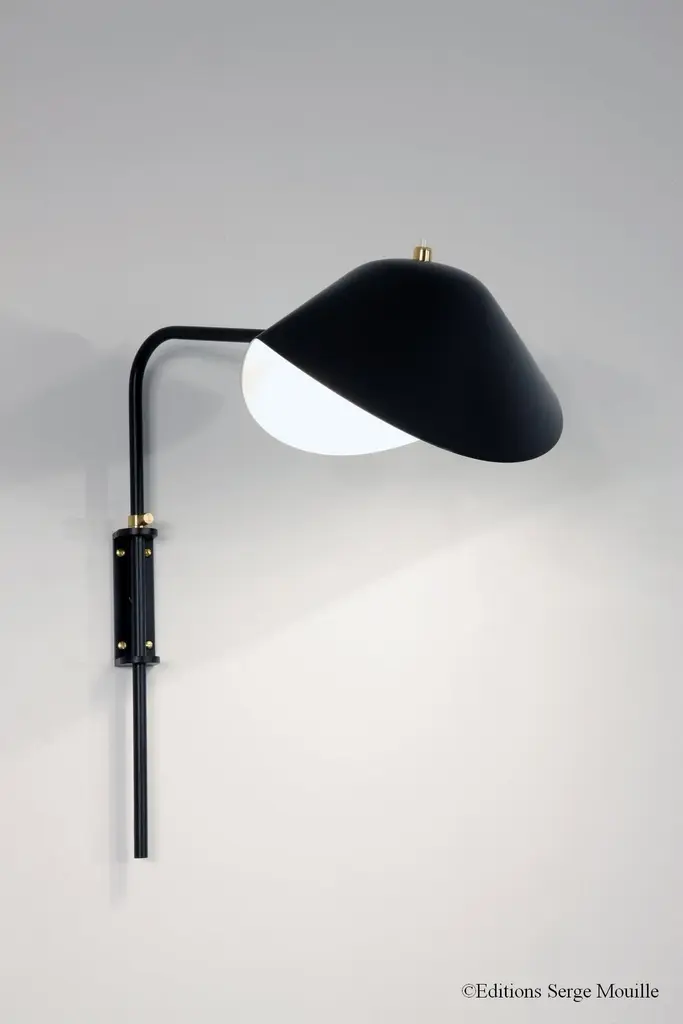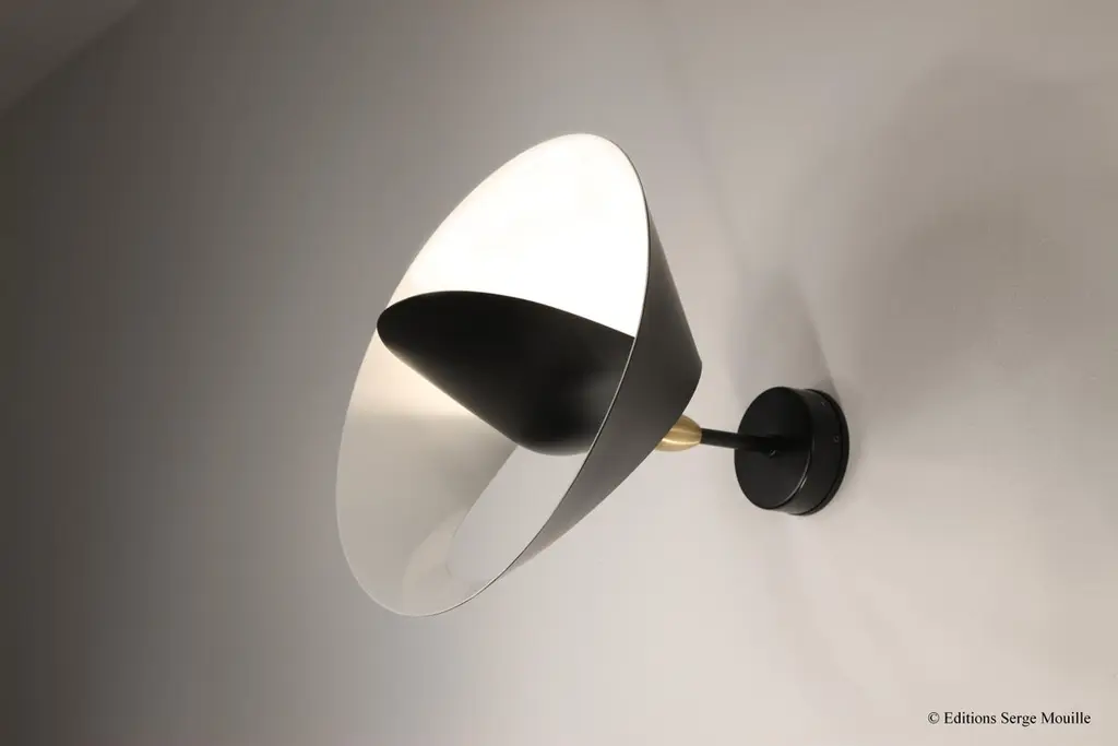Sconce eye by Serge MouilleDimensions: D20 x H26 cm.Materials: brass, steel, aluminiumOne of a King. Numbered.Also available in different colour. All our lamps can be wired according to each country. If sold to the USA it will be wired for the USA for instance.An original design from 1956 made in France by Éditions Serge Mouille, the Œil Serge Mouille wall lamp has been designed with the same integrity as the period models. Featuring an adjustable eye-shaped reflector mounted on a brass ball joint, it is designed to control the direction of the light while diffusing a pleasant flow thanks to its glossy white interior. We assure you a fast delivery for this numbered model with certificate of authenticity. Available in black and white.Serge MouilleBorn in Paris in 1922, Serge Mouille is today considered one of the greatest lighting designers in the world. He developed a talent for drawing and creation very early on and was the youngest student of his time to be admitted to the School of Applied Arts at the age of 13.Master goldsmith, Serge Mouille learned the art of modeling metal with a hammer thanks to his mentor Gabriel Lacroix and worked for several goldsmith houses in Paris. It was his meeting with Jacques Adnet, director of the Compagnie des arts français, that would mark a turning point in his career.In 1951, Jacques Adnet commissioned Serge Mouille to create a “large light fixture” for his South American customers: the first three-arm floor lamp was born. This innovative luminaire in molded black steel with organic shapes will influence his famous series of "Black Forms" and will forever mark the history of design. Serge Mouille then passes from the status of master craftsman to that of creative artist.At the beginning of the 1960s, Serge Mouille decided to radically distance himself from everything he had created until then by developing a series of light columns with fluorescent tubes. In 1963, he stopped producing lights to devote himself to teaching.Suffering from tuberculosis, Serge Mouille died in 1988 and his widow, Gin Mouille, decided to continue to bring his art to life by publishing under license his most emblematic creations. Each copy is made in France by Éditions Serge Mouille and has an engraved serial number, accompanied by a certificate of authenticity.