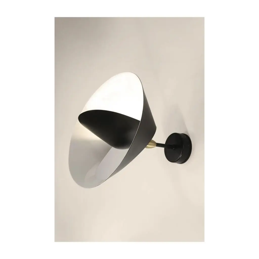 Sconce Saturne by Serge MouilleDimensions: D 30 x H 26 cmMaterials: Brass, steel, aluminiumOne of a King. Numbered.Also available in different colour.All our lamps can be wired according to each country. If sold to the USA it will be wired for the USA for instance.Made in France, the Saturne Serge Mouille wall lamp is a 1957 reissue by Serge Mouille Editions. Featuring a conical black steel body with an adjustable reflector with a glossy white interior on a brass ball joint, it is designed to control the diffusion of light. Also available in white, this model delivered quickly is numbered and accompanied by a certificate of authenticity.Serge MouilleBorn in Paris in 1922, Serge Mouille is today considered one of the greatest lighting designers in the world. He developed a talent for drawing and creation very early on and was the youngest student of his time to be admitted to the School of Applied Arts at the age of 13.Master goldsmith, Serge Mouille learned the art of modeling metal with a Hammer thanks to his mentor Gabriel Lacroix and worked for several goldsmith houses in Paris. It was his meeting with Jacques Adnet, director of the Compagnie des arts français, that would mark a turning point in his career.In 1951, Jacques Adnet commissioned Serge Mouille to create a “large light fixture” for his South American customers: the first three-arm floor lamp was born. This innovative Luminaire in molded black steel with organic shapes will influence his famous series of "Black Forms" and will forever mark the history of design. Serge Mouille then passes from the status of master craftsman to that of creative artist.At the beginning of the 1960s, Serge Mouille decided to radically distance himself from everything he had created until then by developing a series of light columns with fluorescent tubes. In 1963, he stopped producing lights to devote himself to teaching.Suffering from tuberculosis, Serge Mouille died in 1988 and his widow, Gin Mouille, decided to continue to bring his art to life by publishing under license his most emblematic creations. Each copy is made in France by Éditions Serge Mouille and has an engraved serial number, accompanied by a certificate of authenticity.