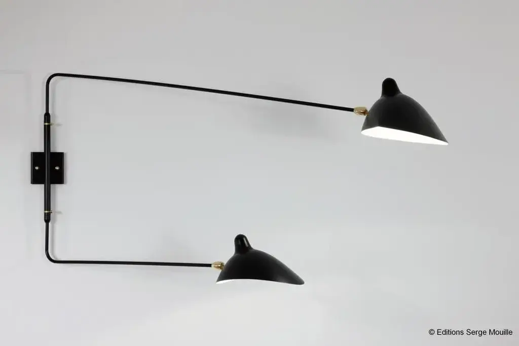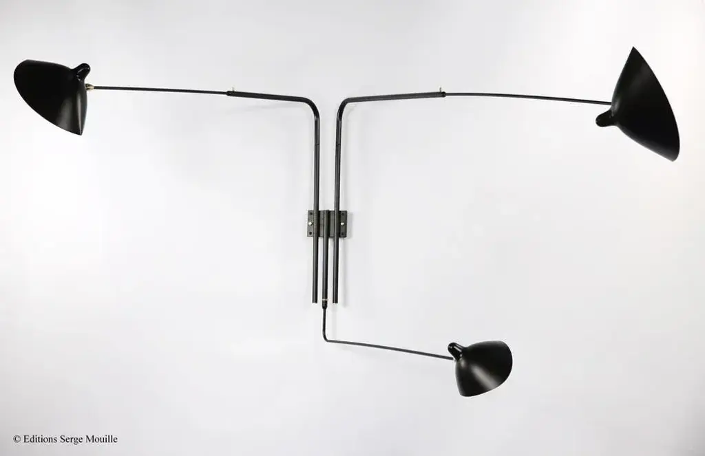 Sconce 4 rotating straight arms by serge mouille dimensions: d466 x h165 cm materials: brass, steel, aluminium one of a king. Numbered. Also available in different colour. All our lamps can be wired according to each country. If sold to the usa it will be wired for the usa for instance. Authentic reissue of a 1954 light, the serge mouille wall lamp with 4 pivoting arms is made in france by éditions serge mouille. Designed to control the direction of the light, it has 4 pivoting black steel rods and repositionable aluminum reflectors. Available in white, this numbered model will be delivered as soon as possible, accompanied by a certificate of authenticity. Serge mouille born in paris in 1922, serge mouille is today considered one of the greatest lighting designers in the world. He developed a talent for drawing and creation very early on and was the youngest student of his time to be admitted to the school of applied arts at the age of 13. Master goldsmith, serge mouille learned the art of modeling metal with a hammer thanks to his mentor gabriel lacroix and worked for several goldsmith houses in paris. It was his meeting with jacques adnet, director of the compagnie des arts français, that would mark a turning point in his career. In 1951, jacques adnet commissioned serge mouille to create a “large light fixture” for his south american customers: the first three-arm floor lamp was born. This innovative luminaire in molded black steel with organic shapes will influence his famous series of "black forms" and will forever mark the history of design. Serge mouille then passes from the status of master craftsman to that of creative artist. At the beginning of the 1960s, serge mouille decided to radically distance himself from everything he had created until then by developing a series of light columns with fluorescent tubes. In 1963, he stopped producing lights to devote himself to teaching. Suffering from tuberculosis, serge mouille died in 1988 and his widow, gin mouille, decided to continue to bring his art to life by publishing under license his most emblematic creations. Each copy is made in france by éditions serge mouille and has an engraved serial number, accompanied by a certificate of authenticity. up to 250v (europe/uk standard).