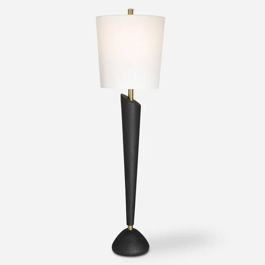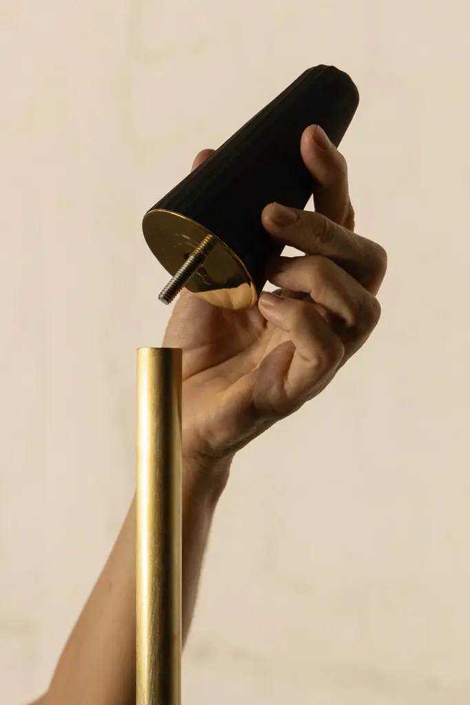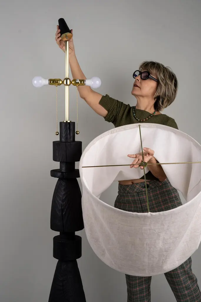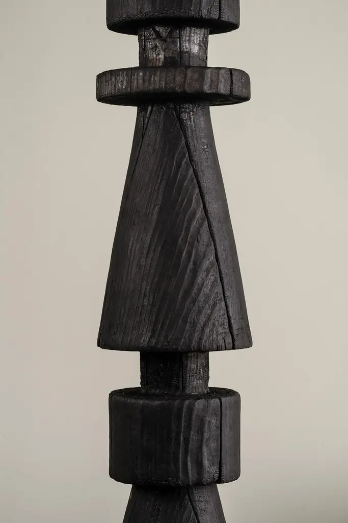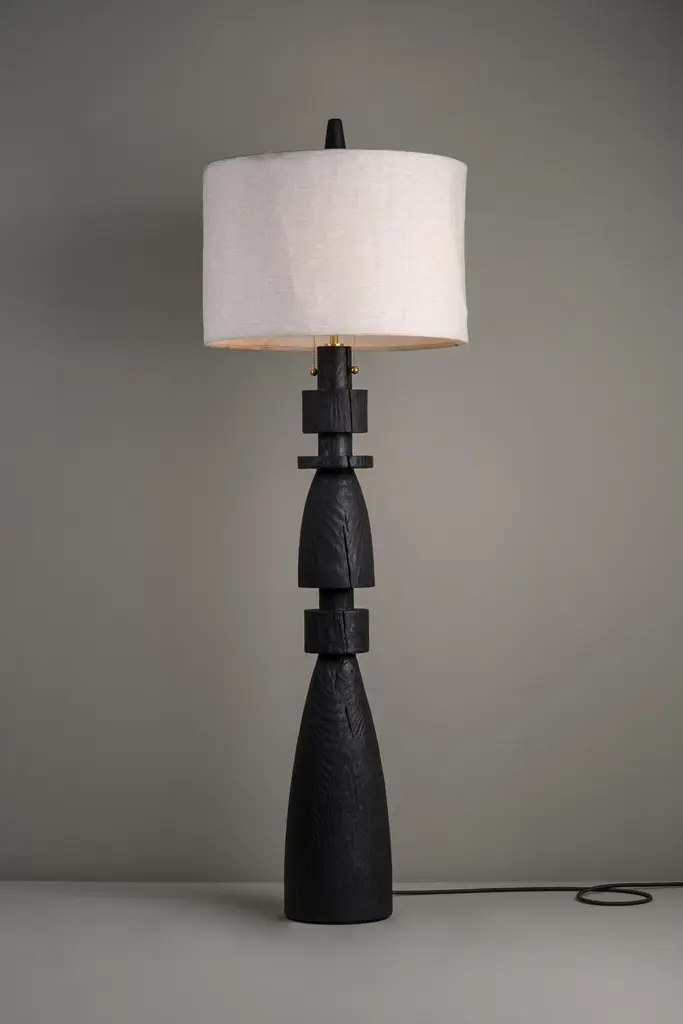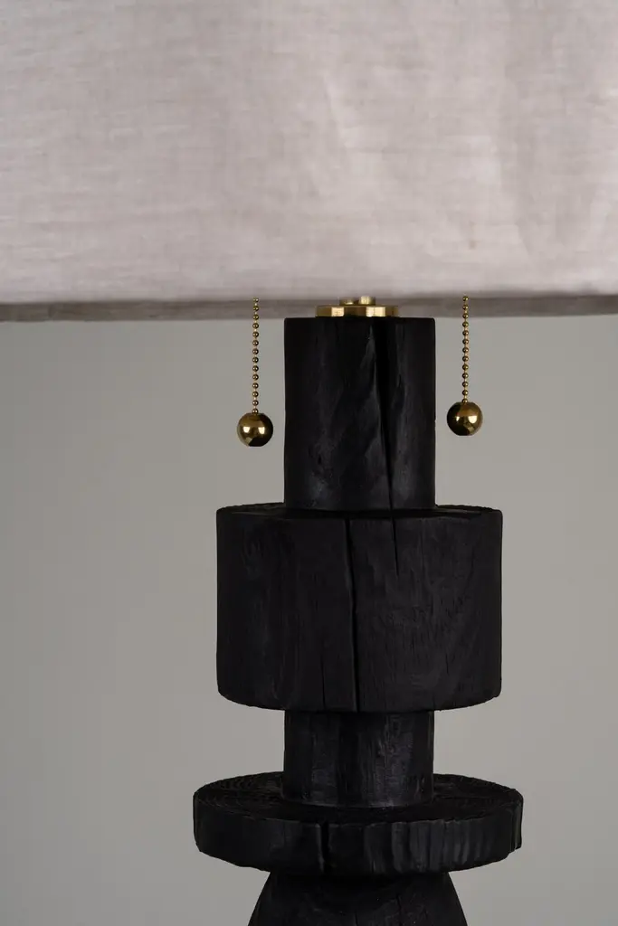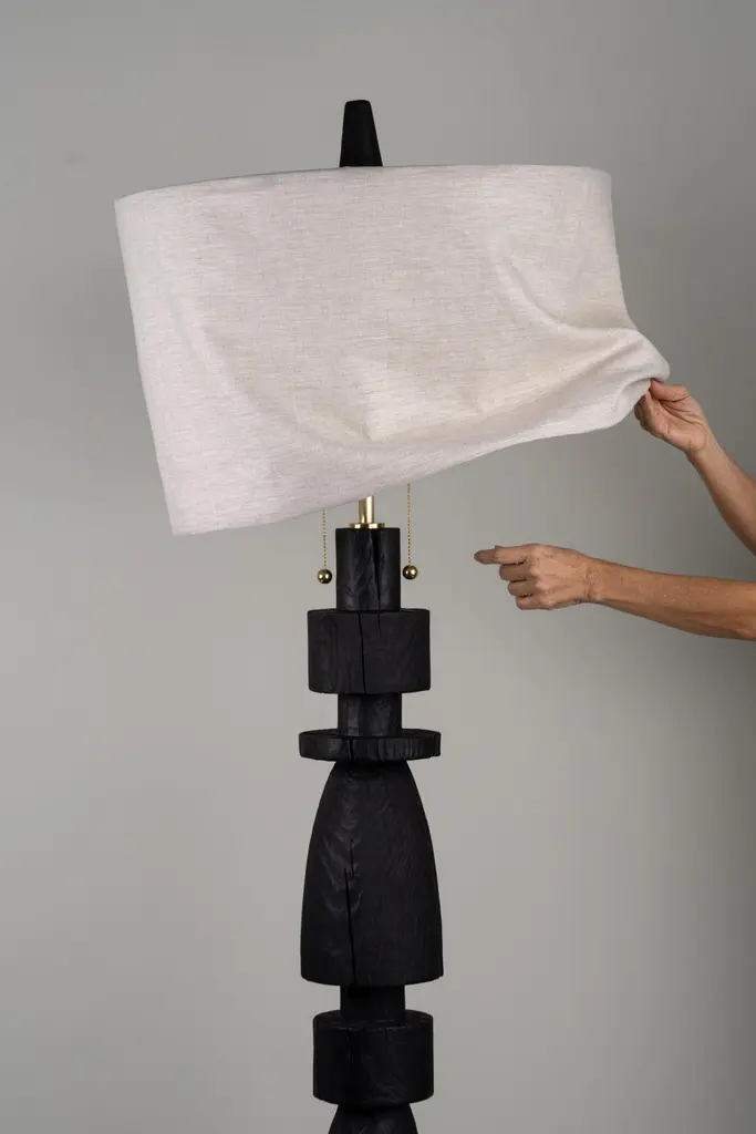 MEZQUITE (LARGE) floor lamp was designed for the De Palo collection by Mexican artist Isabel Moncada.Like a chess bishop, Mezquite makes its presence felt in a resounding manner. It has a sturdy wood base, its dark finish gives great character and its edges are embossed when burned with the Japanese Shou Sugi Ban technique. It uses a low-watt LED light that lasts up to 18 years and saves 90% of energy consumption.Turned pinewood base with burnt finish and flexible lampshade made with natural linen fabric. The linen shade can be disassembled to be dry-cleaned and can be steamed to remove wrinkles.All of Isabel Moncada's lighting is UL (Underwriters Laboratories) certified, which ensures a high standard of safety and quality.Light Source: E 27 LED 2700K 11W 110-240V 700 lm. Warm light.Indoor use only.PRIORITY ORDERS UPON REQUEST.Bio:Isabel Moncada is a Mexican designer and artist who specializes in the design of lighting and utilitarian art made in her own workshop in Mexico. Through exploring and finessing traditional manufacturing techniques, Isabel has developed her own mechanisms and transformed materials to develop her designs and engrave her personal style.