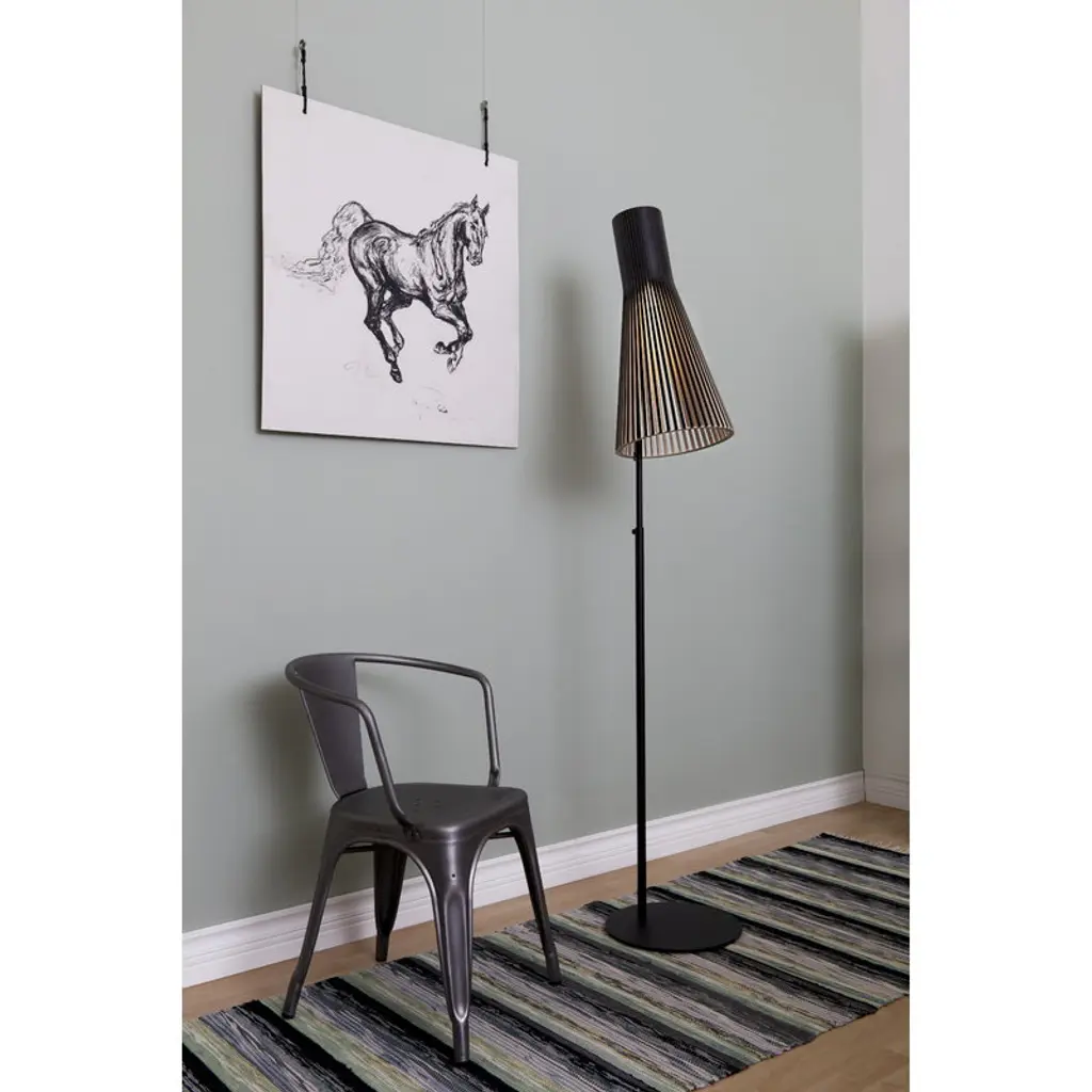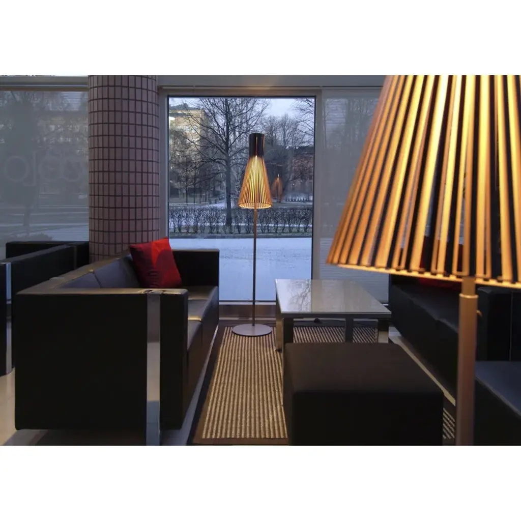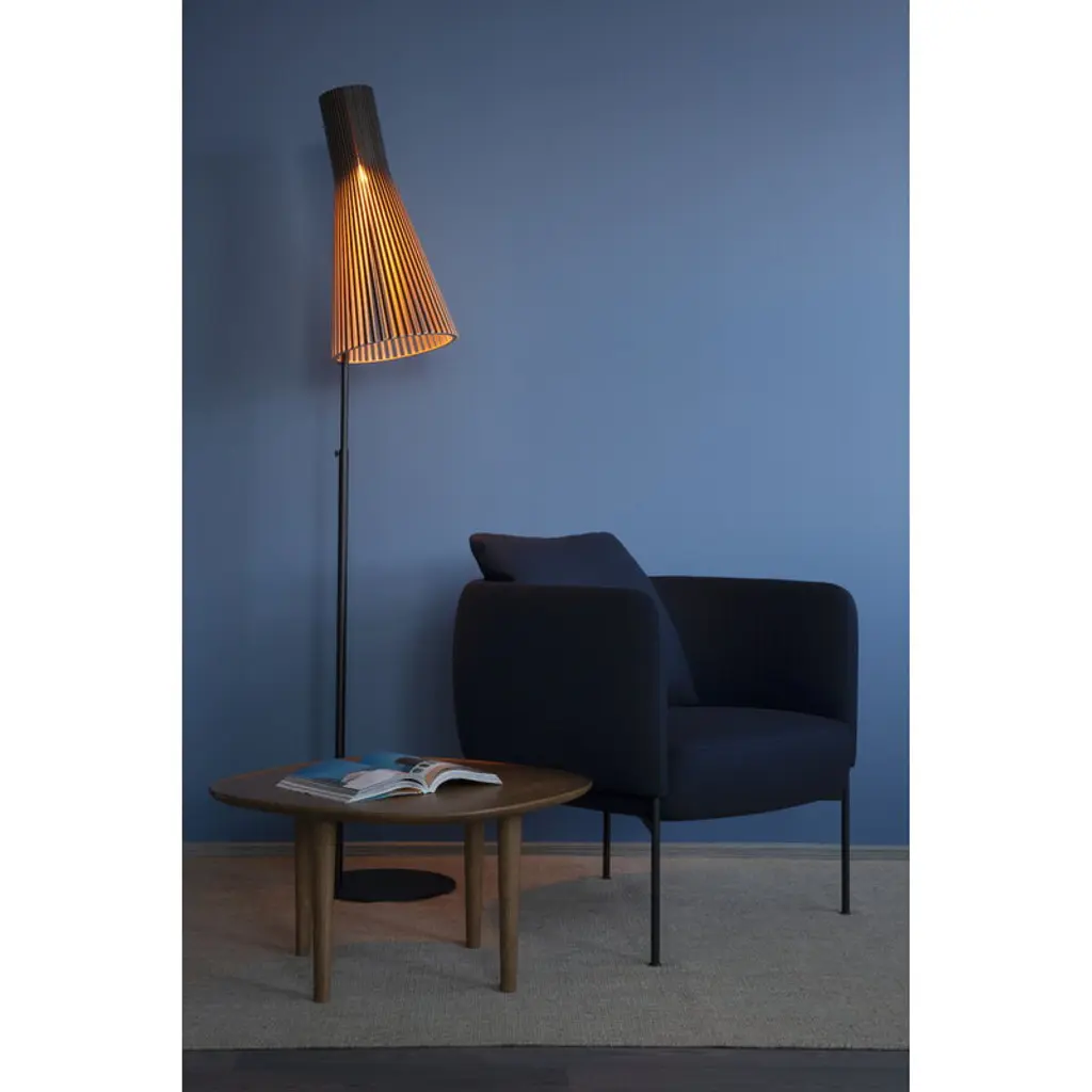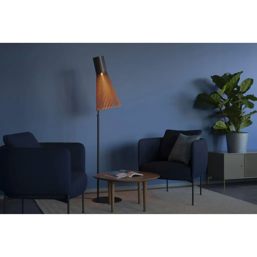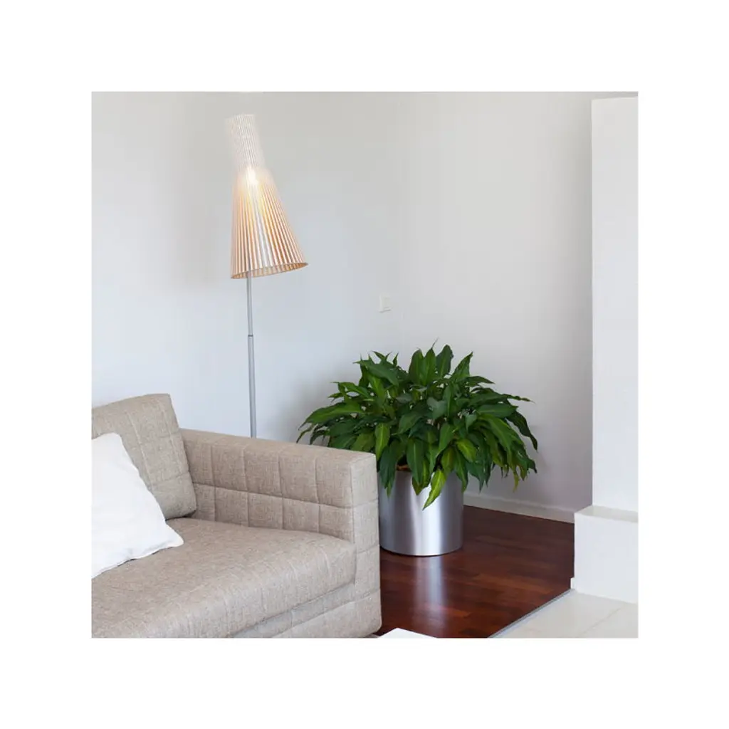 Secto 4210 is an elegant floor lamp with a slatted, wooden shade that fills the space with gentle light. The adjustable leg makes Secto 4210 a perfect companion for an armchair or desk. Secto Design luminaires are handmade in Finland from form-pressed Finnish birch. The lamps have clean Scandinavian silhouettes, and the wooden surface gives them a warm and appealing character. Secto lamps are designed by architect Seppo Koho who wanted to develop a softly filtering light that doesn’t dazzle but invites people to come closer. Secto lamps emphasize space and environment by creating a unique atmosphere and feeling of closeness.