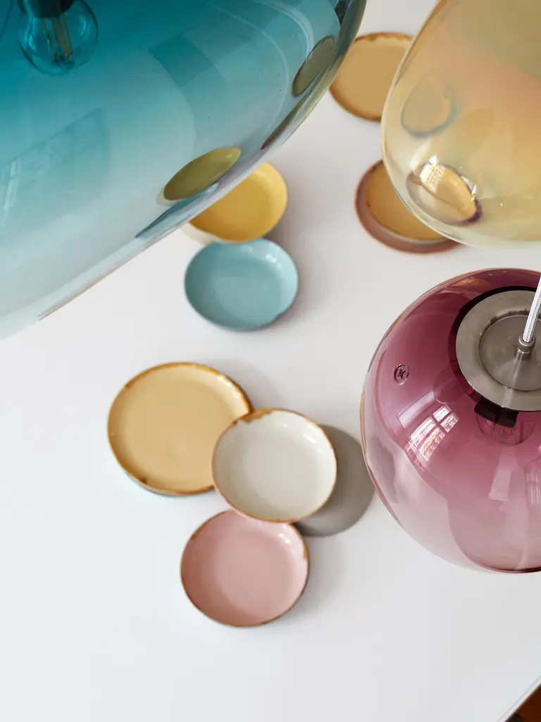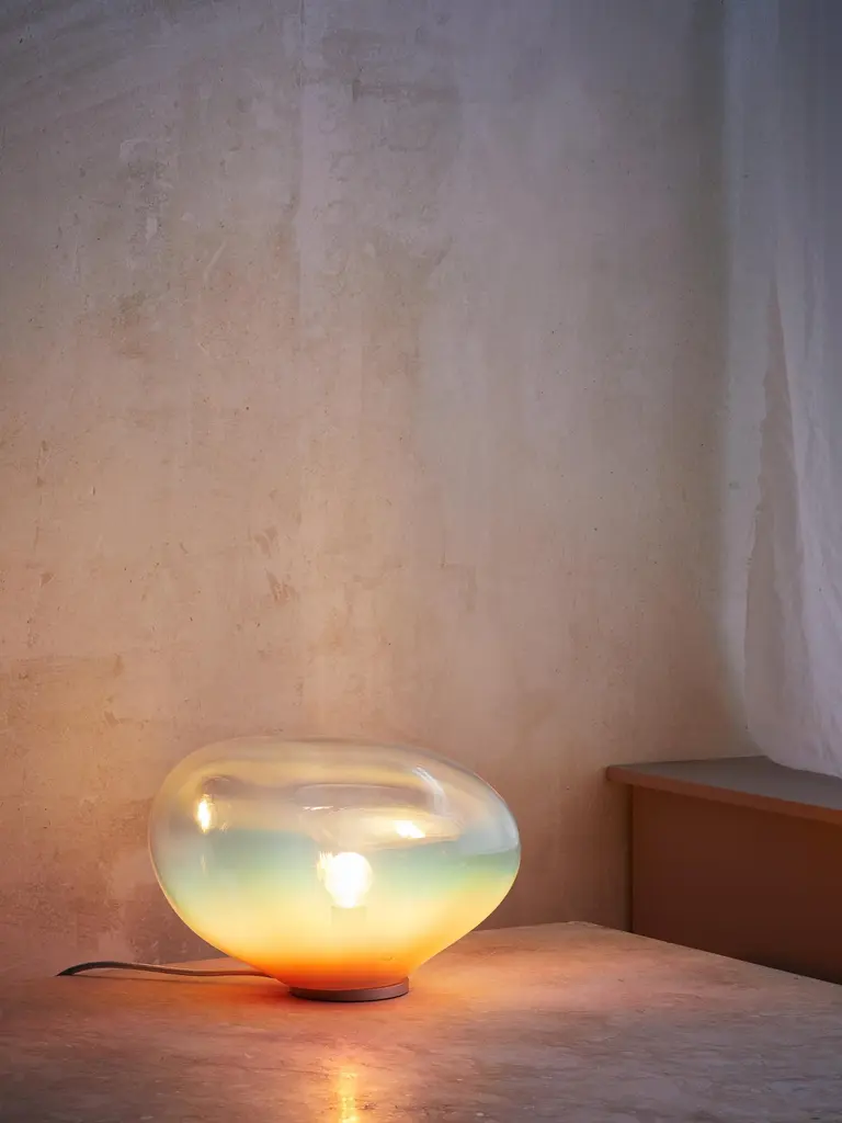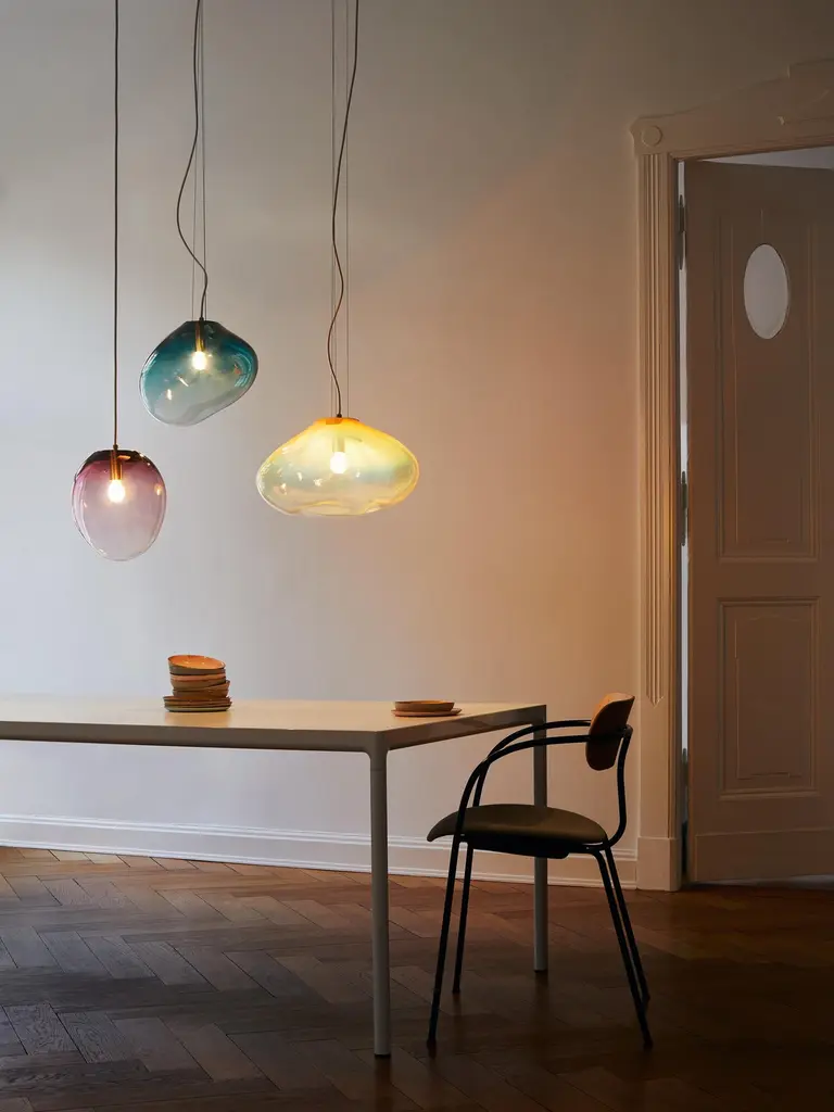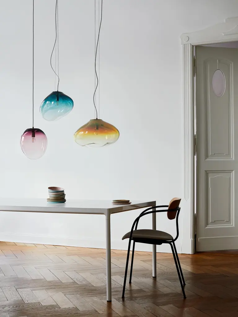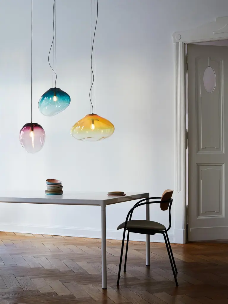 Solitary or in constellation, these lights create individual light concepts and associate with star constellations. Each glass piece is named after a star or a planet. They exist as hanging, floor, standing and wall luminaries.The creator combines the craft of ancient glassblowing with a simple, yet distinct design. In order to achieve the large size of the glass objects and working without forms, it takes a high level of refined craftsmanship and skill performed by only a few master glassblowers.Sedna is shaped naturally amorph, balanced, peaceful, and harmonious, helping it to become one with the room while levitating in the space. The brilliance of crystal blends down softly into gradients of color, which can seem wonderful soothingly and balancing. The integrity of the blown glass gives it the flexibility of looking beautiful anywhere, whether used as a table piece or as a pendant lamp.Available in different size, colours and finishings: see every product page and pick up your favourite!