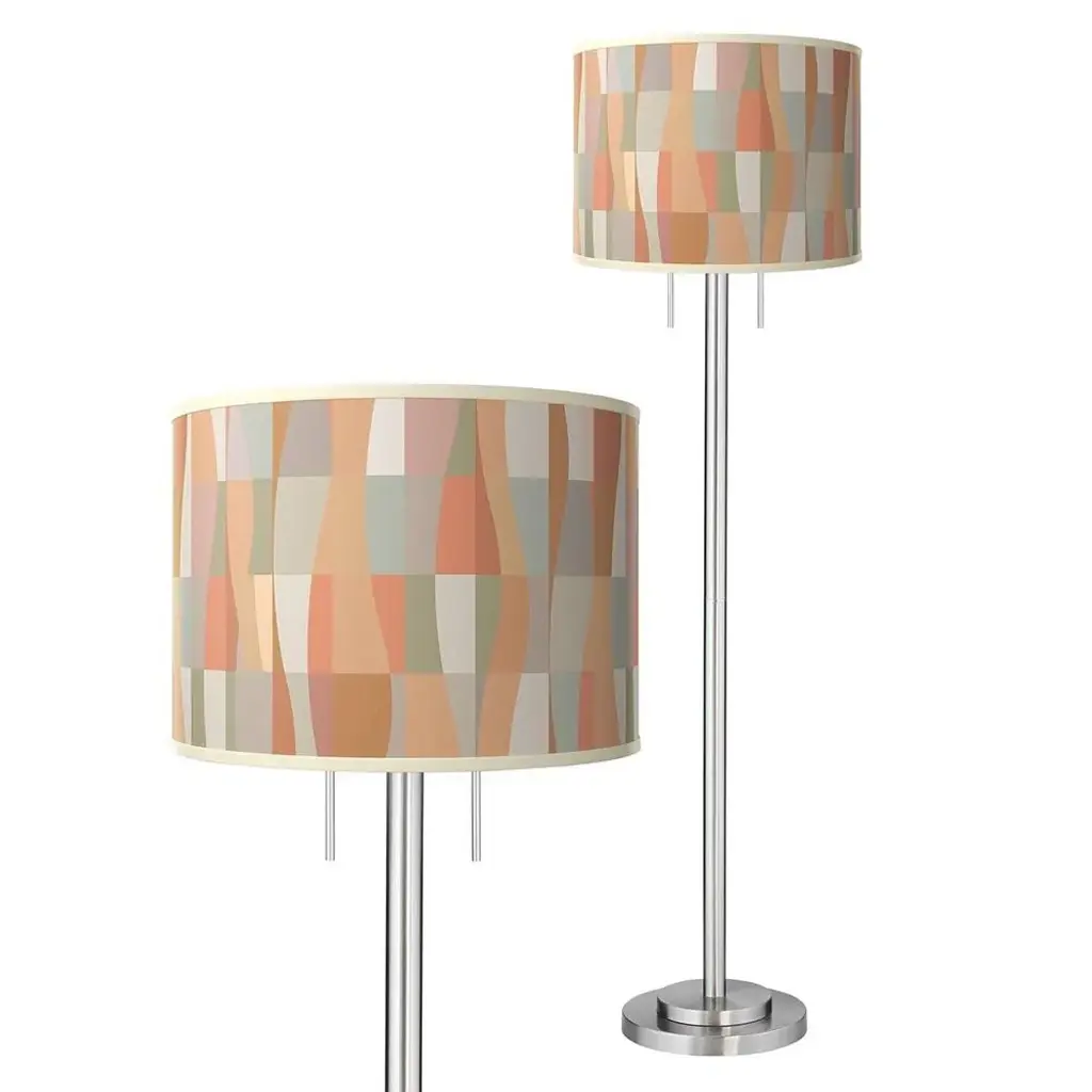 PRODUCT DETAILS: Overall: 63" high. Shade is 18" wide x 12 3/4" high. Base is 12" wide. Takes two maximum 100 watt bulbs (not included). Pull chain switches. Sleek contemporary floor lamp. Custom made-to-order drum shade with Sedona giclee printed pattern. Brushed nickel finish over metal construction. DESCRIPTION: The Garth brushed nickel finish floor lamp takes a simple base design and pairs it with a striking printed drum shade for a burst of style. The shade design is custom made-to-order and features an exclusive Sedona pattern